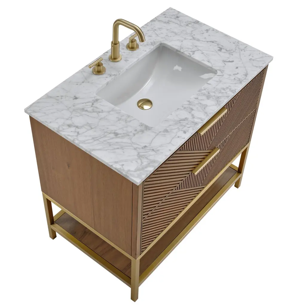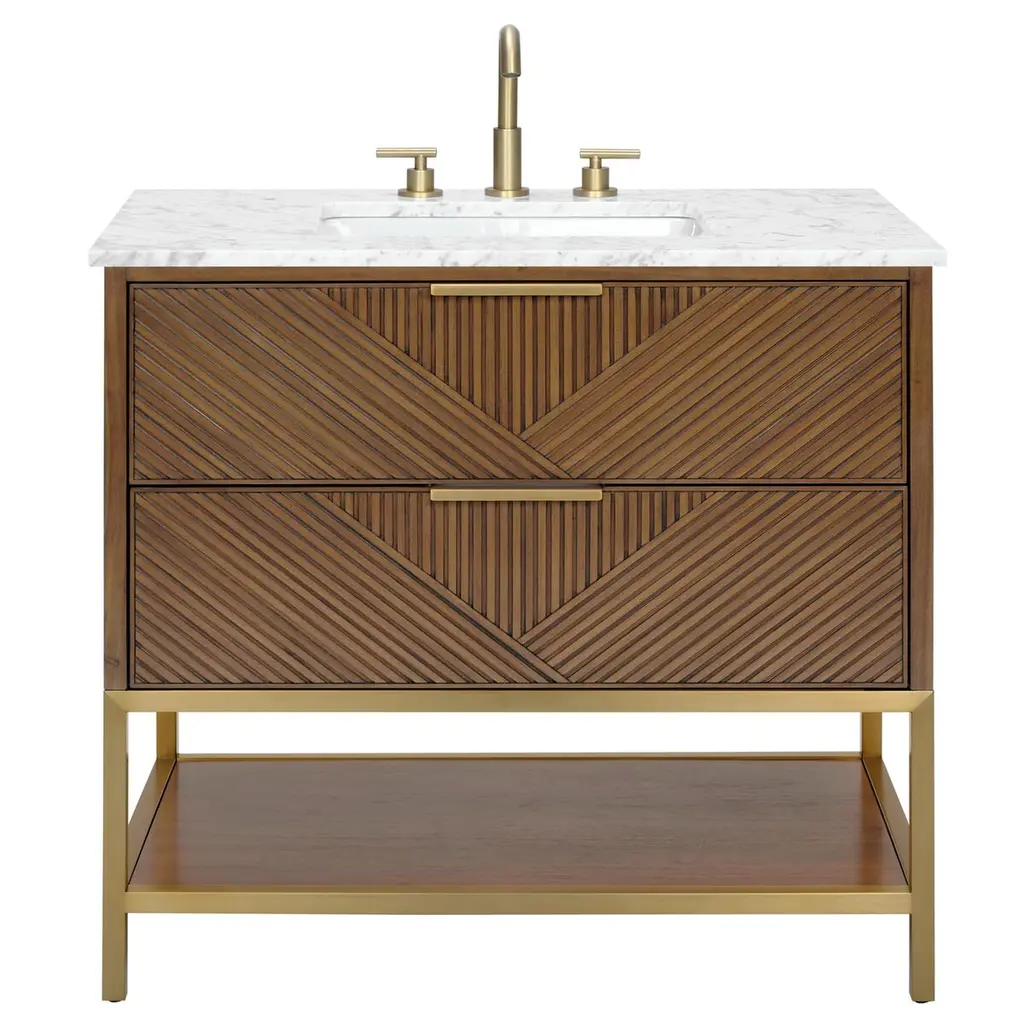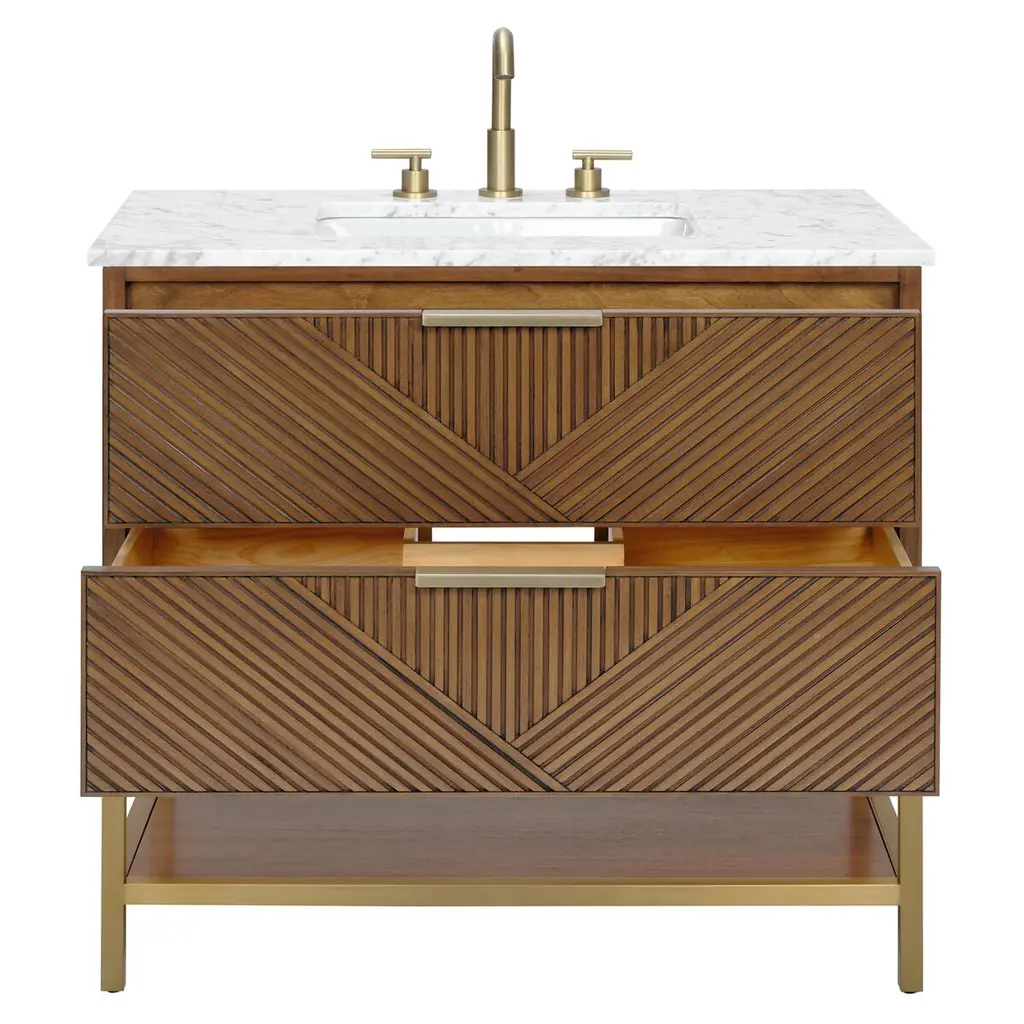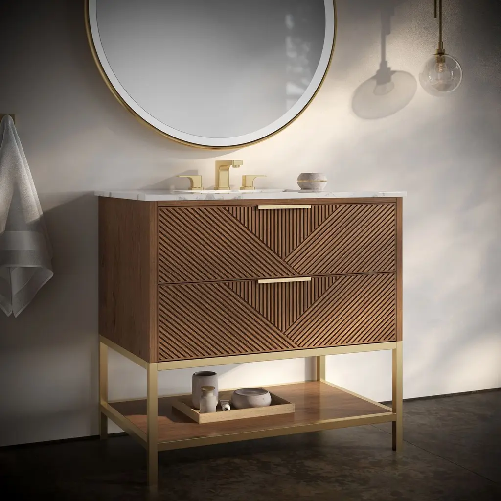 The Diamond 36" Bath Vanity is a showstopper that embodies a design lover's dream. Its dynamic diagonals atop the drawer faces create a striking faceted design, while the handles on each drawer add a touch of refined elegance and style. An open shelf at the base elevates the vanity, fostering a sense of openness and providing a convenient spot to store towels or essentials. Available in a variety of finishes, the Diamond vanity is a statement piece that is sure to capture attention and elevate any bathroom space. (Faucet not included)