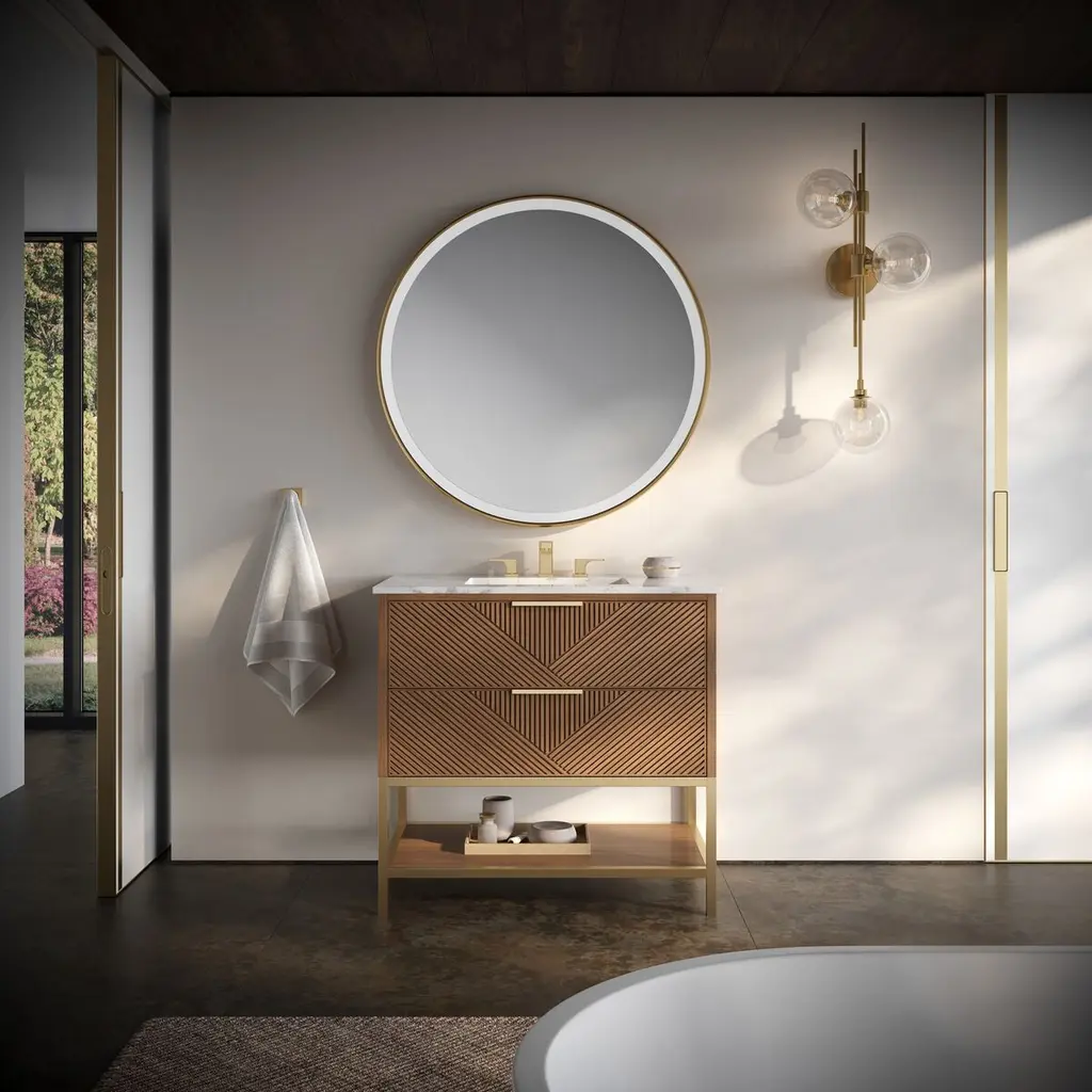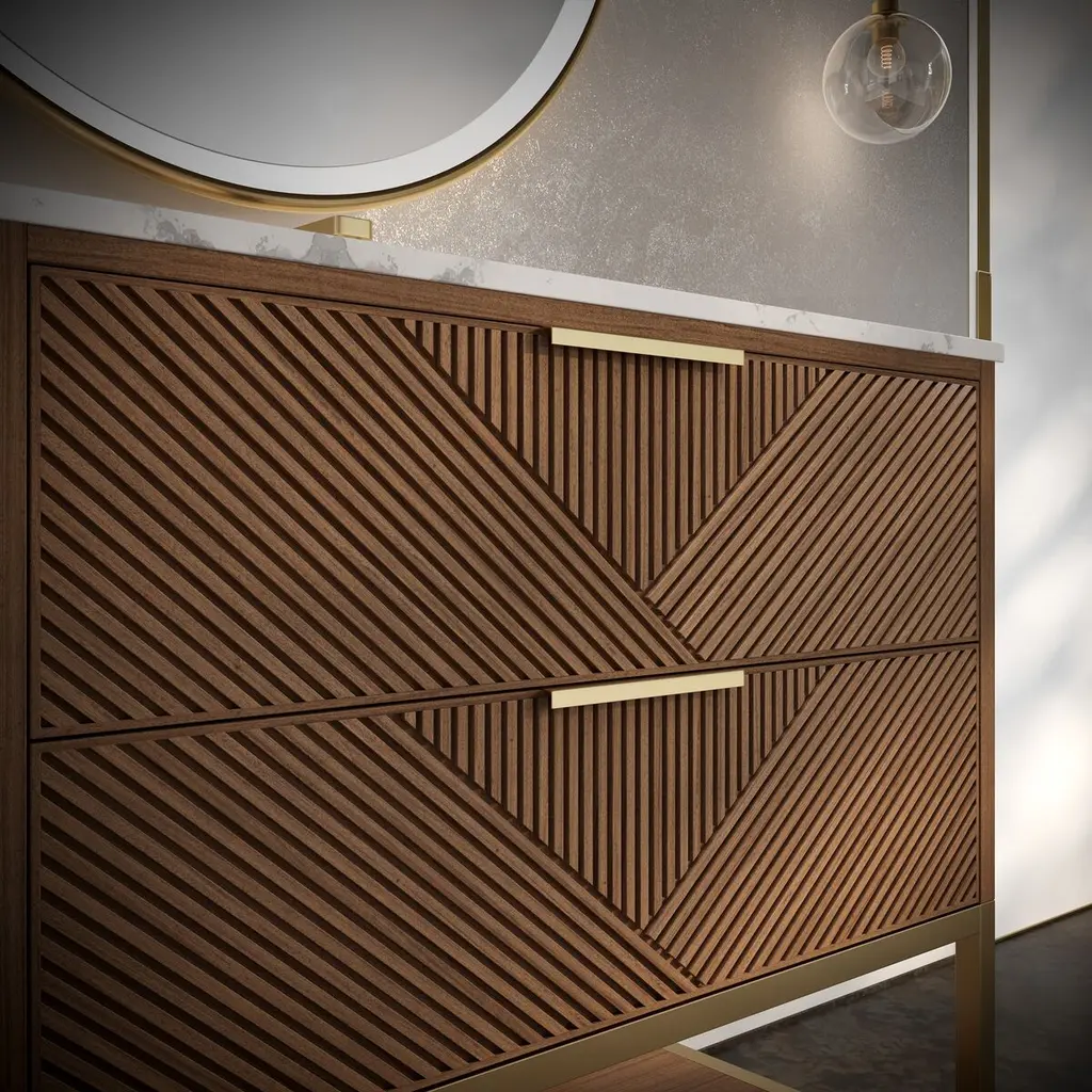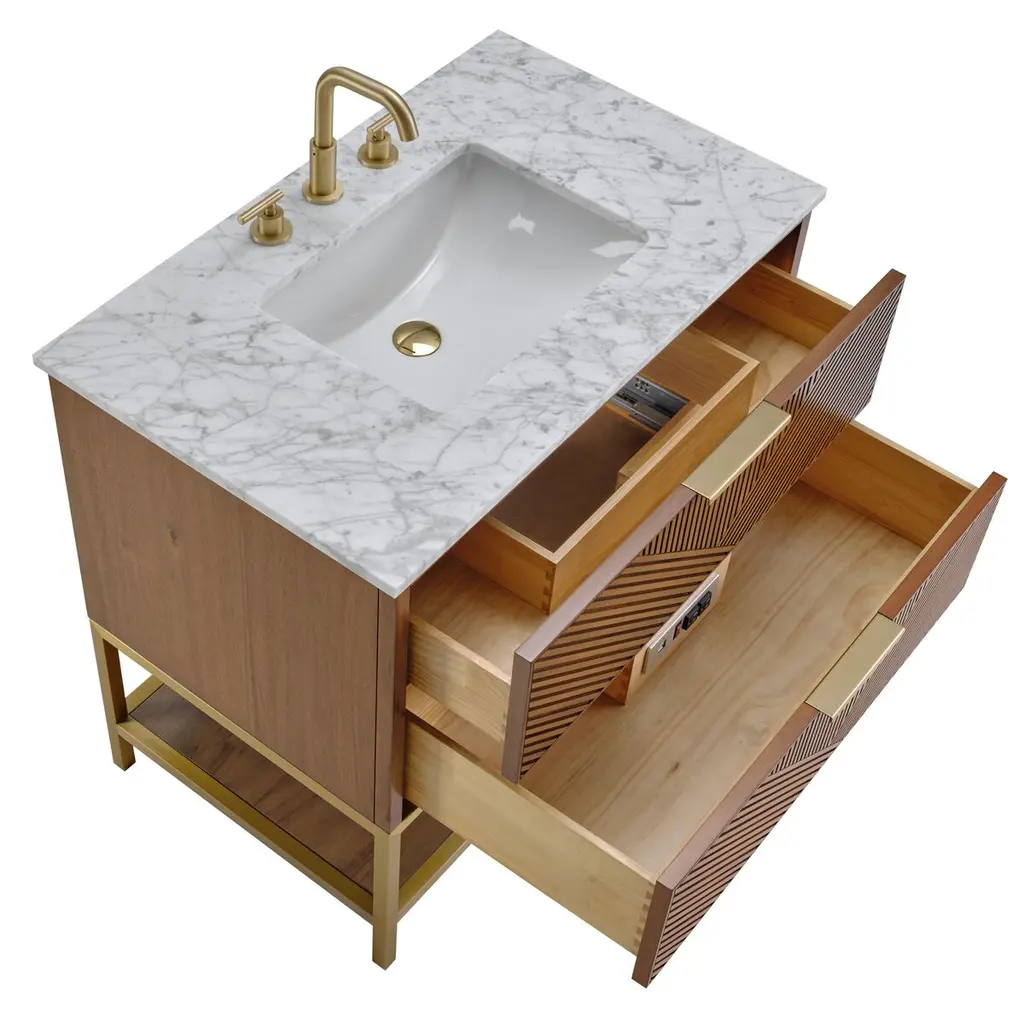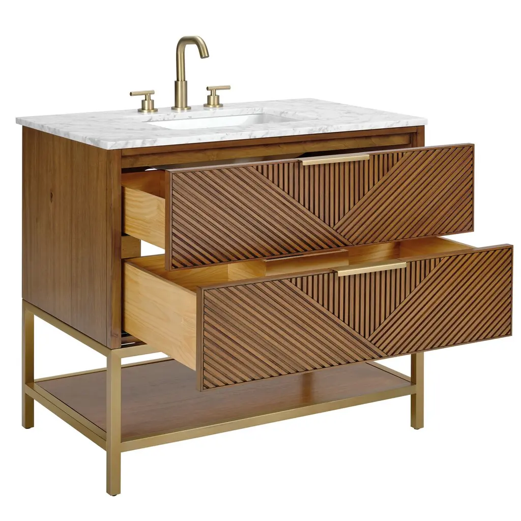 The Diamond 36" Bath Vanity is a showstopper that embodies a design lover's dream. Its dynamic diagonals atop the drawer faces create a striking faceted design, while the handles on each drawer add a touch of refined elegance and style. An open shelf at the base elevates the vanity, fostering a sense of openness and providing a convenient spot to store towels or essentials. Available in a variety of finishes, the Diamond vanity is a statement piece that is sure to capture attention and elevate any bathroom space. (Faucet not included)