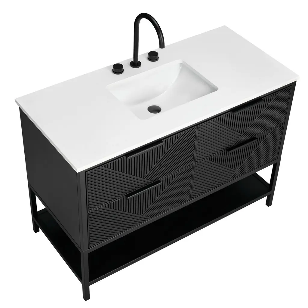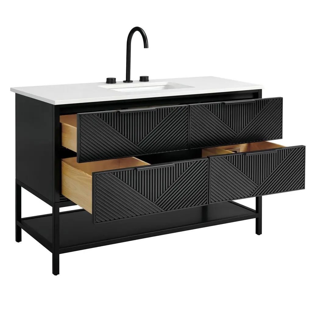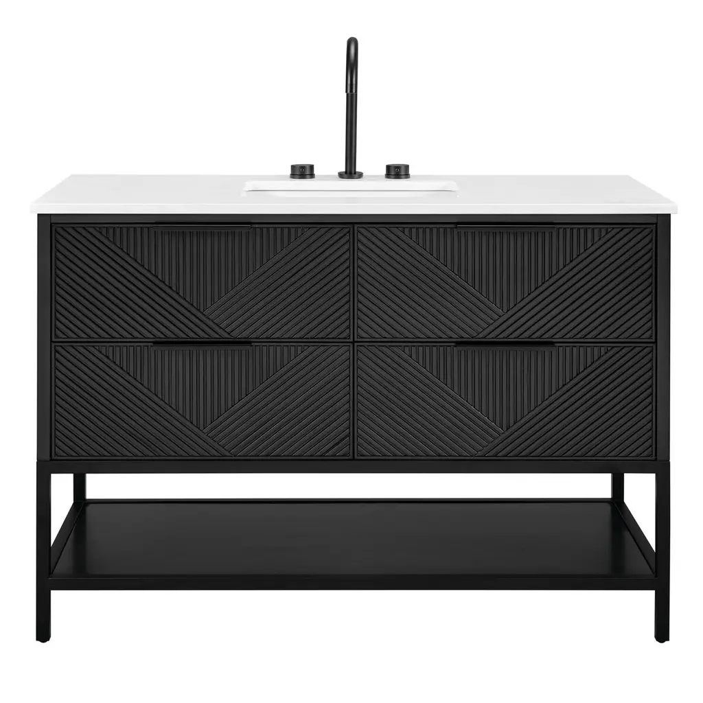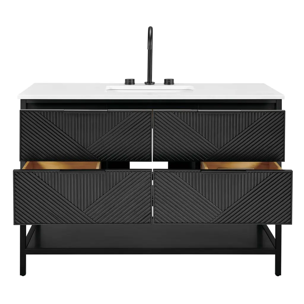 The Diamond 48" Bath Vanity is a showstopper that embodies a design lover's dream. Its dynamic diagonals atop the drawer faces create a striking faceted design, while the handles on each drawer add a subtle touch of refined elegance and style. An open shelf at the base not only elevates the vanity but also creates a sense of openness, offering a convenient spot to store towels or essentials. Available in a variety of finishes, the Diamond vanity is a statement piece that is sure to capture attention and enhance any bathroom space. (Faucet not included)