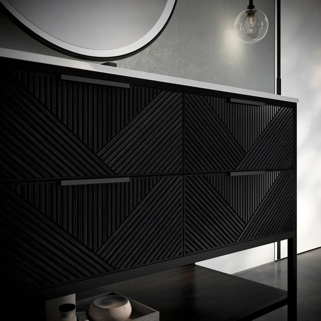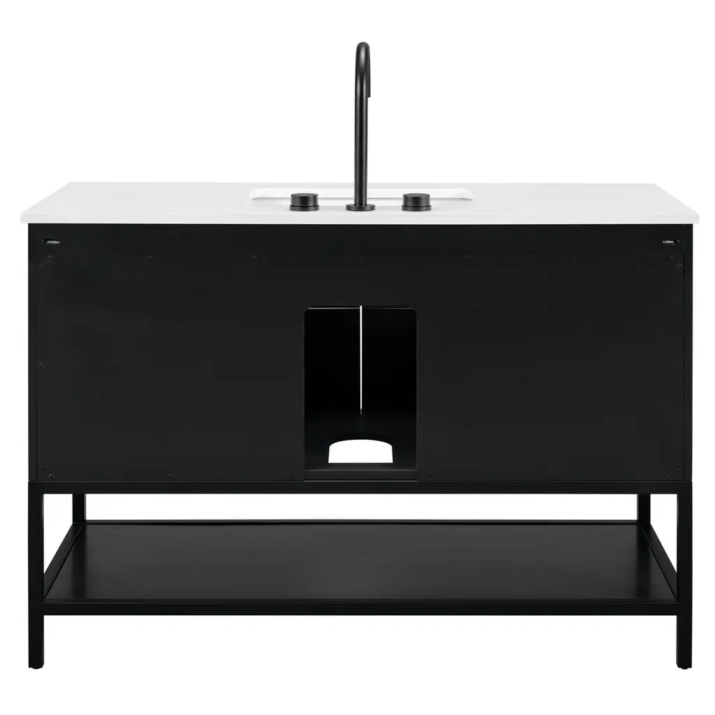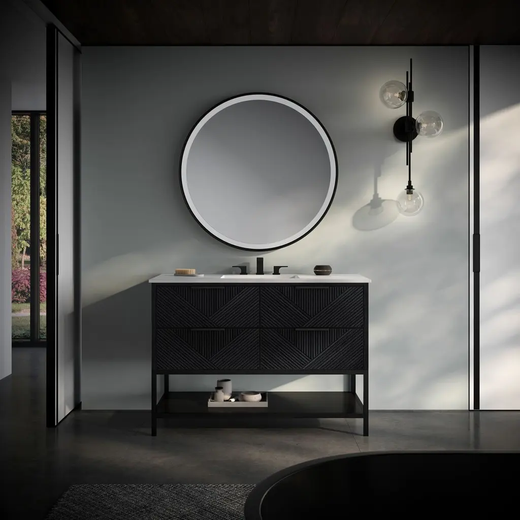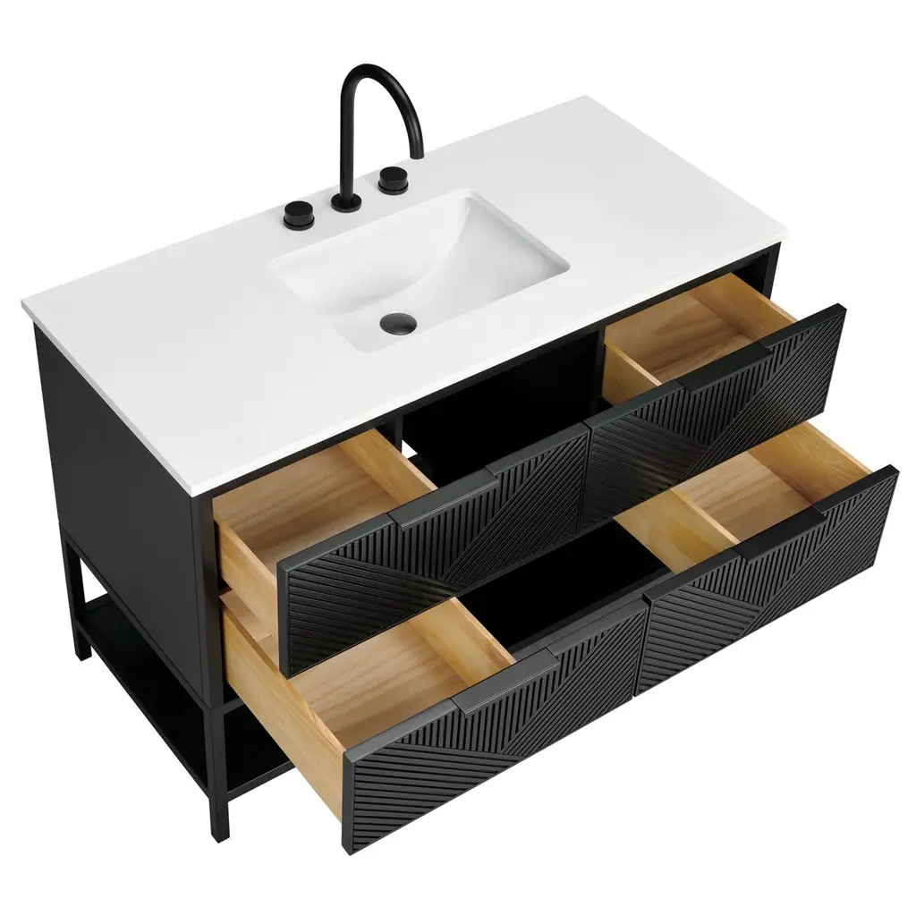The Diamond 48" Bath Vanity is a showstopper that embodies a design lover's dream. Its dynamic diagonals atop the drawer faces create a striking faceted design, while the handles on each drawer add a subtle touch of refined elegance and style. An open shelf at the base not only elevates the vanity but also creates a sense of openness, offering a convenient spot to store towels or essentials. Available in a variety of finishes, the Diamond vanity is a statement piece that is sure to capture attention and enhance any bathroom space. (Faucet not included)