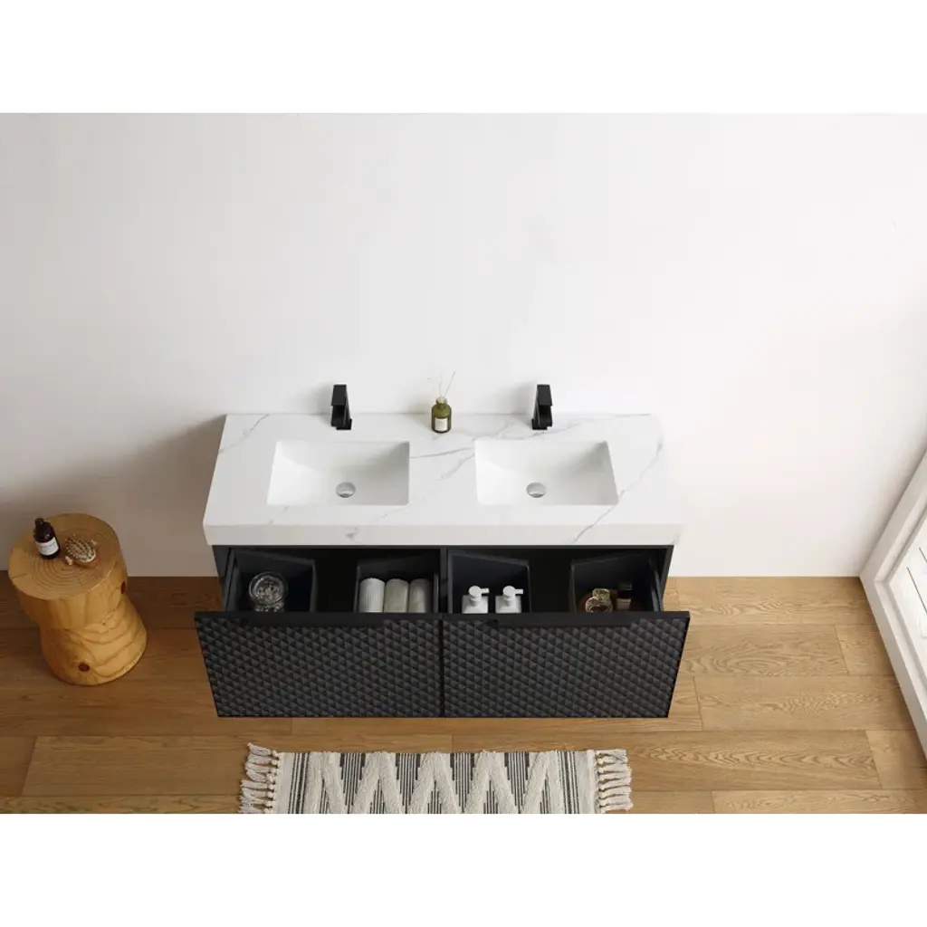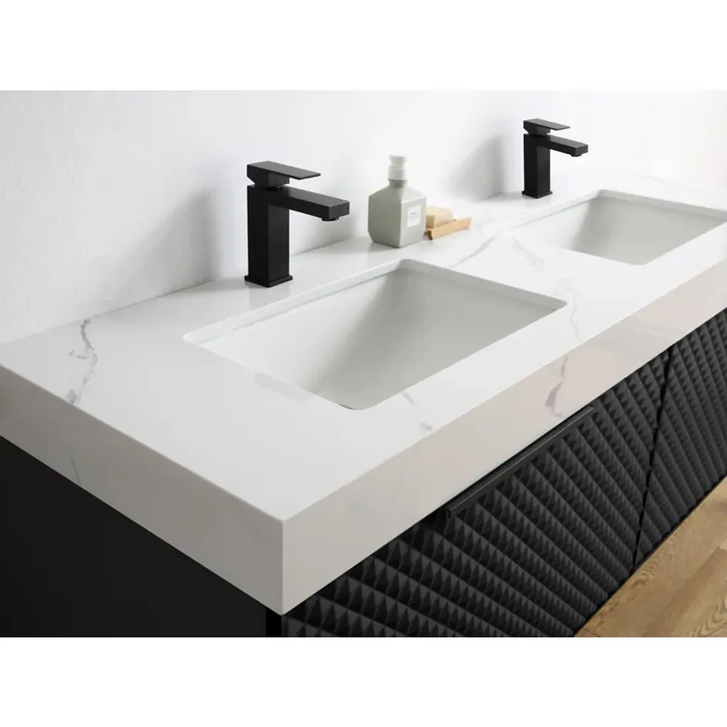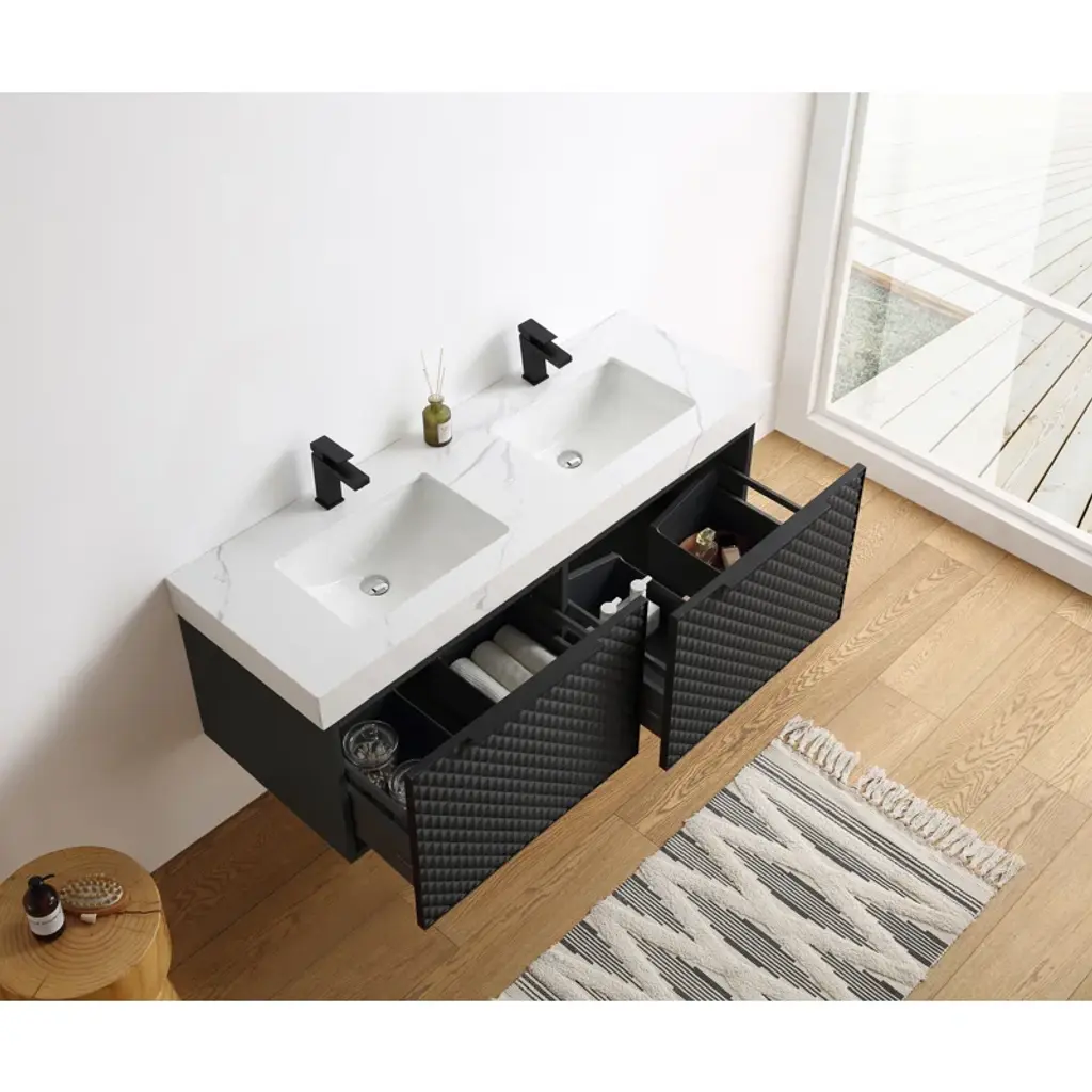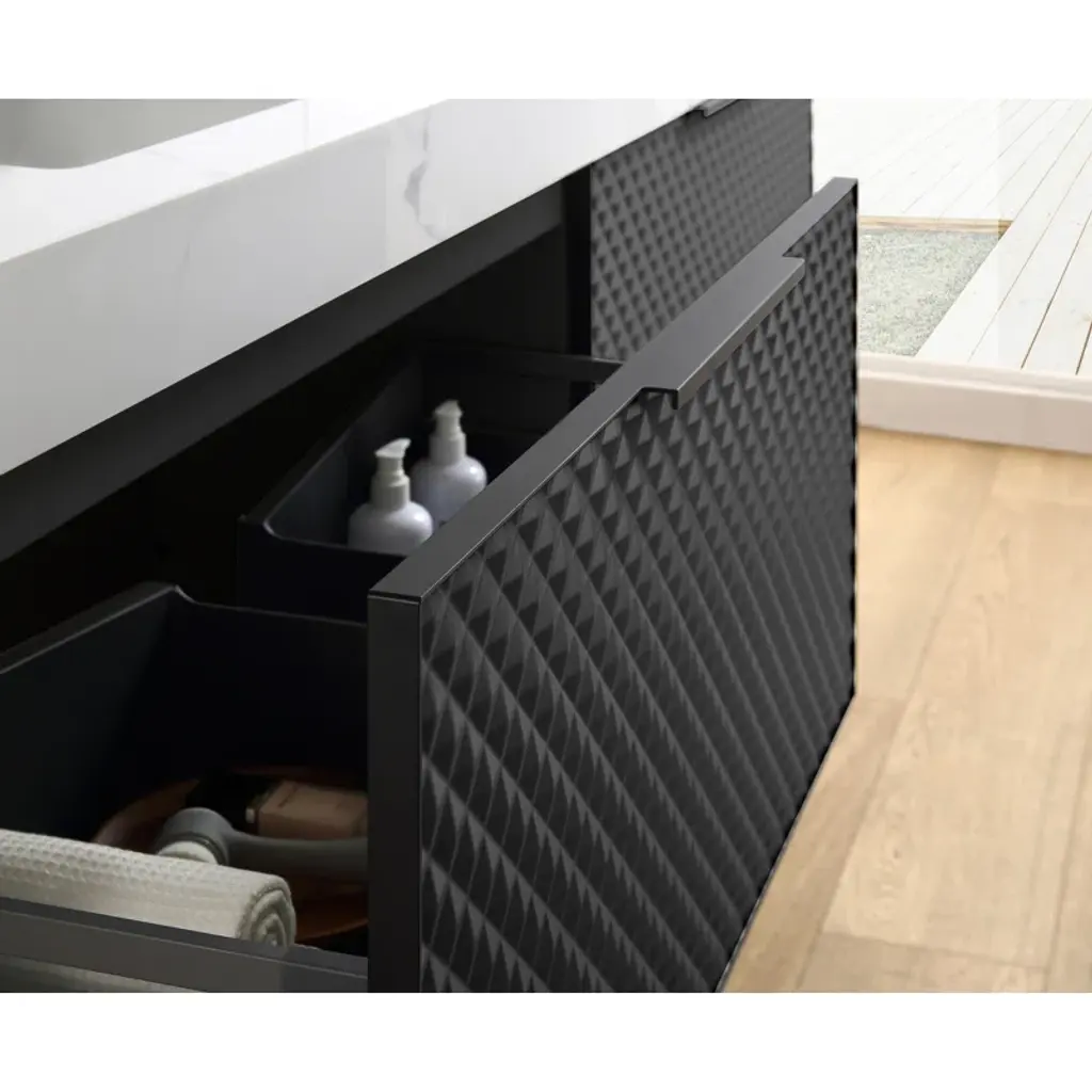 The unique geometric pattern adds texture and dimension to the elegantly designed piece. Two spacious, soft-closing drawers open to reveal ample storage space for your bath essentials. Minimalist handles and a thick, luxurious countertop add the perfect finishing touches. This vanity combines contemporary style and engaging texture to create a high-quality bath experience.