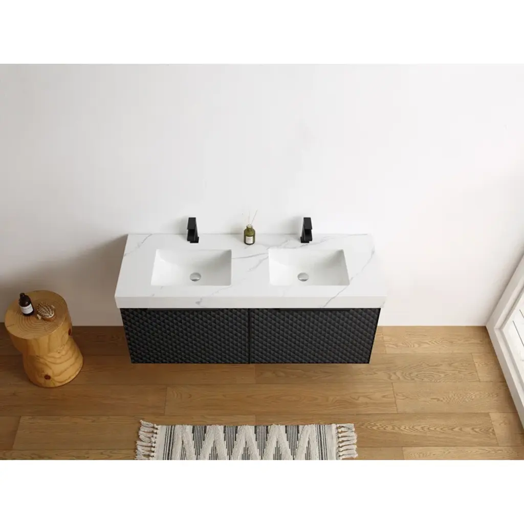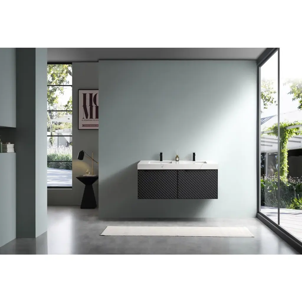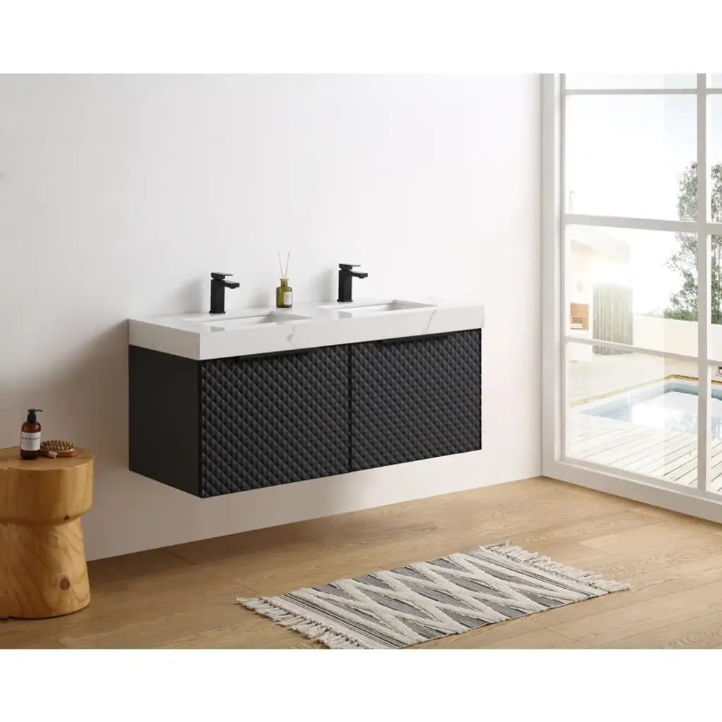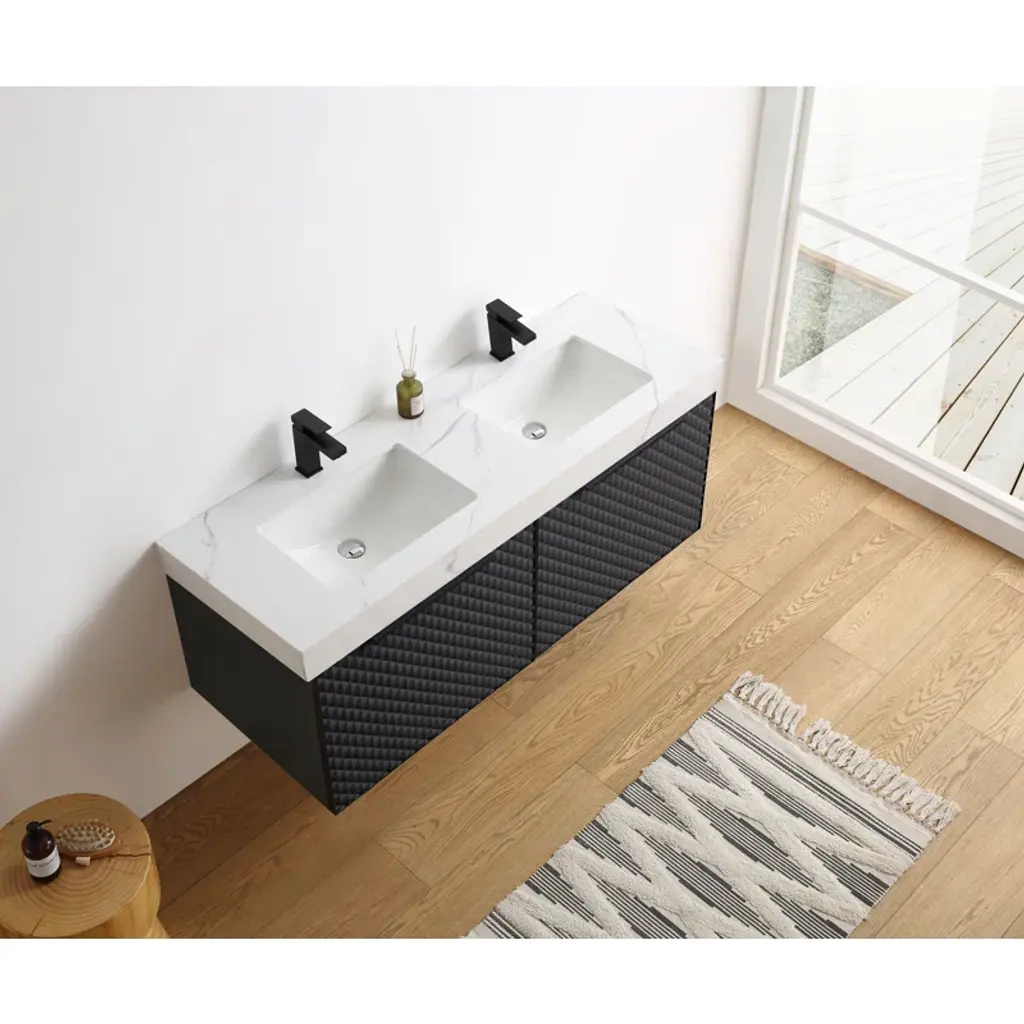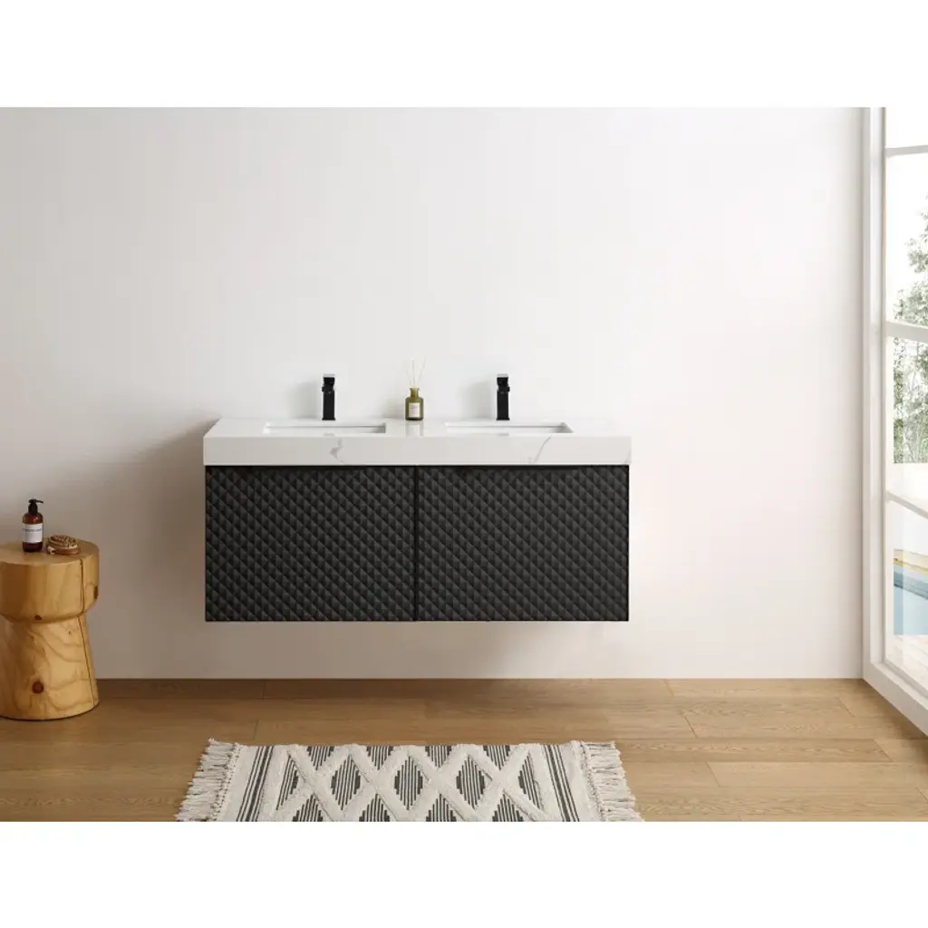 The unique geometric pattern adds texture and dimension to the elegantly designed piece. Two spacious, soft-closing drawers open to reveal ample storage space for your bath essentials. Minimalist handles and a thick, luxurious countertop add the perfect finishing touches. This vanity combines contemporary style and engaging texture to create a high-quality bath experience.