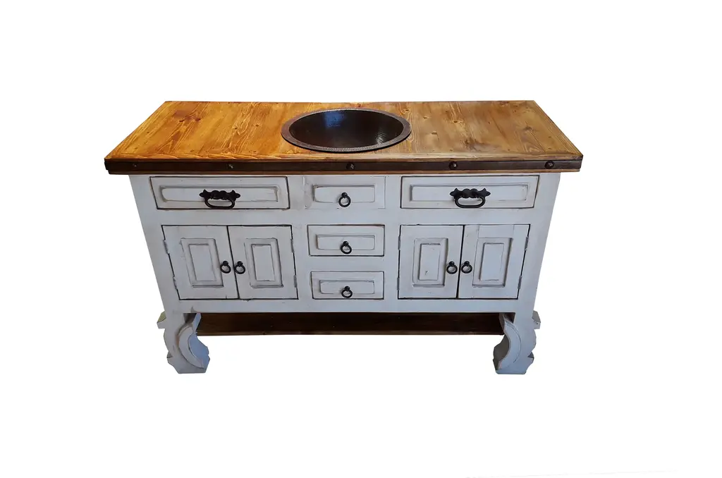This is a beautiful vintage style bathroom vanity. It could be for either a single sink or a double sink. It also can accommodate a drop in sink or a vessel. The top is sealed and protected against water damage. The vanity is painted white and then distressed to give it that unique look. The rustic hardware matches the metal banding across the top. It comes with two hammered copper sinks as pictured.Please Note, If you want to put the faucets behind the sink you will need to get the 22" deep vanity.All furniture is handmade when ordered.The measurements of the vanity pictured is60"W x 22"D x 32"T