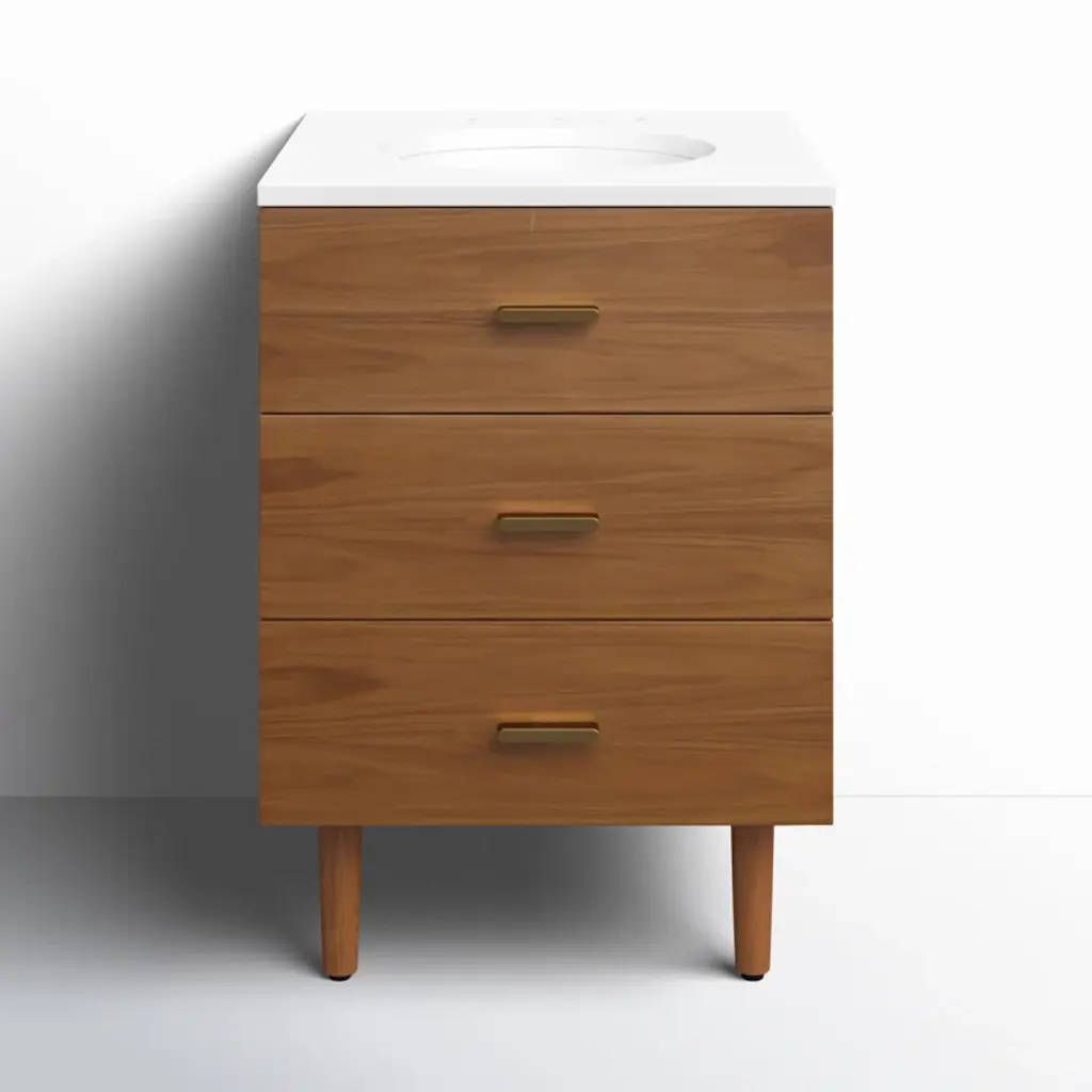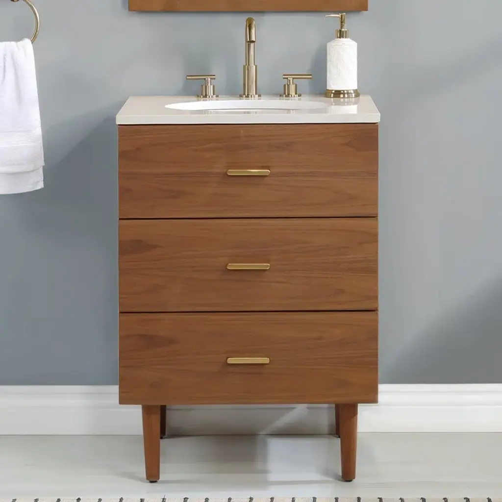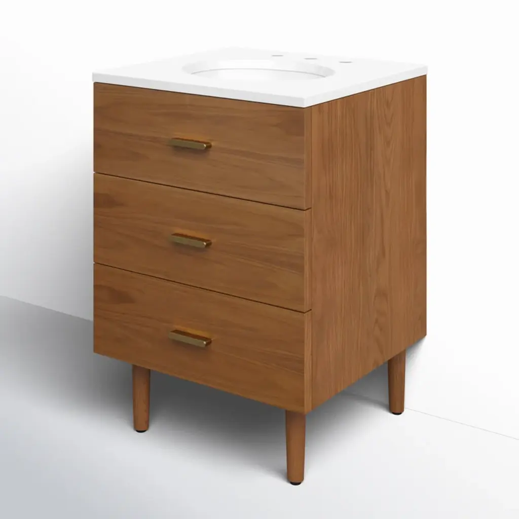 A bathroom makeover. This vanity’s warm tone, tapered legs, and gold hardware create a polished mid-century look. It’s topped by a white quartz counter with a ceramic undermount sink. Two soft-close drawers with dovetail joints hold soaps + grooming tools.