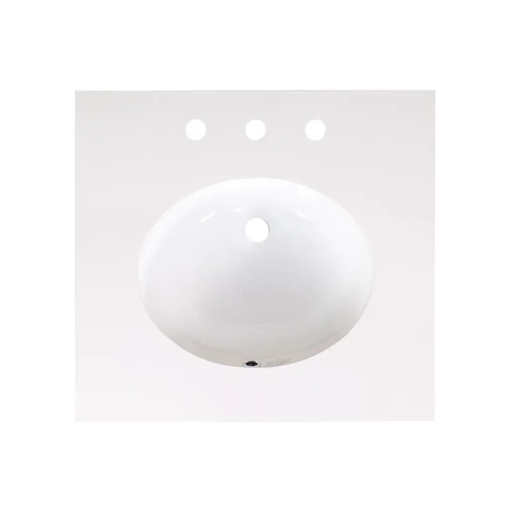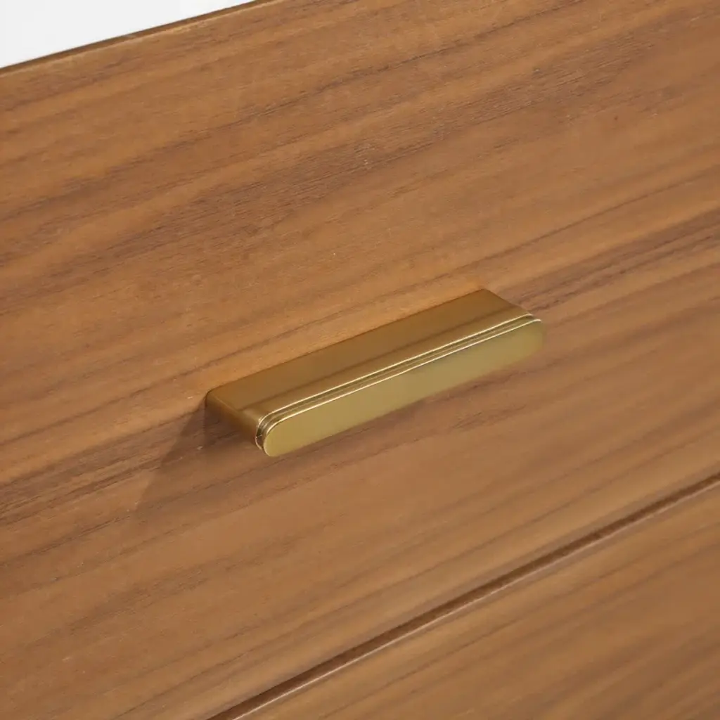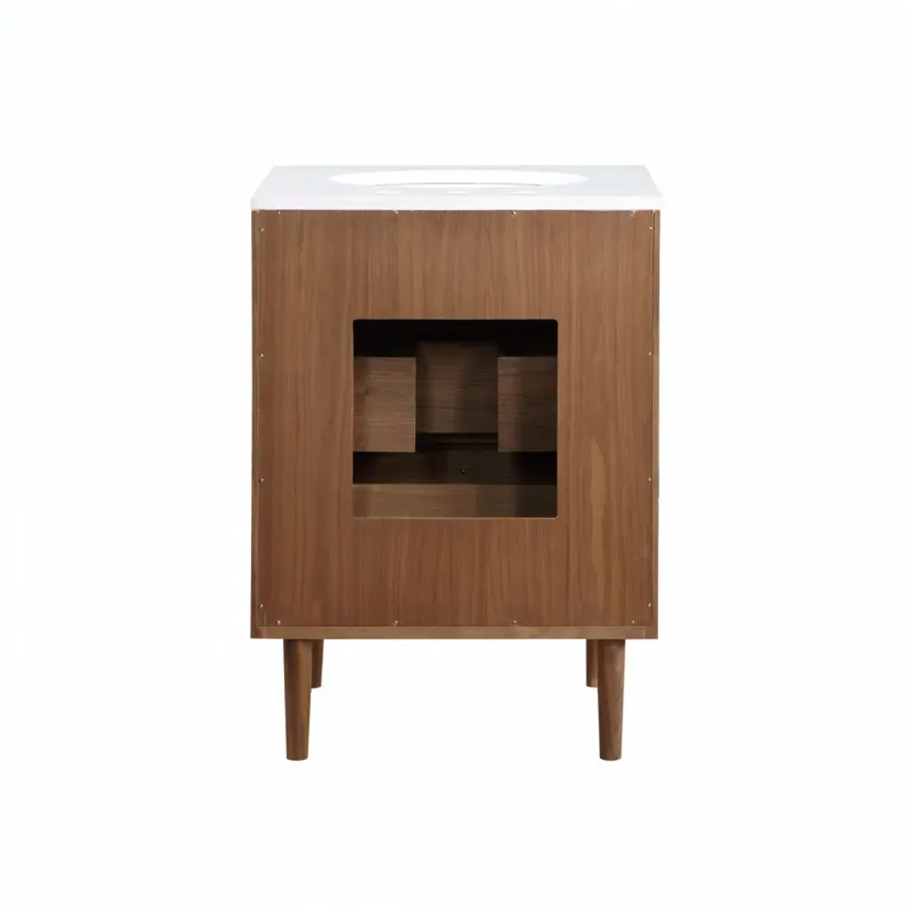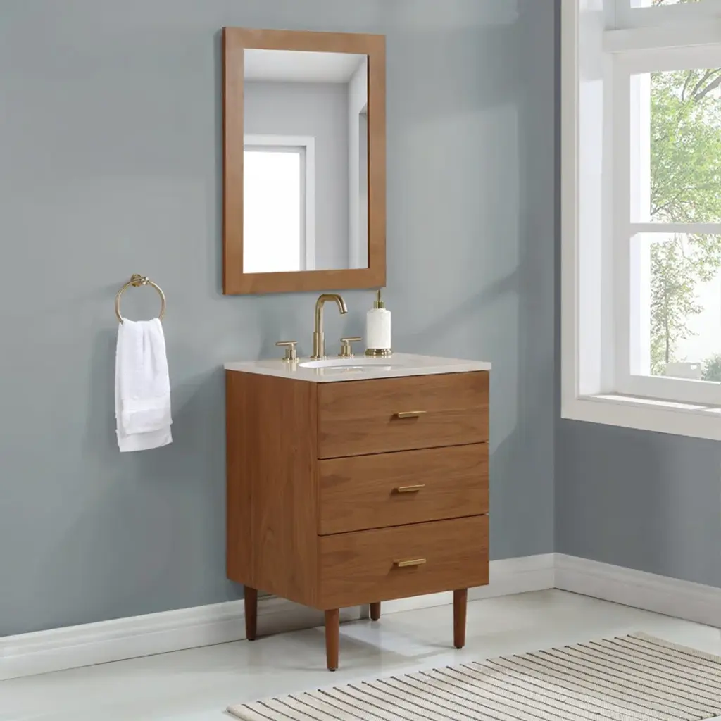 A bathroom makeover. This vanity’s warm tone, tapered legs, and gold hardware create a polished mid-century look. It’s topped by a white quartz counter with a ceramic undermount sink. Two soft-close drawers with dovetail joints hold soaps + grooming tools.