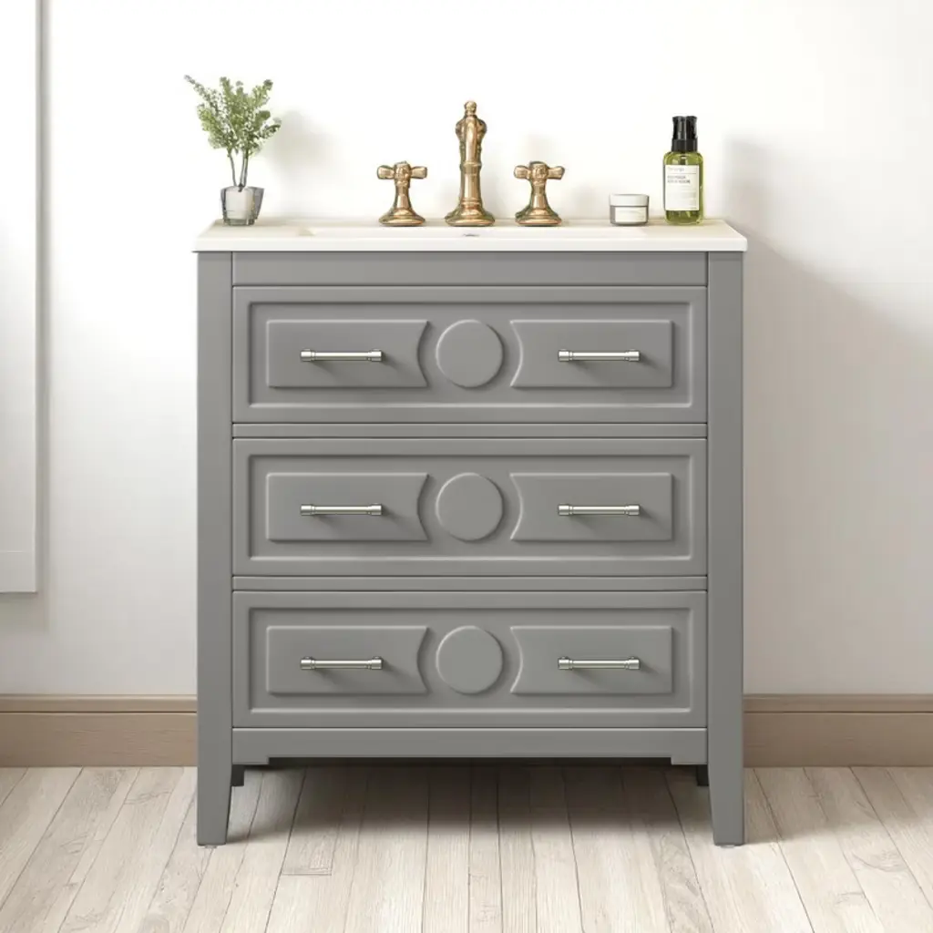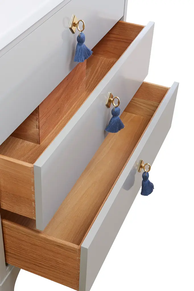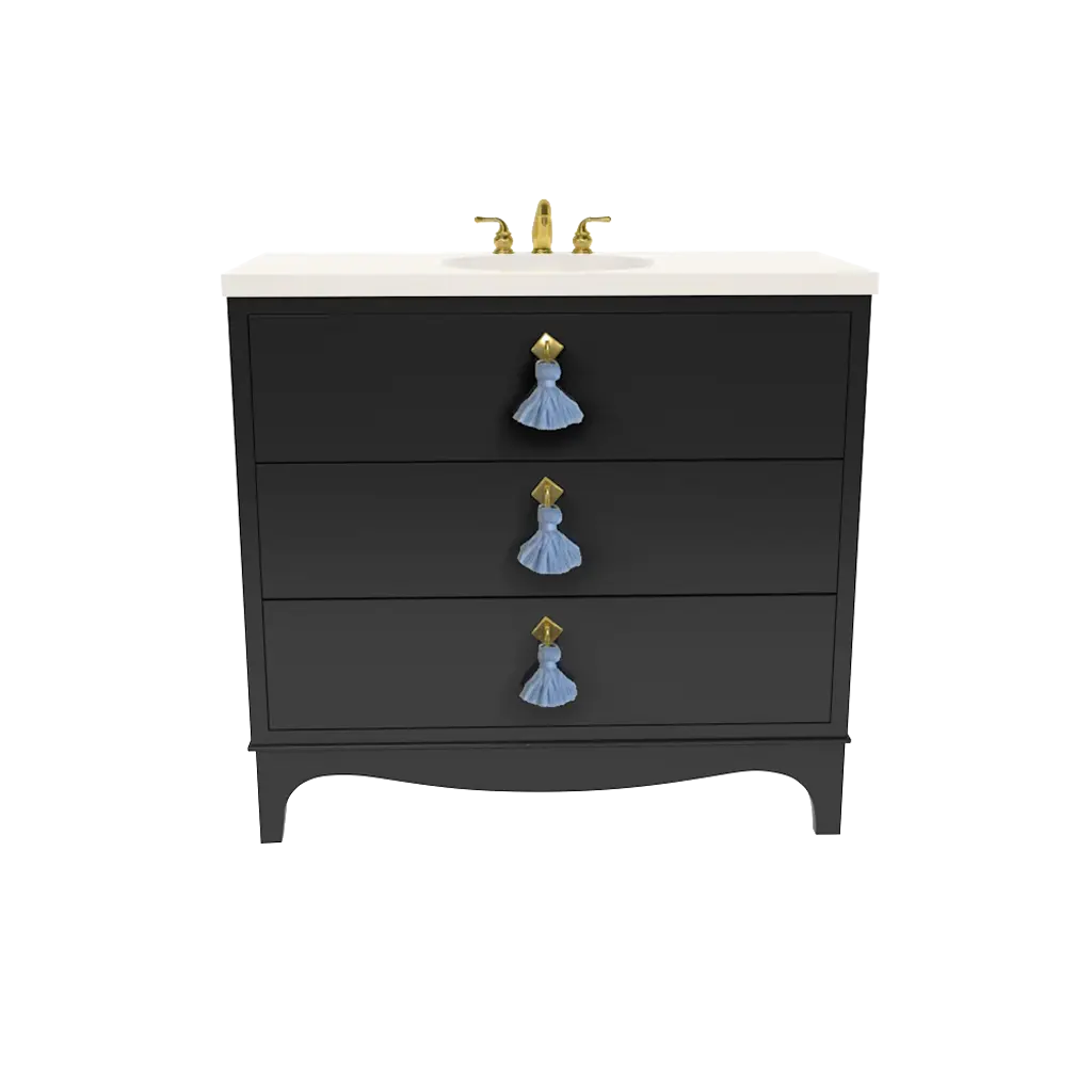 Dimensions: 36W x 22D x 32.75H We've taken our Best-Selling Easton Chest and transformed it into not one, but three, chic Vanities. Offered in three sizes, 30", 36", and 42", the Easton Vanity is available in 19 colors and 10 different tassel options, as well as your choice of brass or nickel hardware. Each Vanity is made to order with your exact color combinations. Lacquered to perfection, this Vanity is just the update you need transform your bathroom into something really special (and highly functional!) The Vanity boasts two large drawers, that self close on gliders, perfect for storing all your bathrooms necessities, and large enough to store even your fluffiest towels. The top drawer is engineered to wrap around your sink's plumbing, as not to waste any precious drawer space. (See images for details) Easton Vanities do not include the stone top, sink basin or faucet. Please ship to a furniture receiver or Moving and Storage facility. If you need to advice on shipping, please call us at 203-216-9848.** Made in the U.S.A.