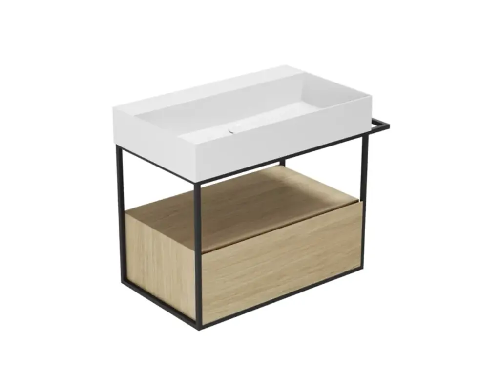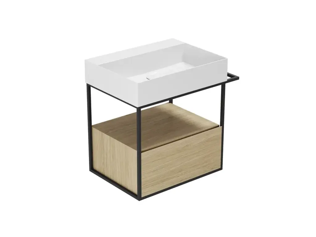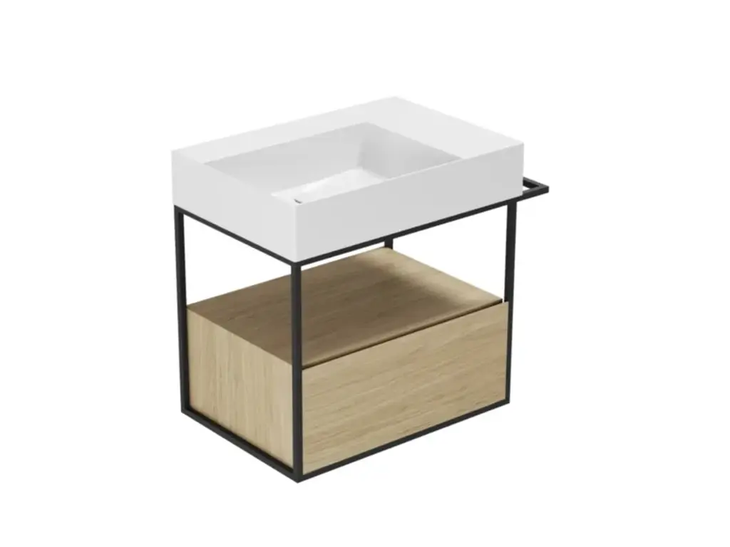Elegance Squared is a vanity unit with wall-hung frame in painted metal including two large drawers, White Elm, Natural Elm, Cement finishes, Azzurra Workshop design.The collection Elegance, available in the Circle, Soft, Zip and Squared versions, combines technological innovation and formal research. The thicknesses have been reduced to a minimum, just 3 mm, and lend a linear appearance to the washbasins, showcasing the ceramic material. The company expanded its offer by introducing the new palettes of the Colors 1250°, Luxury and Le Malteceramiche® lines, which enhance the slim lines of the washbasins.