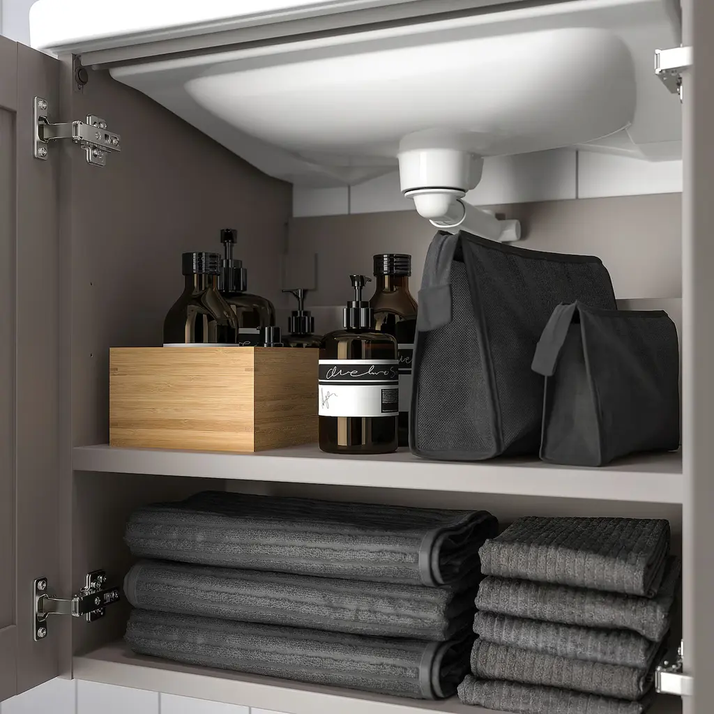 ENHET Bathroom vanity with 2 doors - gray/gray frame 24x18 3/4x24 ". A base cabinet for sink with shelf that is perfect for hiding towels and hygiene products that often create clutter. The unique wedge dowels make assembly easy and the fittings are nearly invisible.