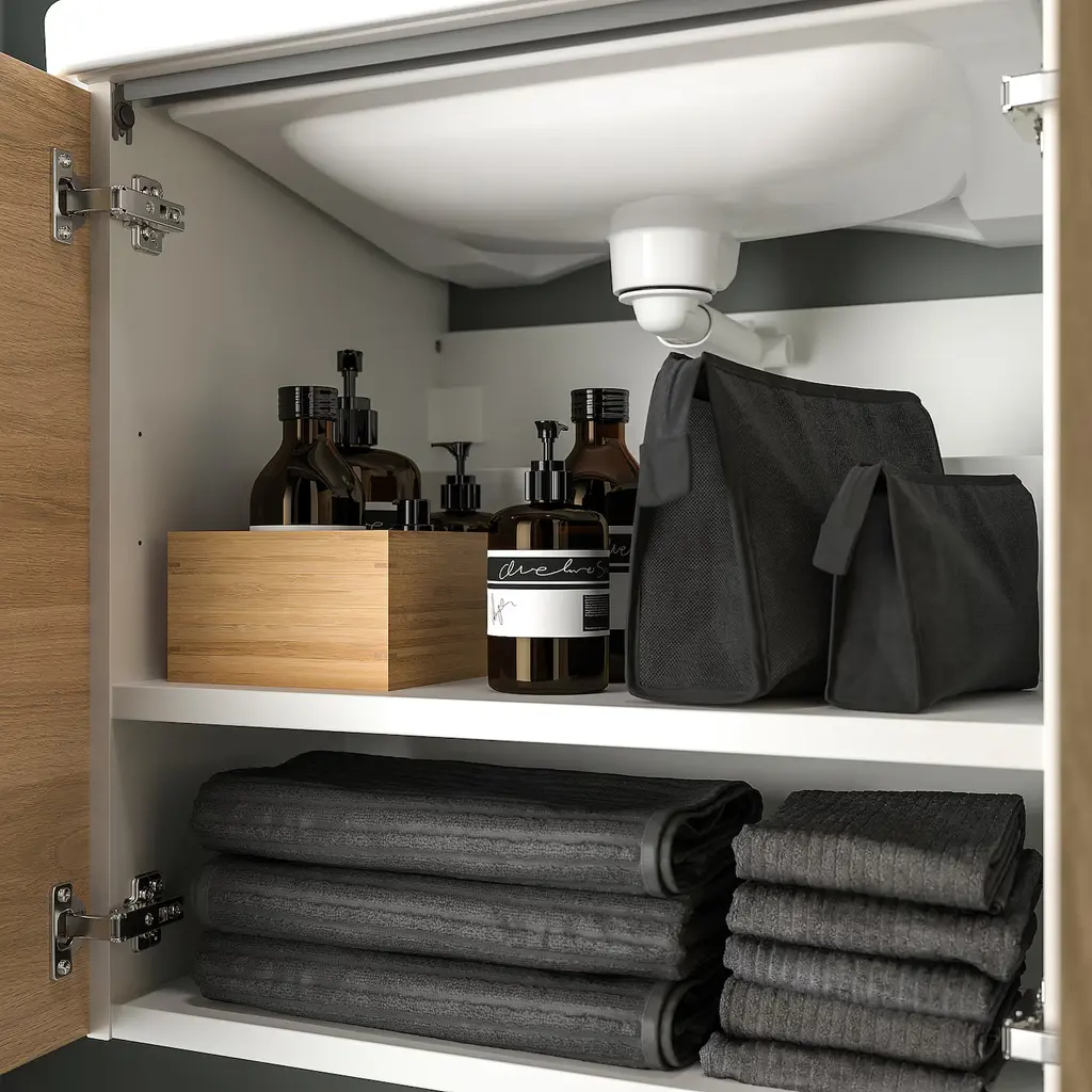 ENHET Bathroom vanity with 2 doors - white/oak effect 24x18 3/4x24 ". A base cabinet for sink with shelf that is perfect for hiding towels and hygiene products that often create clutter. The unique wedge dowels make assembly easy and the fittings are nearly invisible.