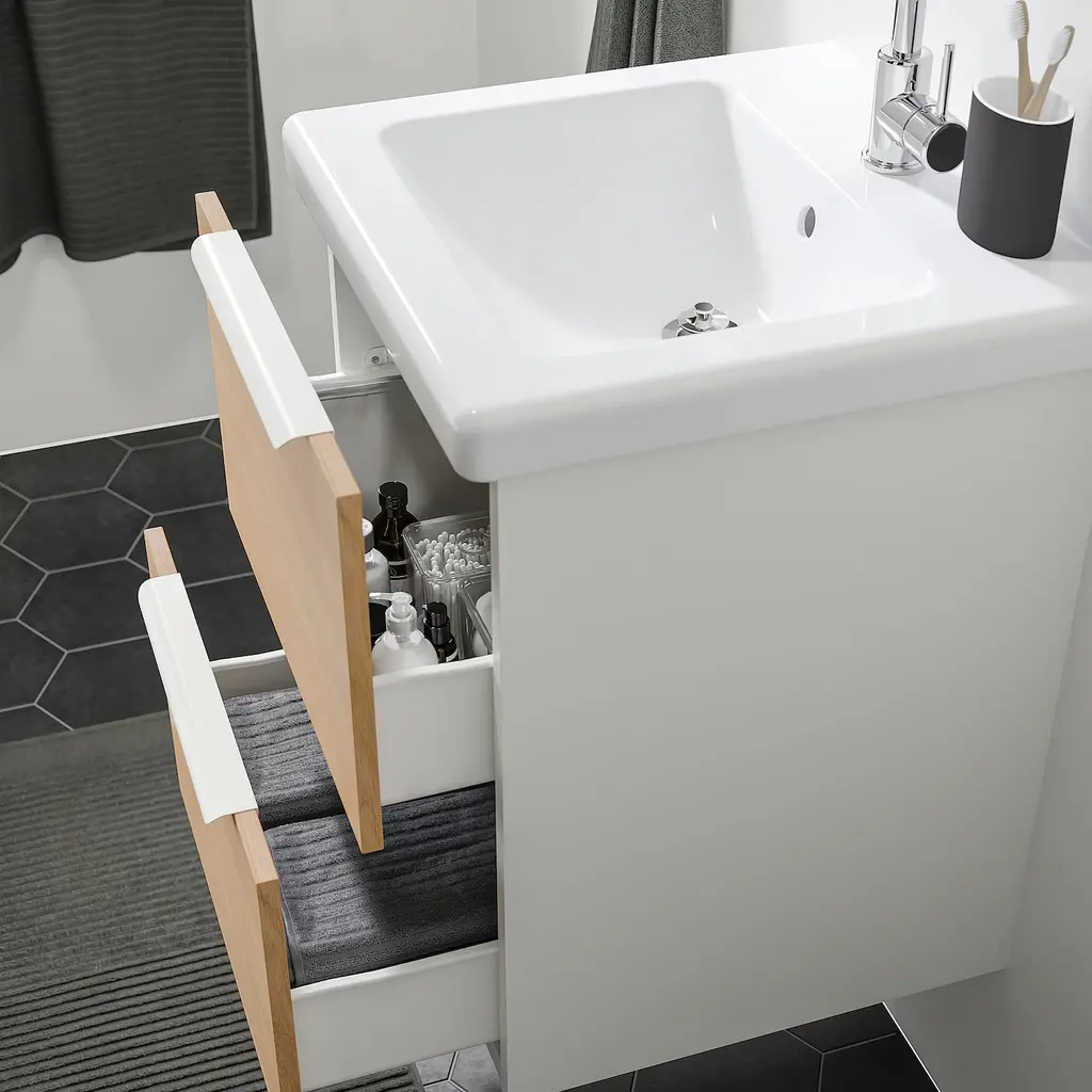 ENHET Bathroom vanity with 2 drawers - white/oak effect 18x18 3/4x24 ". You can store often-used things like cotton pads, brushes and hygiene products in the top drawer, and other things like towels the bottom drawer. The unique wedge dowels make assembly easy and the fittings are nearly invisible.