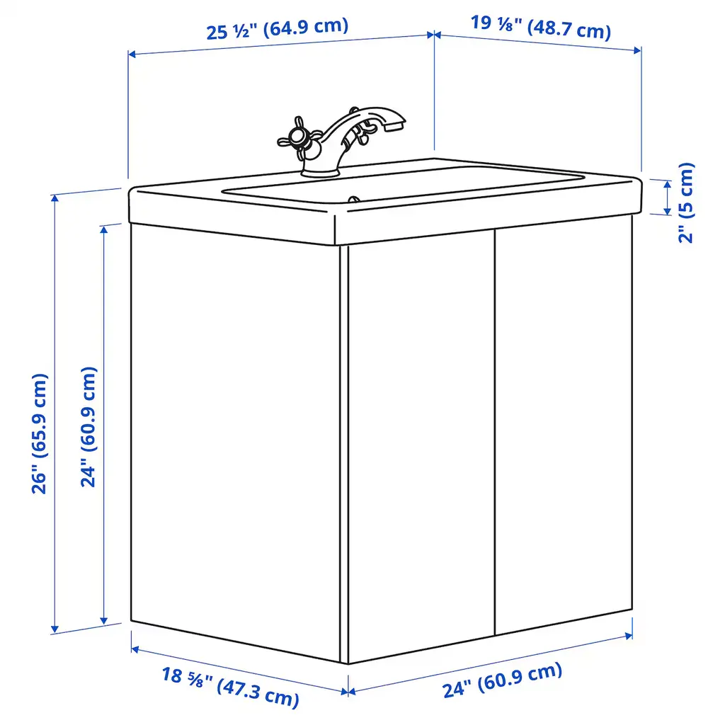 ENHET / TVÄLLEN Bathroom vanity w doors/sink/faucet - gray/gray frame 25 1/2x19 1/8x26 ". A base cabinet for sink with shelf that is perfect for hiding towels and hygiene products that often create clutter. Cleaning the floor is a breeze since this combination is wall-mounted.