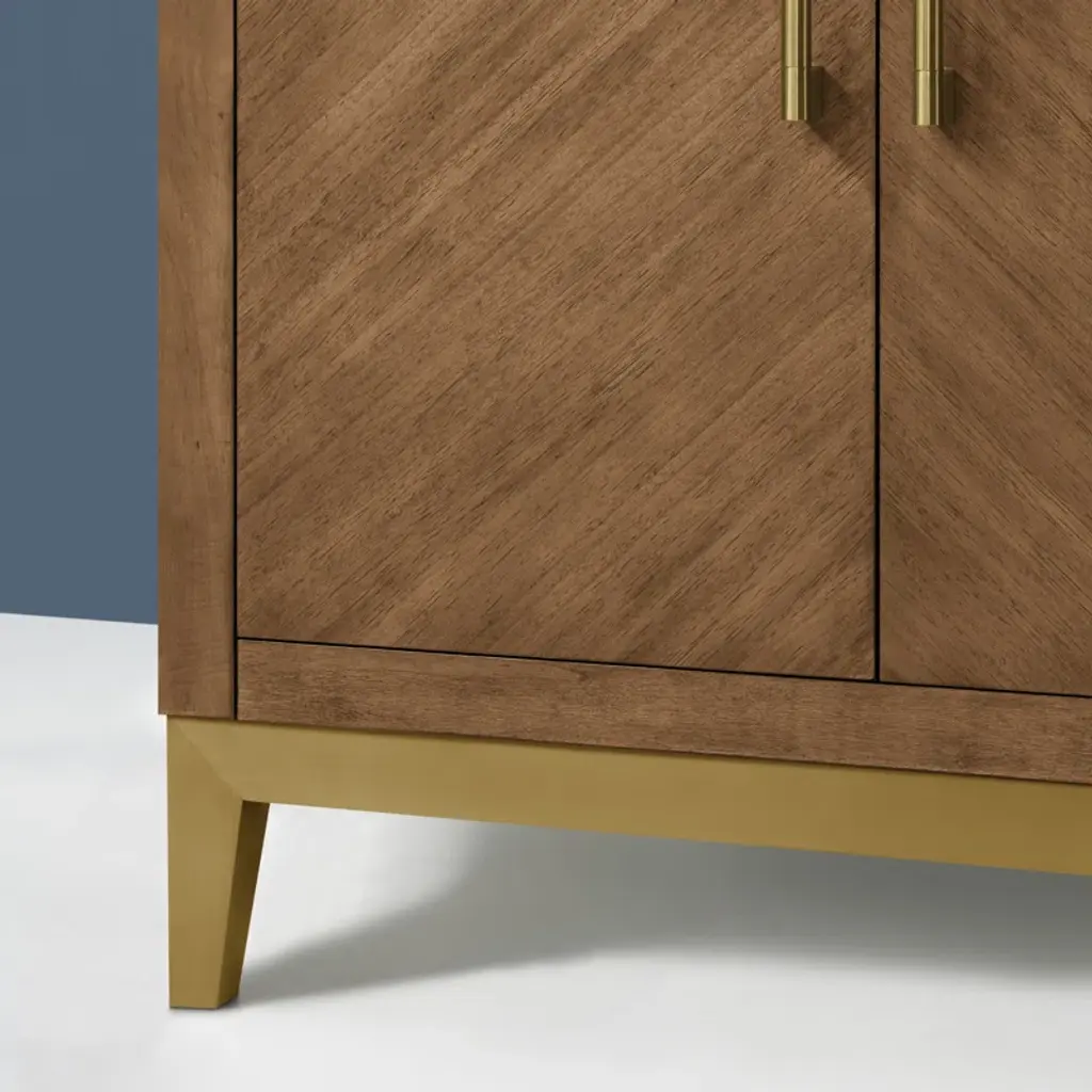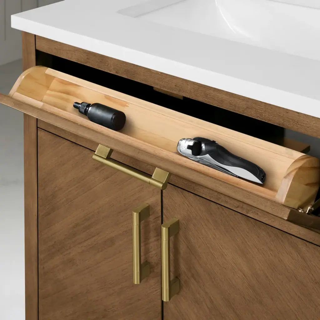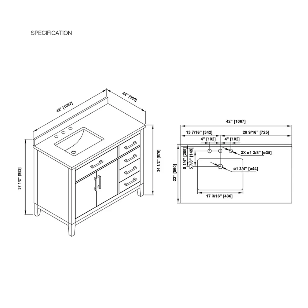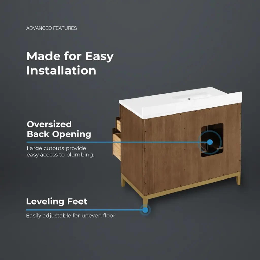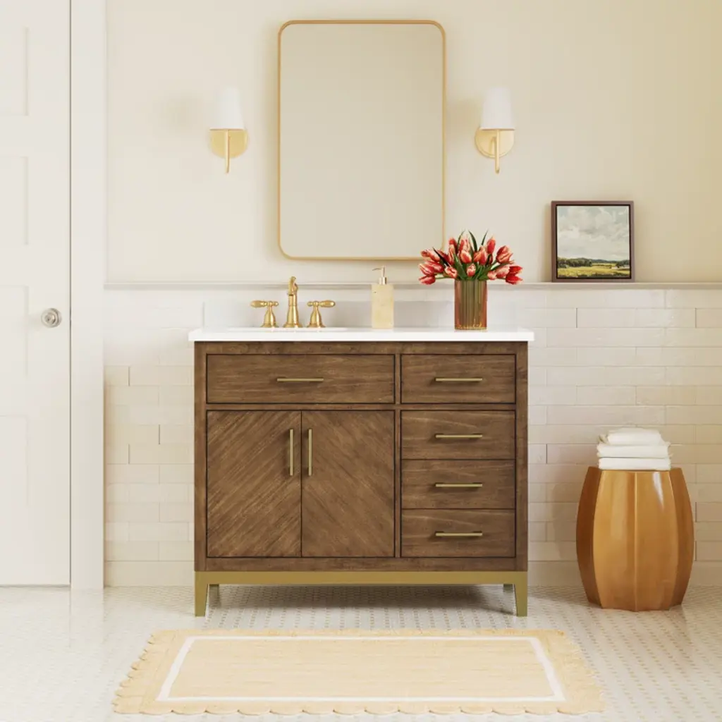 This single 42" bathroom vanity saves on space without shorting on glam style. Crafted with a clean-lined silhouette, this piece rests on tapered feet and has a marble-like countertop in a white hue. Wood paneling with a macchiato finish details four functional drawers and two cabinet doors, offering plenty of space to store all your bathroom essentials and toiletries. Sleek metal hardware adds a luminous gold element and a glam feel. Its undermount sink comes with a pre-drilled hole to add an 8'' widespread faucet of your choice (sold separately). Countertop not pre-assembled. The countertop and vanity are packed separately for less risk of damage, and easy maneuvering and installation.