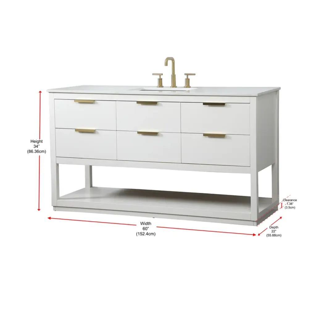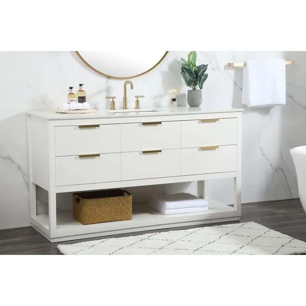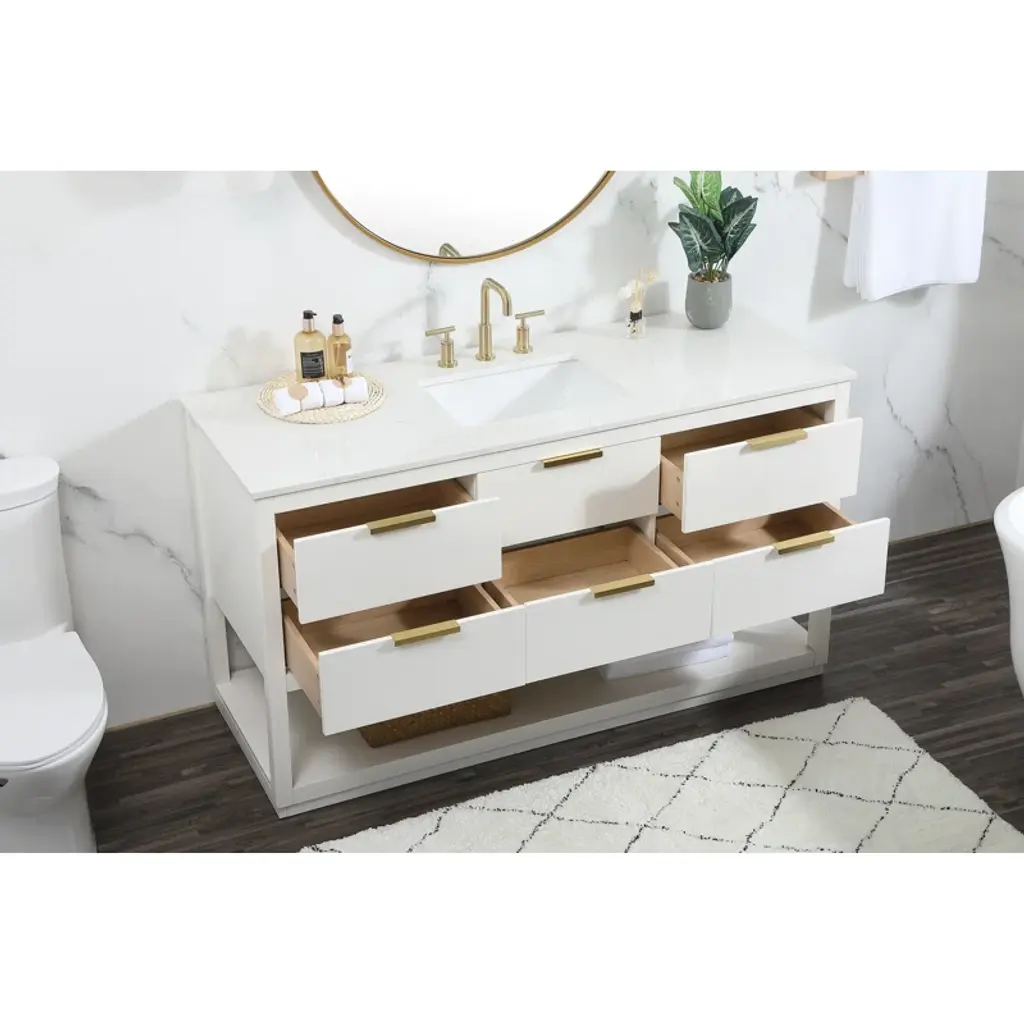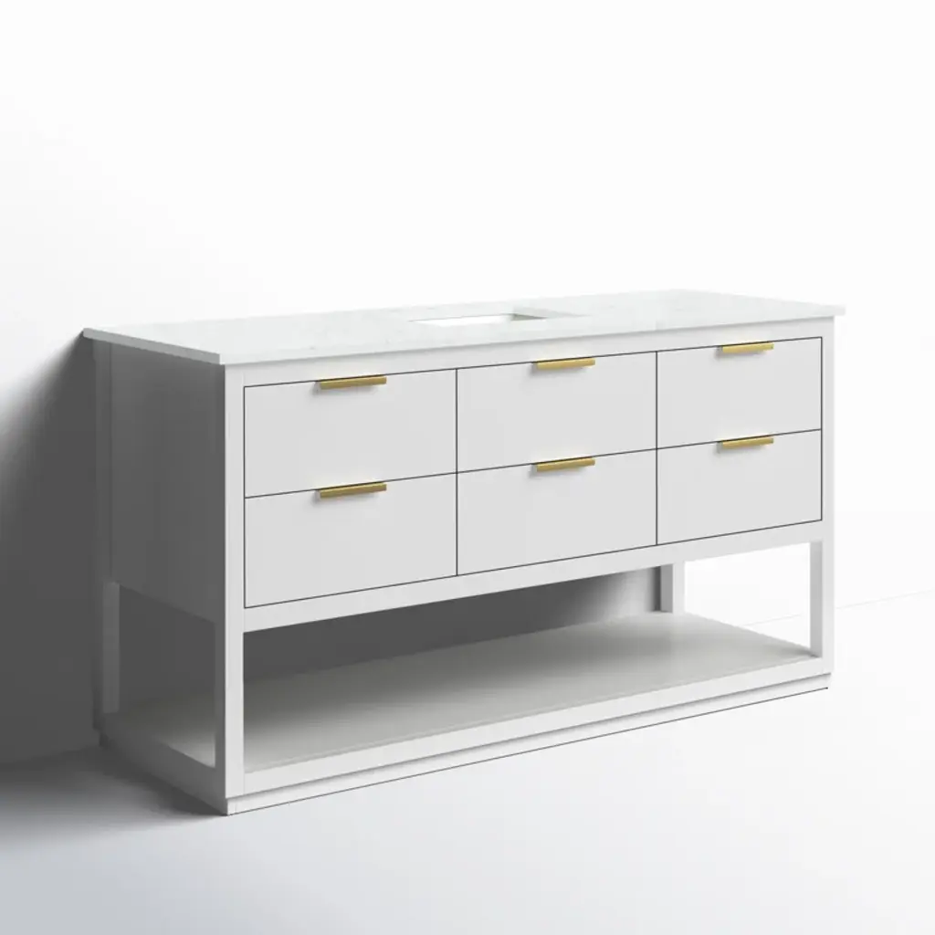 Live in modern comfort with this vanity. Dressed in sleek metal hardware, its contemporary style will have your bathroom or powder room elevated in modern sophistication. The open shelf at the base and six drawers reveal ample storage space for your bathroom essentials and miscellany. Clean lines create their own visual interest, adding trendy looks to your already chic room.