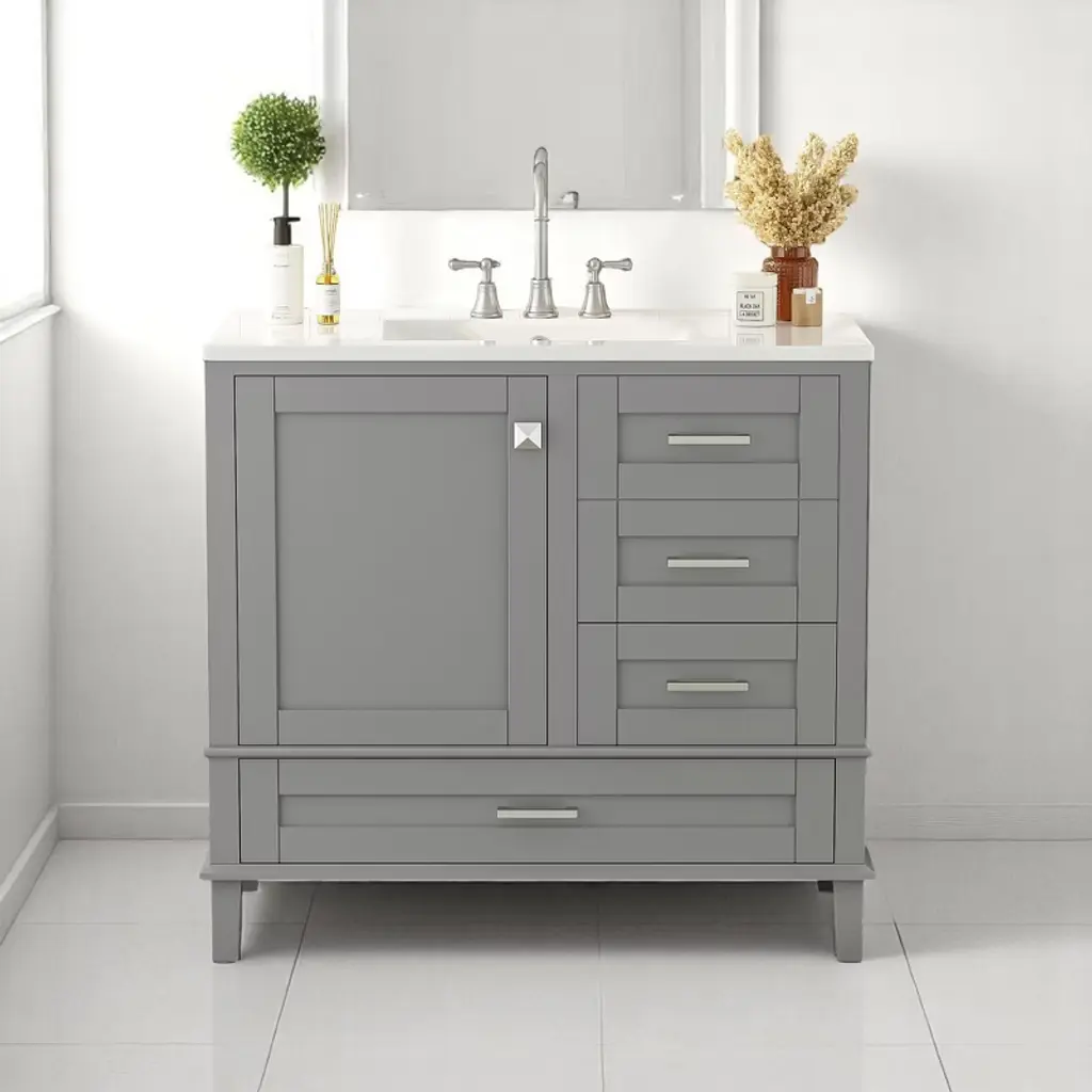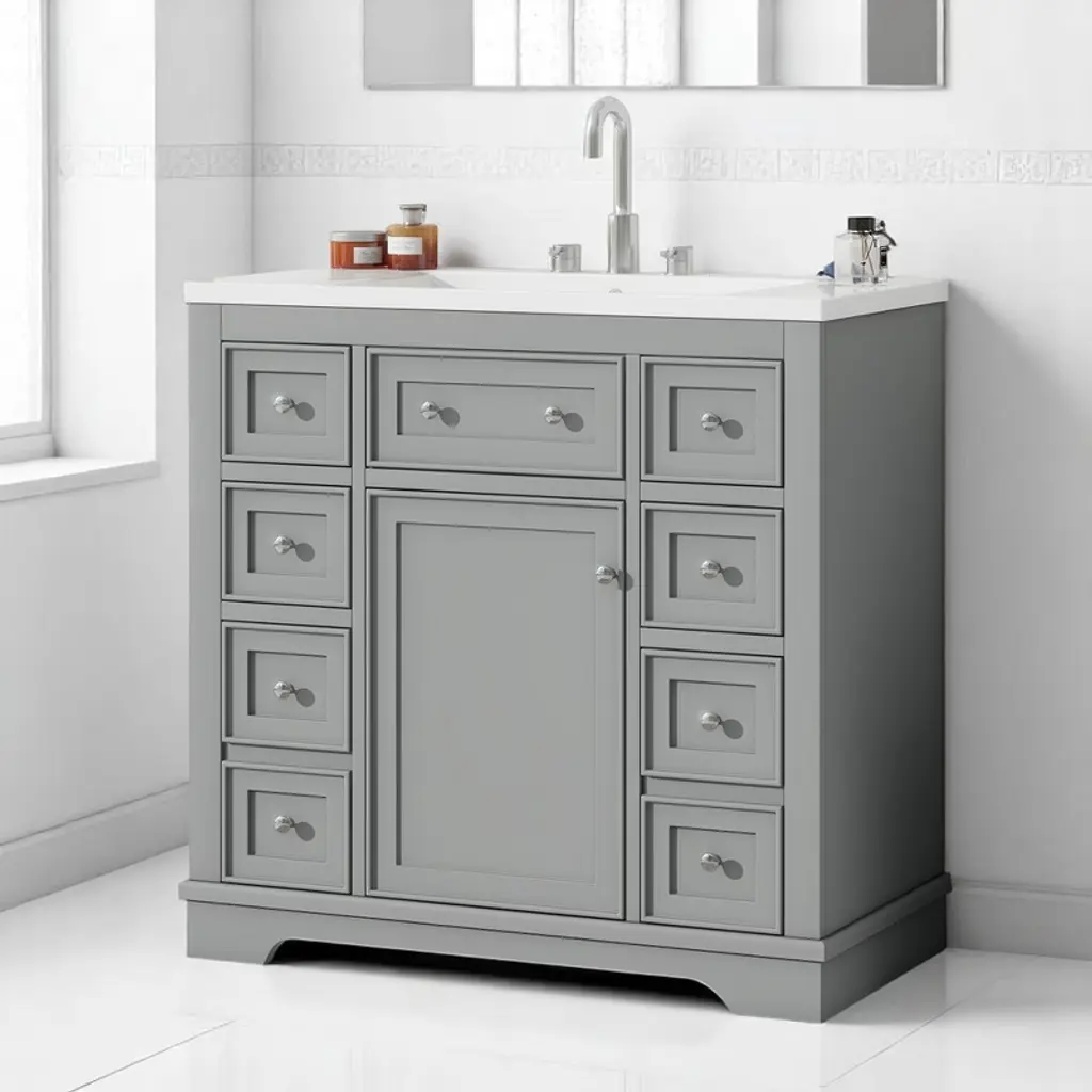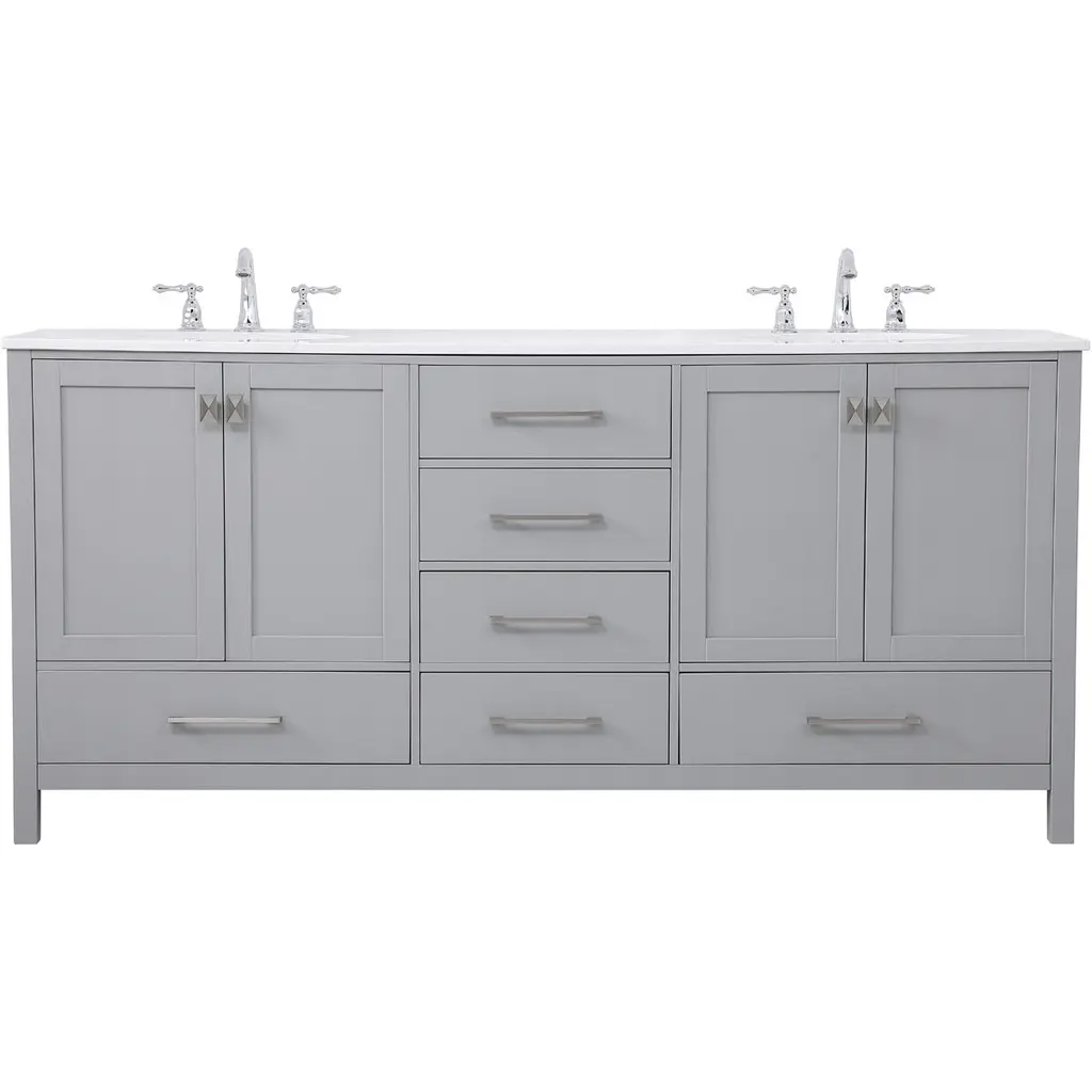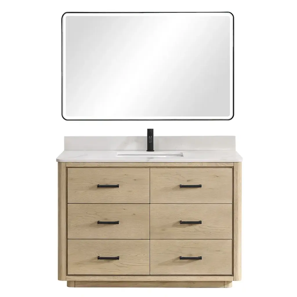 Live in modern comfort with this vanity. Dressed in sleek metal hardware, its contemporary style will have your bathroom or powder room elevated in modern sophistication. The open shelf at the base and six drawers reveal ample storage space for your bathroom essentials and miscellany. Clean lines create their own visual interest, adding trendy looks to your already chic room.