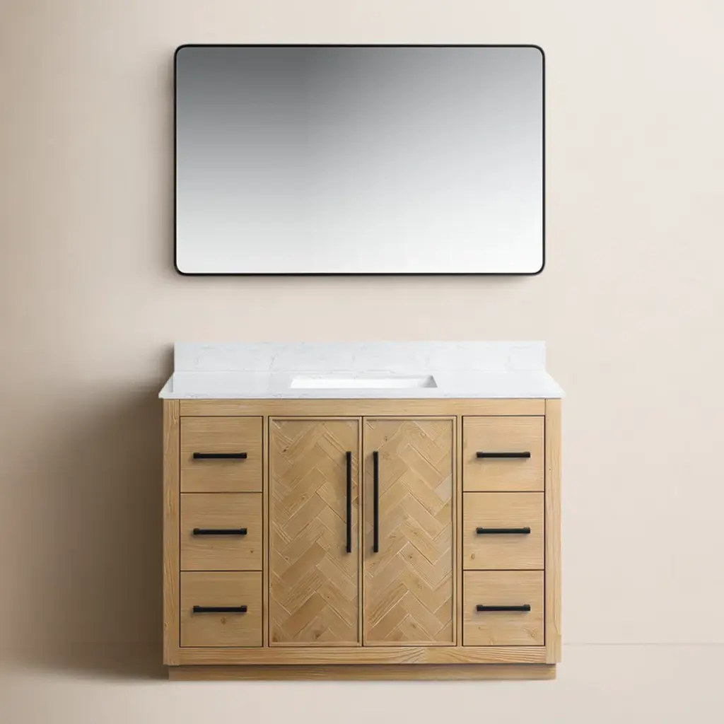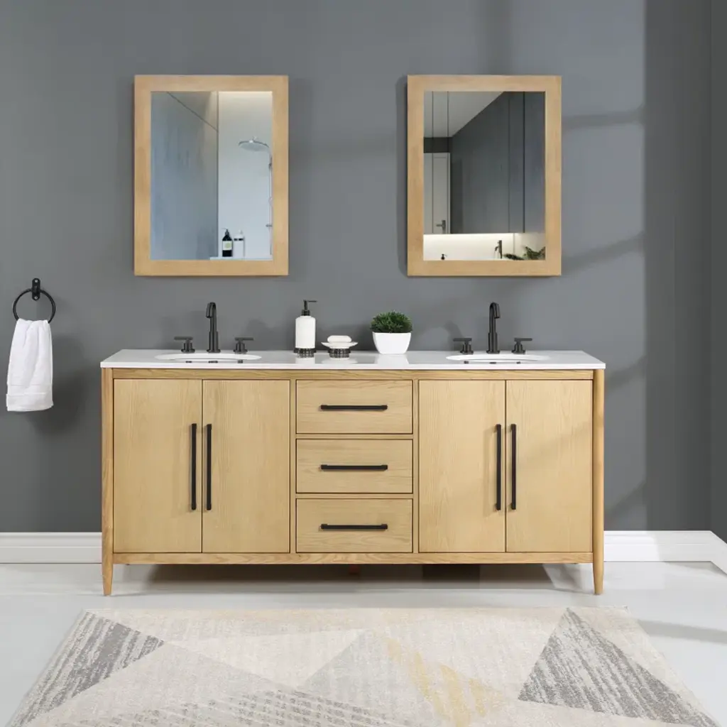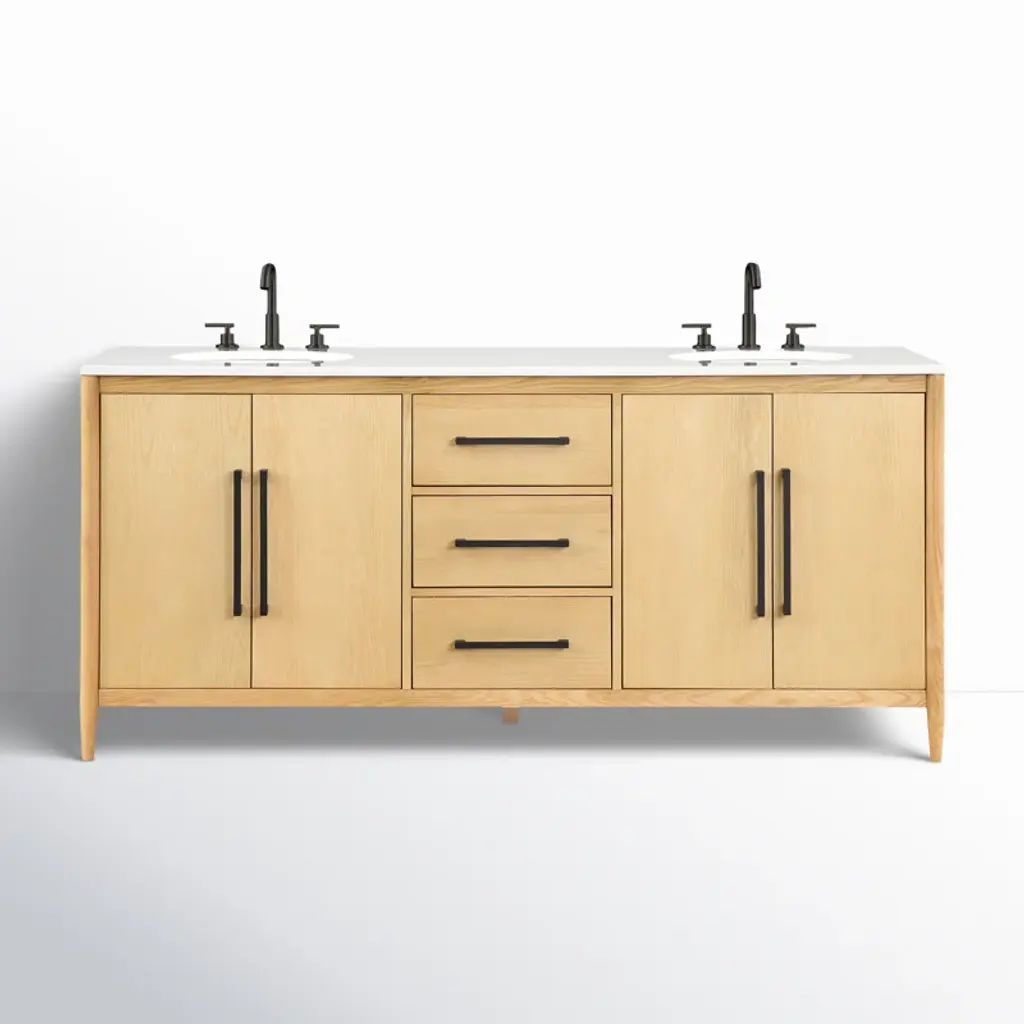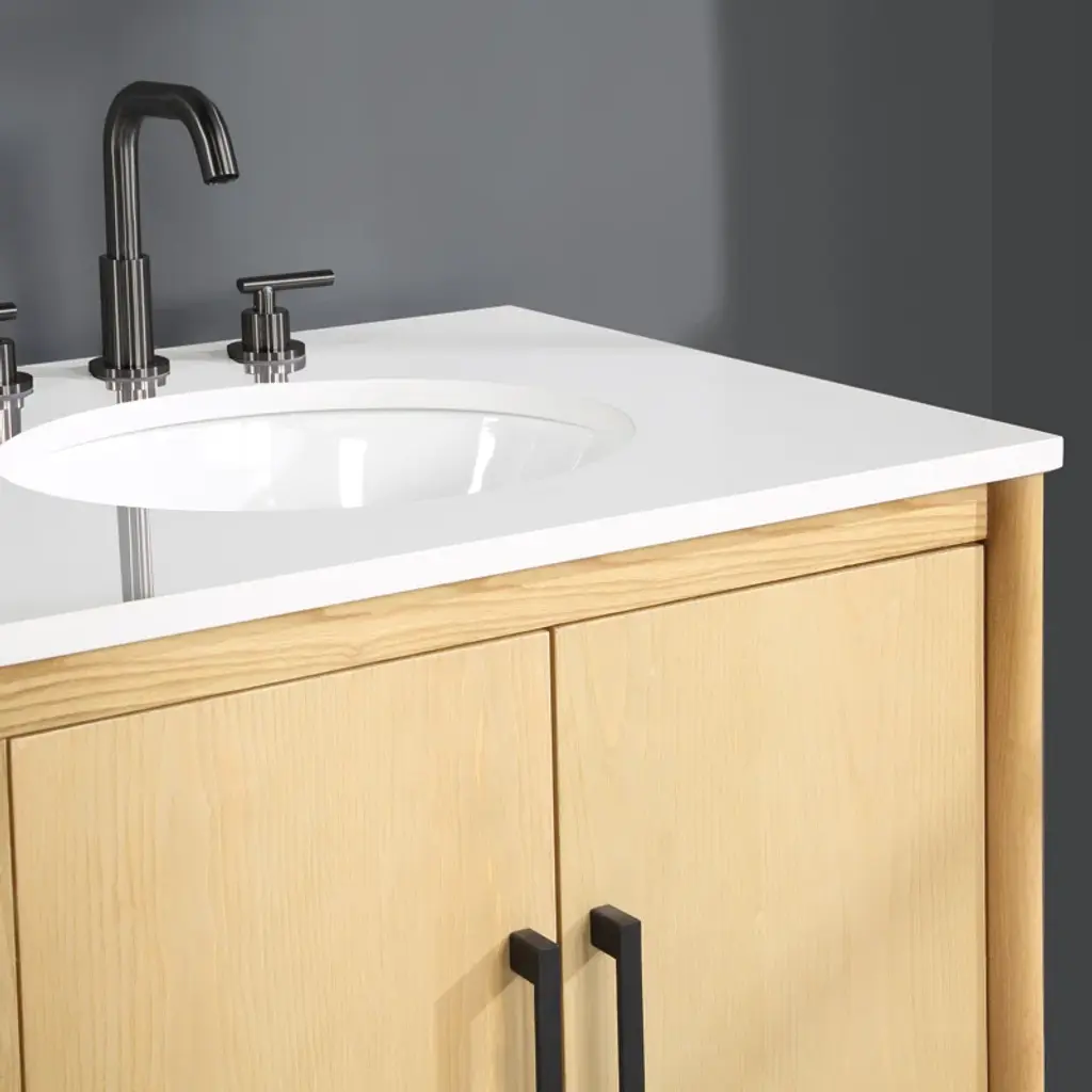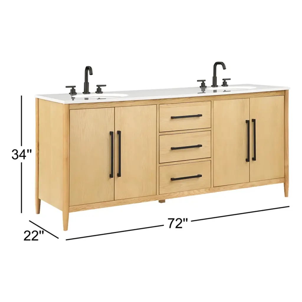 Bring mid-century style and modern functionality to your bathroom with this striking vanity. Real ash veneers add an airy warmth to the solid wood frame. The pure white quartz top is both sleek and functional. Soft-closing doors and drawers provide smooth access to ample storage space.
