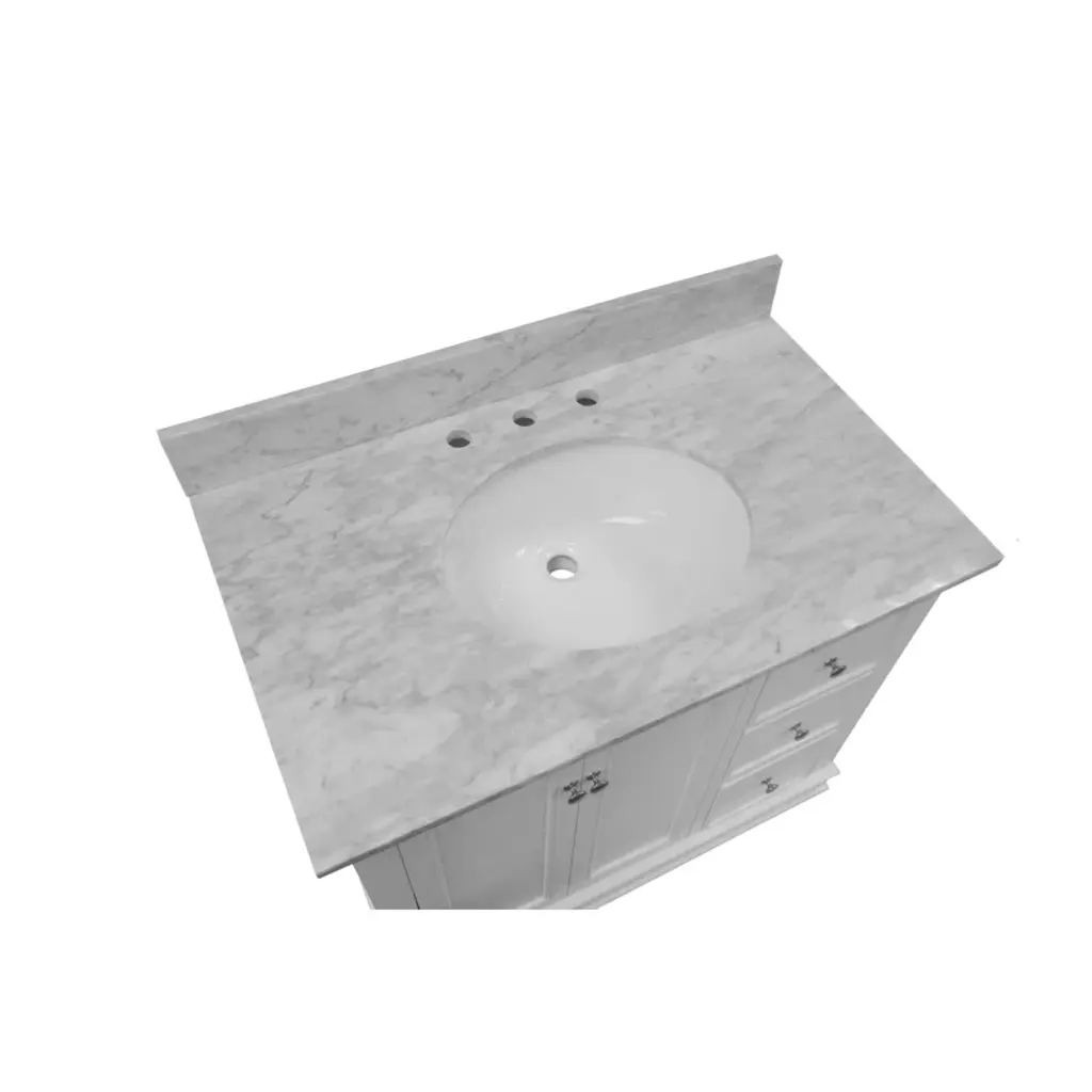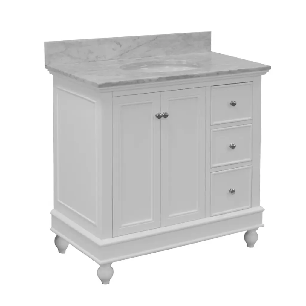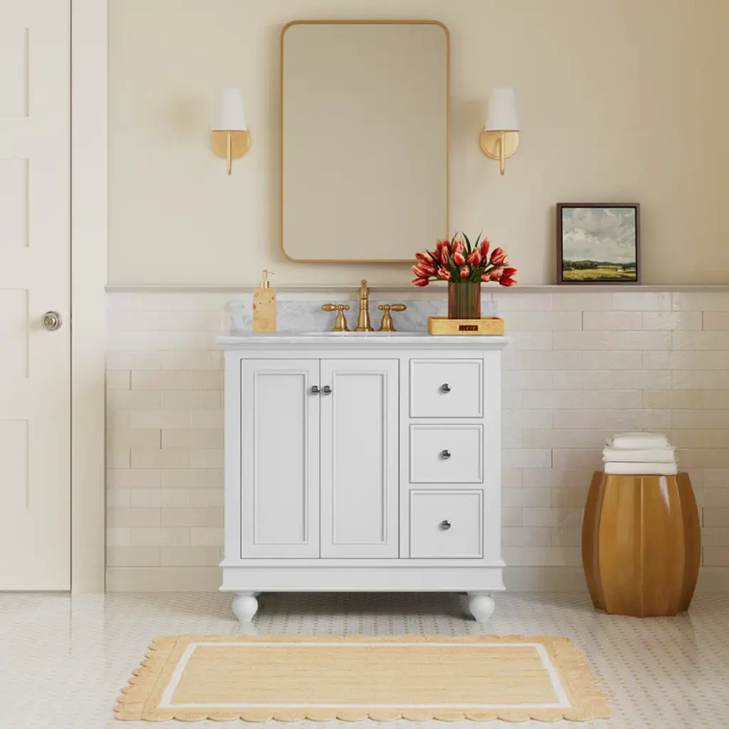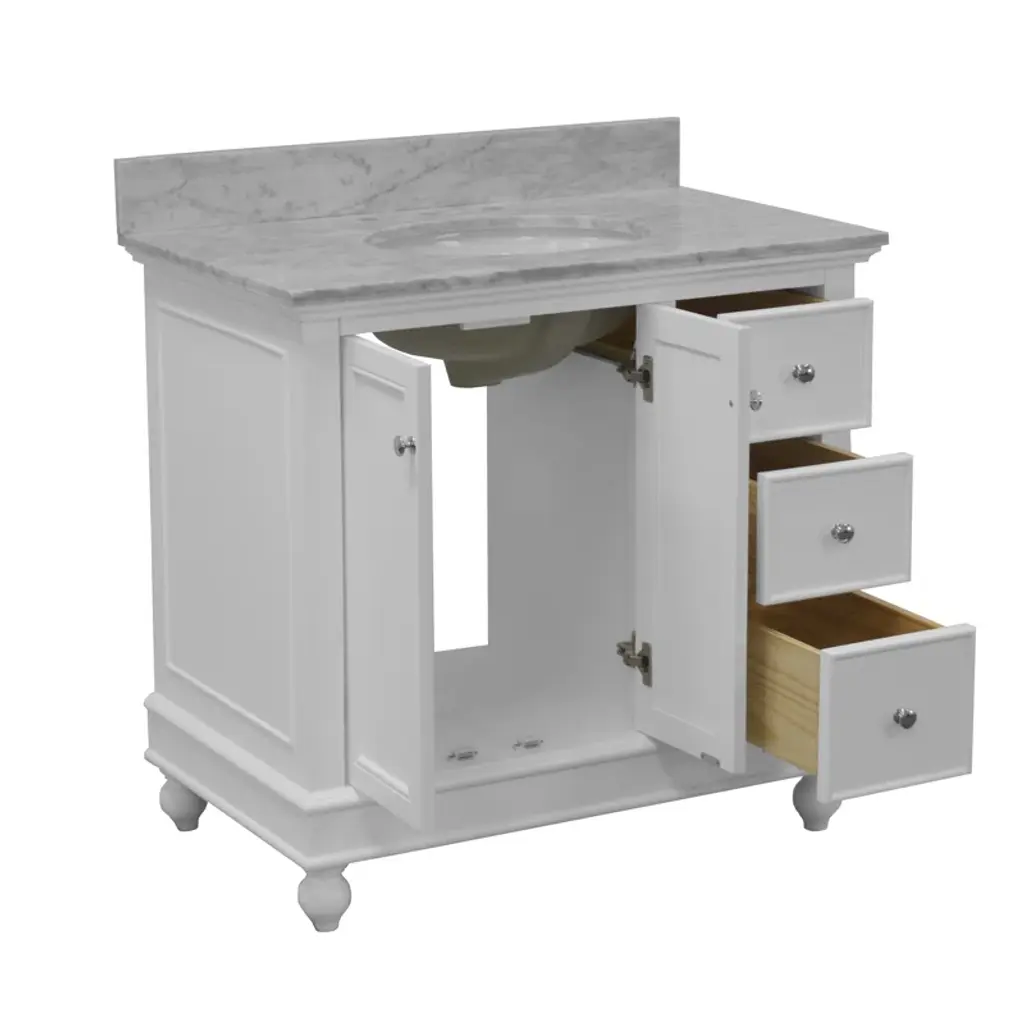 Upgrade your bathroom with this vanity, handcrafted and hand-painted for a truly one-of-a-kind touch. Made from a solid and engineered wood blend, it features a water-resistant finish that is perfect for busy households. The under-mount ceramic sinks are oval-shaped and complemented by a beautiful backsplash. Just add your favorite 8" widespread faucets to complete the look. Designed for residential use, this vanity is a fantastic addition to any bathroom.