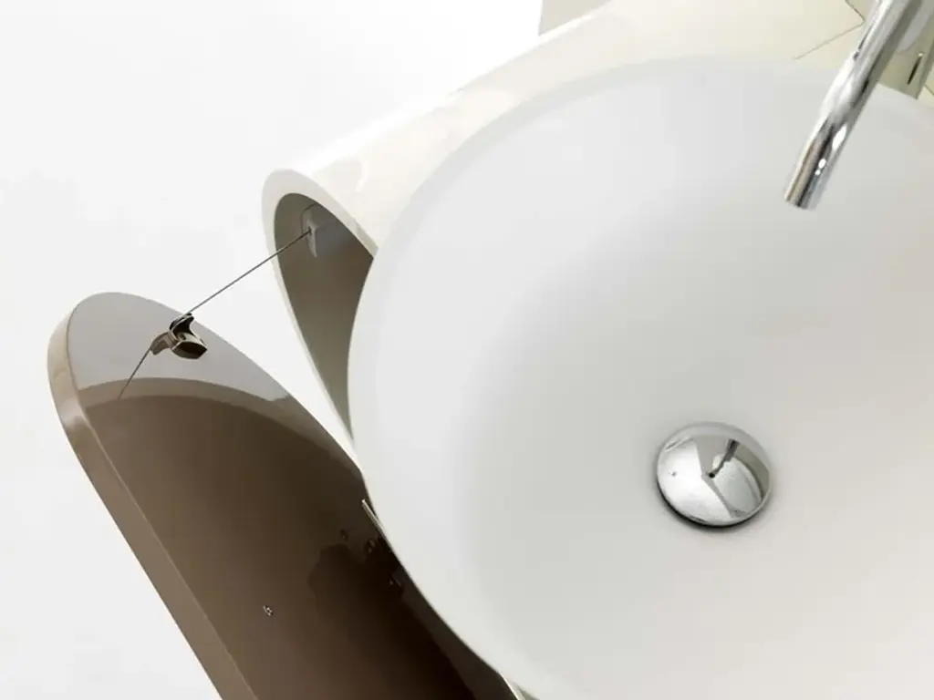 FLUX_US 3 is a bathroom composition.Finish: G61 linen lacquer + M93 glossy tobacco - Soko washbasin in matt Stone Light.New Lasaidea collection: advanced research, design innovation, total quality and high functionality.There arises an original way of conceiving and living the bathroom space in perfect harmony between creativity and tecnology. Fluid shapes that envelop body and mind. There is a space for everything: every container of the flux_us collection has the greatest usability in perfect harmony with contemporary space. Ispired to contemporary sensibility, in which the sinuous shapes and the products sobriety are emphasised by the colours and the laquers.A young, coloured, informal house. Technology, design and functionality: this is Flux_us.