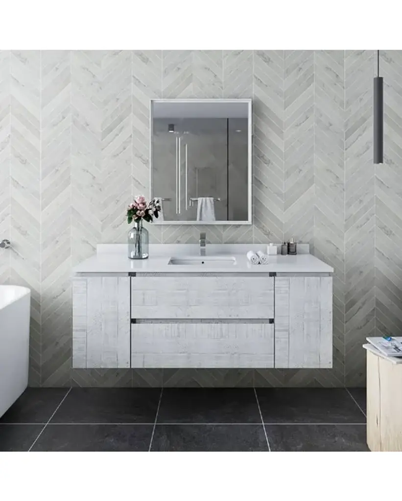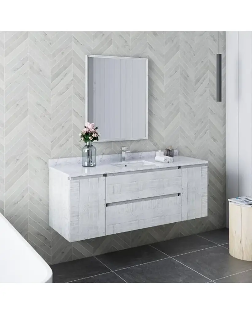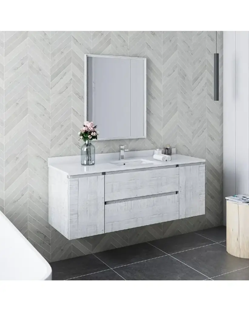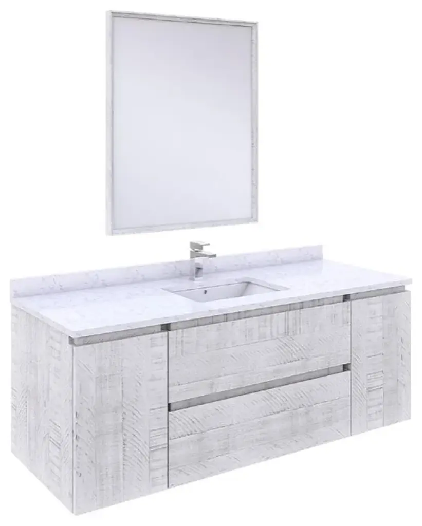 Fresca Formosa 54 Inc Wall Hung Single Sink Modern Bathroom Vanity w/ Mirror in Rustic WhiteThe Fresca Formosa Single Sink Wall Mount Bathroom Vanity is superbly crafted of solid Acacia wood, known for its magnificent beauty and durability. It has a warm grey finish with a hint of brown throughout, and a natural grain that will inject luxurious warmth into any space. A masterpiece of elegance and style, this wall-mounted vanity measures 54” in width. With solid wood, soft-closing dovetail drawers and two roomy cabinets, this bathroom vanity features tons of storage, ideal for keeping a family organized. The solid pine drawers are clear coated and feature a mitered, wrap-around design that adds to the superior detailing. Cove routed pulls are carved directly into the drawers and cabinet doors, keeping the design sharp and sophisticated. Gracing the top of the vanity is a stunning 54” quartz stone countertop and ceramic undermount basin. With ample counter space, this luxurious vanity makes the morning routine a pleasure. The white ceramic basin is equipped with an overflow and the countertop has been pre-drilled to accommodate the faucet of your choice. A p-trap, pop-up drain and installation hardware are included. This Formosa Wall Mount Bathroom Vanity comes with a matching 26” Acacia Mirror with a frame that is cove routed and mitered, providing the perfect finishing touch.Bathroom Vanity Set Features:Dimensions of Vanity: 54"W x 20.4"D x 20.3"HDimensions of Mirror: 26"W x 32"H x 1.4"HMaterials: Solid Acacia Wood Construction, Quartz Stone Countertop, Ceramic Undermount Sink w/ OverflowSingle Hole Faucet Mount (Faucet Shown In Picture May No Longer Be Available So Please Check Compatible Faucet List)2 Soft Closing Dovetail Drawers / 2 Soft Closing DoorsMitered Wrap Around Drawer DesignSeamless Countertop w/ Matching BacksplashMitered, Cove Routed, Solid Wood Mirror FrameFully Covered Back PanelIncluded: Main Cabinet, Misc Side Cabinets, Countertop, Sink, Faucet, Mirror, P-trap, Pop-Up Drain and Installation HardwareBathroom Vanity Set Specifications:Cabinet Finish: Rustic WhiteMaterial: Solid WoodSink Shape: RectangleSink Type: UndermountSink Configuration: SingleSink Dimensions: 15.13"x10.38"x6.75"Countertop Material: Quartz StoneVanity Style: ModernVanity Installation: Wall Hung