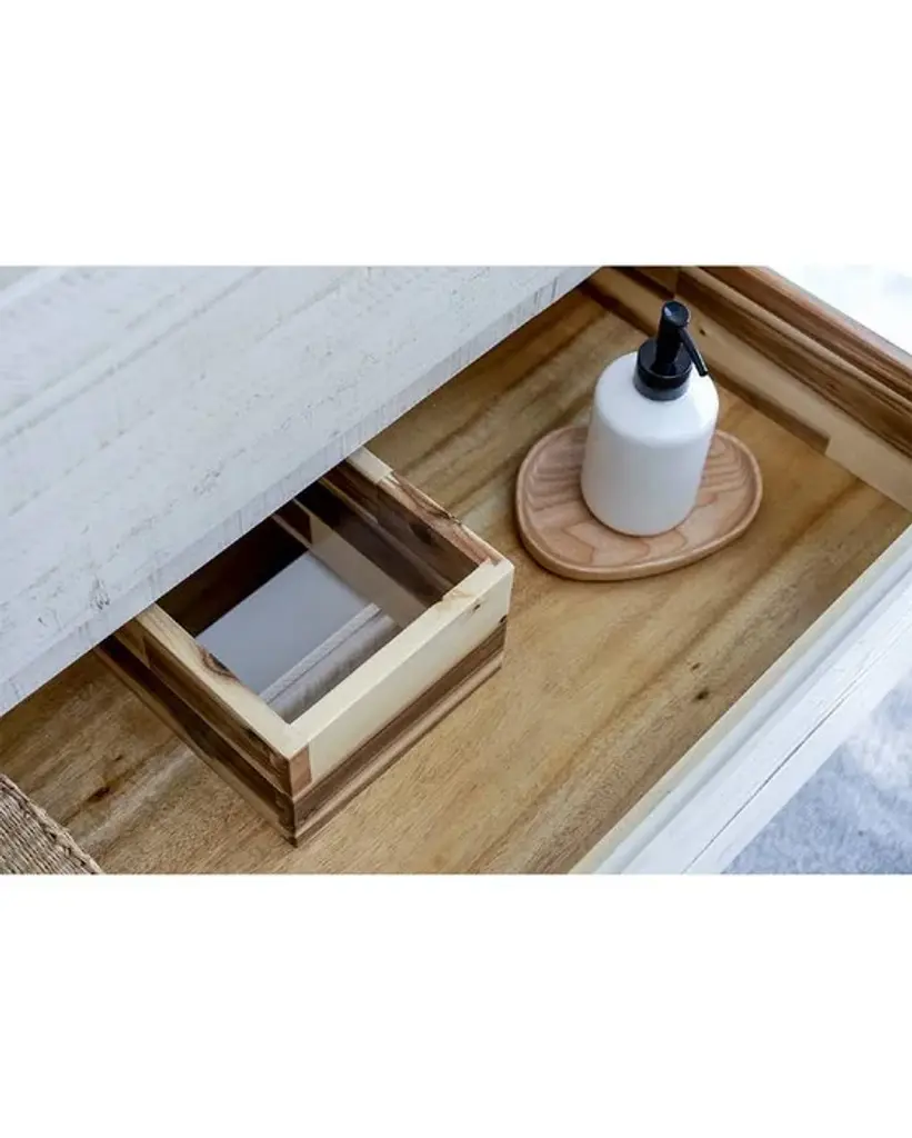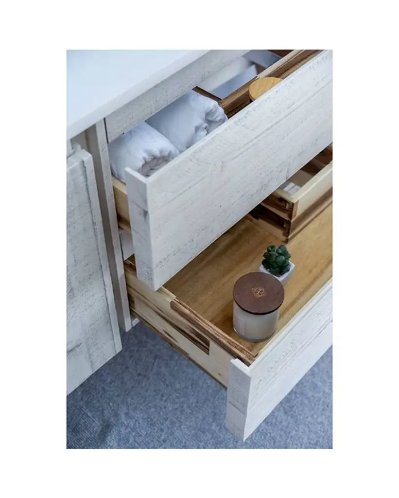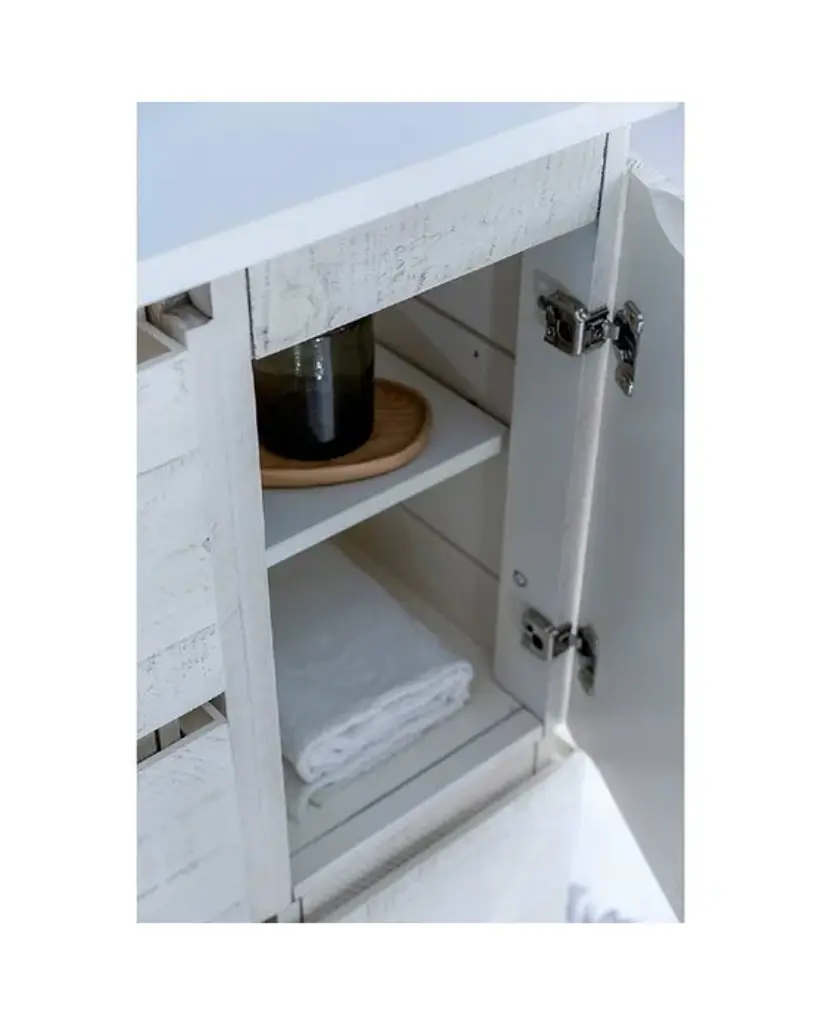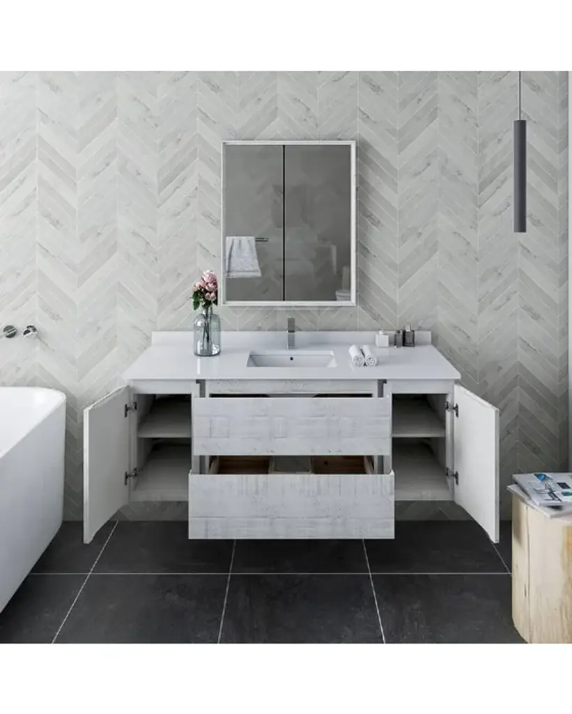 Fresca Formosa 54 Inc Wall Hung Single Sink Modern Bathroom Vanity w/ Mirror in Rustic WhiteThe Fresca Formosa Single Sink Wall Mount Bathroom Vanity is superbly crafted of solid Acacia wood, known for its magnificent beauty and durability. It has a warm grey finish with a hint of brown throughout, and a natural grain that will inject luxurious warmth into any space. A masterpiece of elegance and style, this wall-mounted vanity measures 54” in width. With solid wood, soft-closing dovetail drawers and two roomy cabinets, this bathroom vanity features tons of storage, ideal for keeping a family organized. The solid pine drawers are clear coated and feature a mitered, wrap-around design that adds to the superior detailing. Cove routed pulls are carved directly into the drawers and cabinet doors, keeping the design sharp and sophisticated. Gracing the top of the vanity is a stunning 54” quartz stone countertop and ceramic undermount basin. With ample counter space, this luxurious vanity makes the morning routine a pleasure. The white ceramic basin is equipped with an overflow and the countertop has been pre-drilled to accommodate the faucet of your choice. A p-trap, pop-up drain and installation hardware are included. This Formosa Wall Mount Bathroom Vanity comes with a matching 26” Acacia Mirror with a frame that is cove routed and mitered, providing the perfect finishing touch.Bathroom Vanity Set Features:Dimensions of Vanity: 54"W x 20.4"D x 20.3"HDimensions of Mirror: 26"W x 32"H x 1.4"HMaterials: Solid Acacia Wood Construction, Quartz Stone Countertop, Ceramic Undermount Sink w/ OverflowSingle Hole Faucet Mount (Faucet Shown In Picture May No Longer Be Available So Please Check Compatible Faucet List)2 Soft Closing Dovetail Drawers / 2 Soft Closing DoorsMitered Wrap Around Drawer DesignSeamless Countertop w/ Matching BacksplashMitered, Cove Routed, Solid Wood Mirror FrameFully Covered Back PanelIncluded: Main Cabinet, Misc Side Cabinets, Countertop, Sink, Faucet, Mirror, P-trap, Pop-Up Drain and Installation HardwareBathroom Vanity Set Specifications:Cabinet Finish: Rustic WhiteMaterial: Solid WoodSink Shape: RectangleSink Type: UndermountSink Configuration: SingleSink Dimensions: 15.13"x10.38"x6.75"Countertop Material: Quartz StoneVanity Style: ModernVanity Installation: Wall Hung