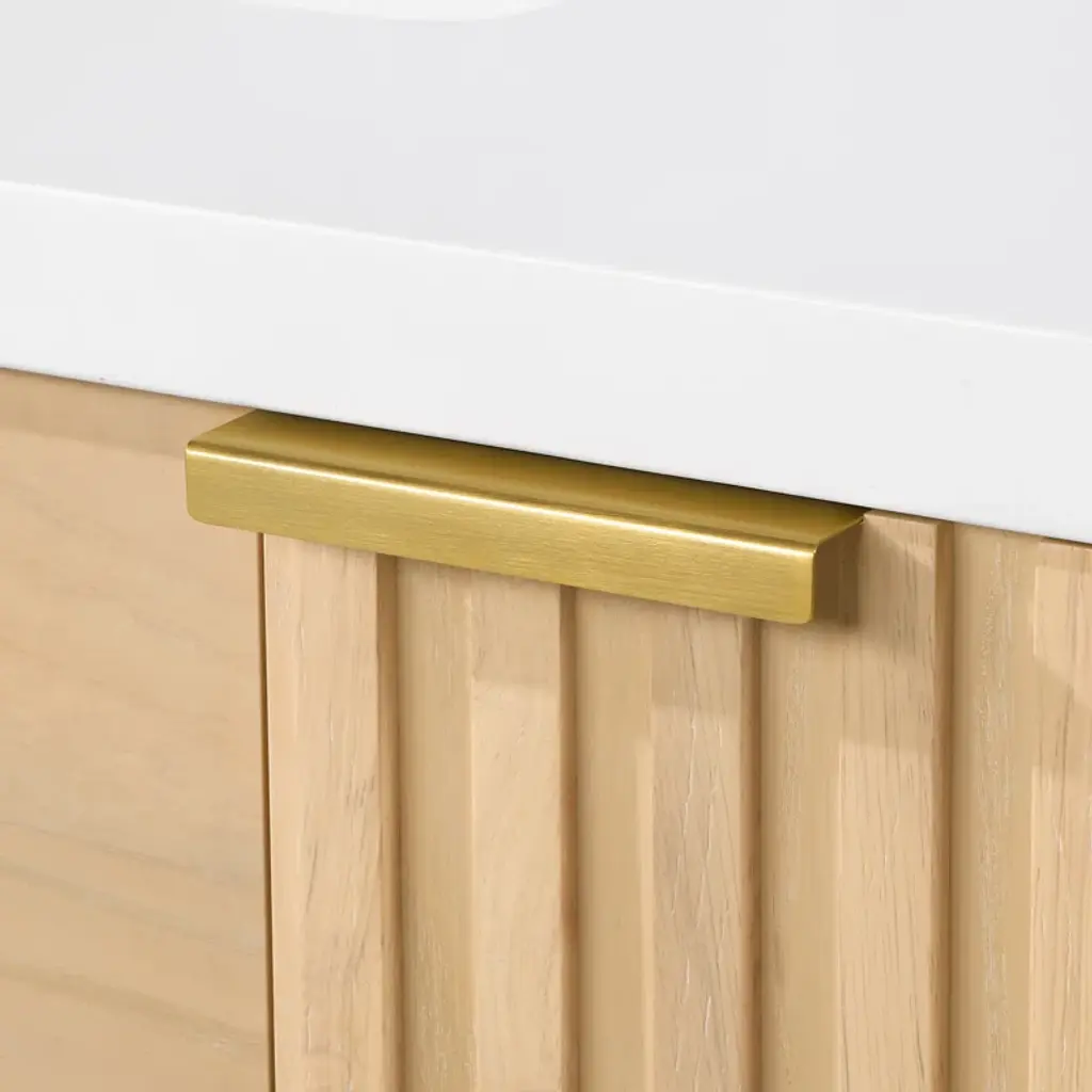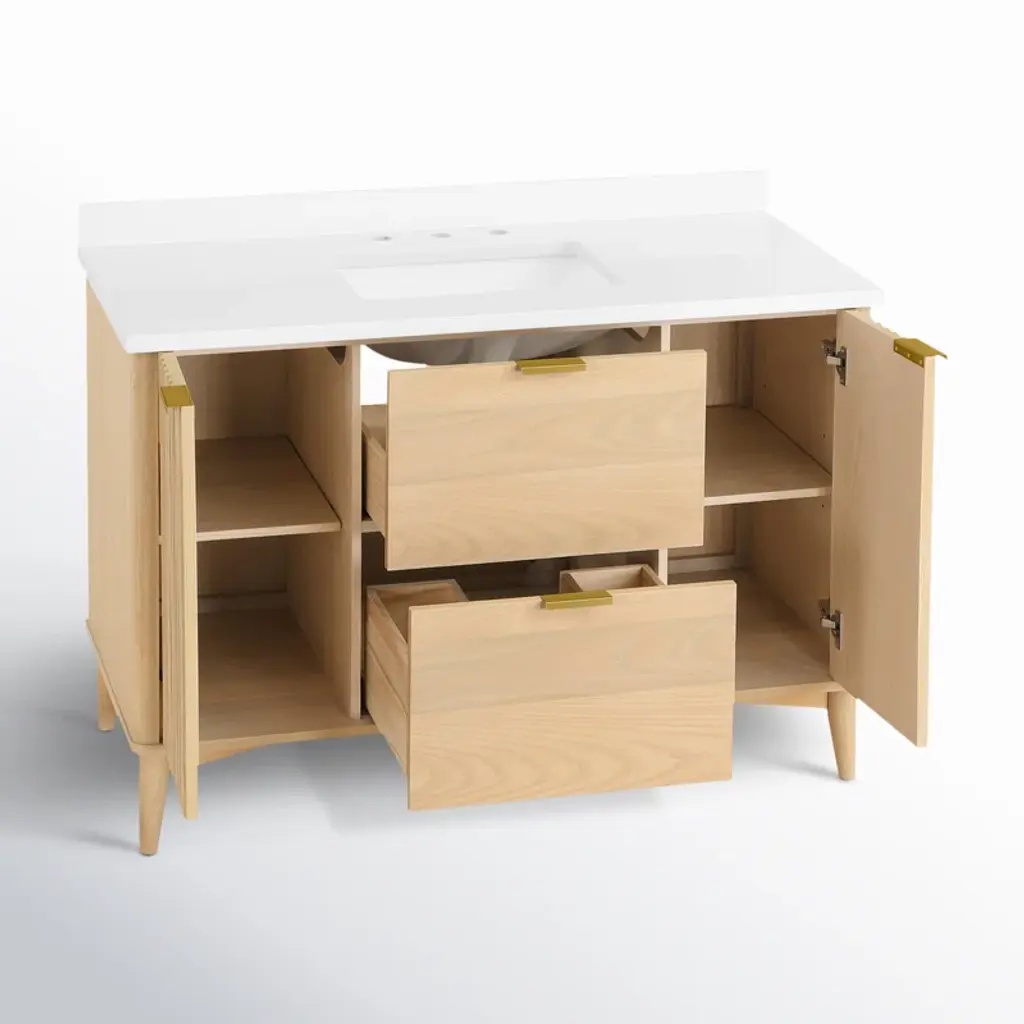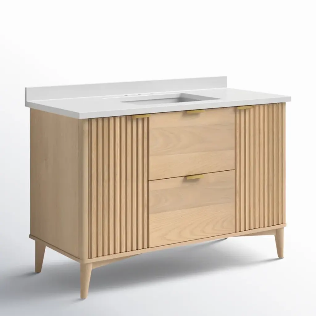 With its clean lines, pale wood tones, and tapered cone legs, this vanity draws inspiration from a Scandinavian aesthetic. Soft-close drawers + channel-detailed cabinet doors with gold hardware reveal ample storage space for your routine essentials. It’s topped with a sleek white marble counter with an integrated white ceramic sink.
