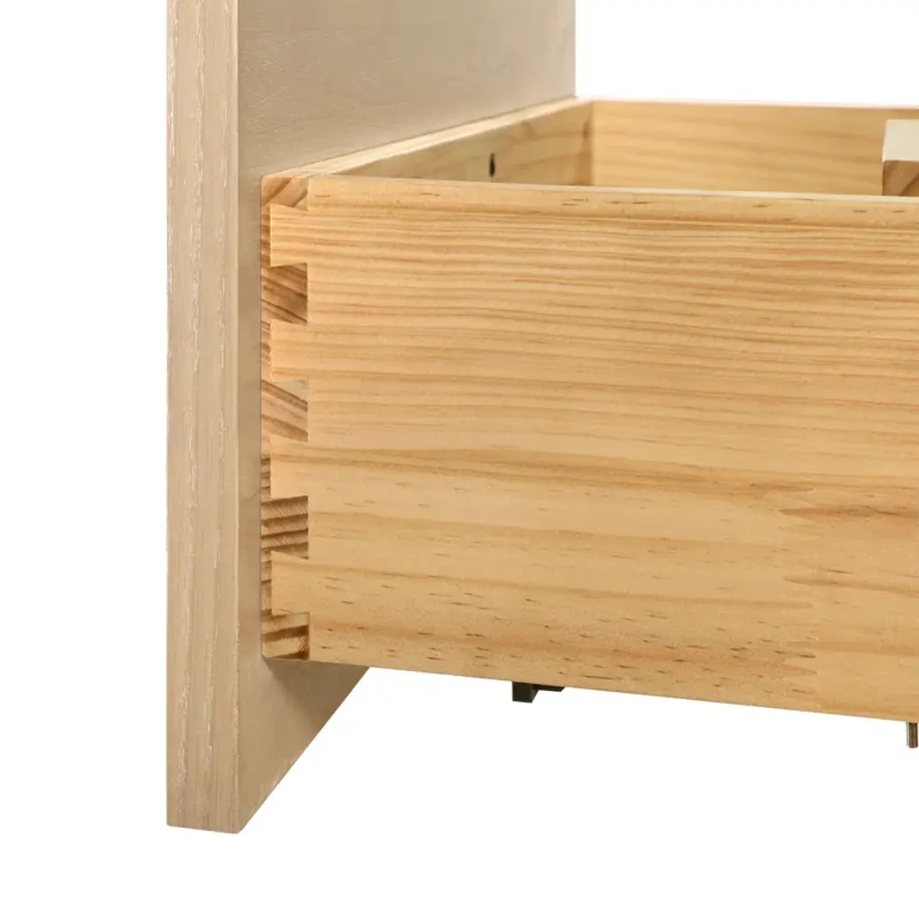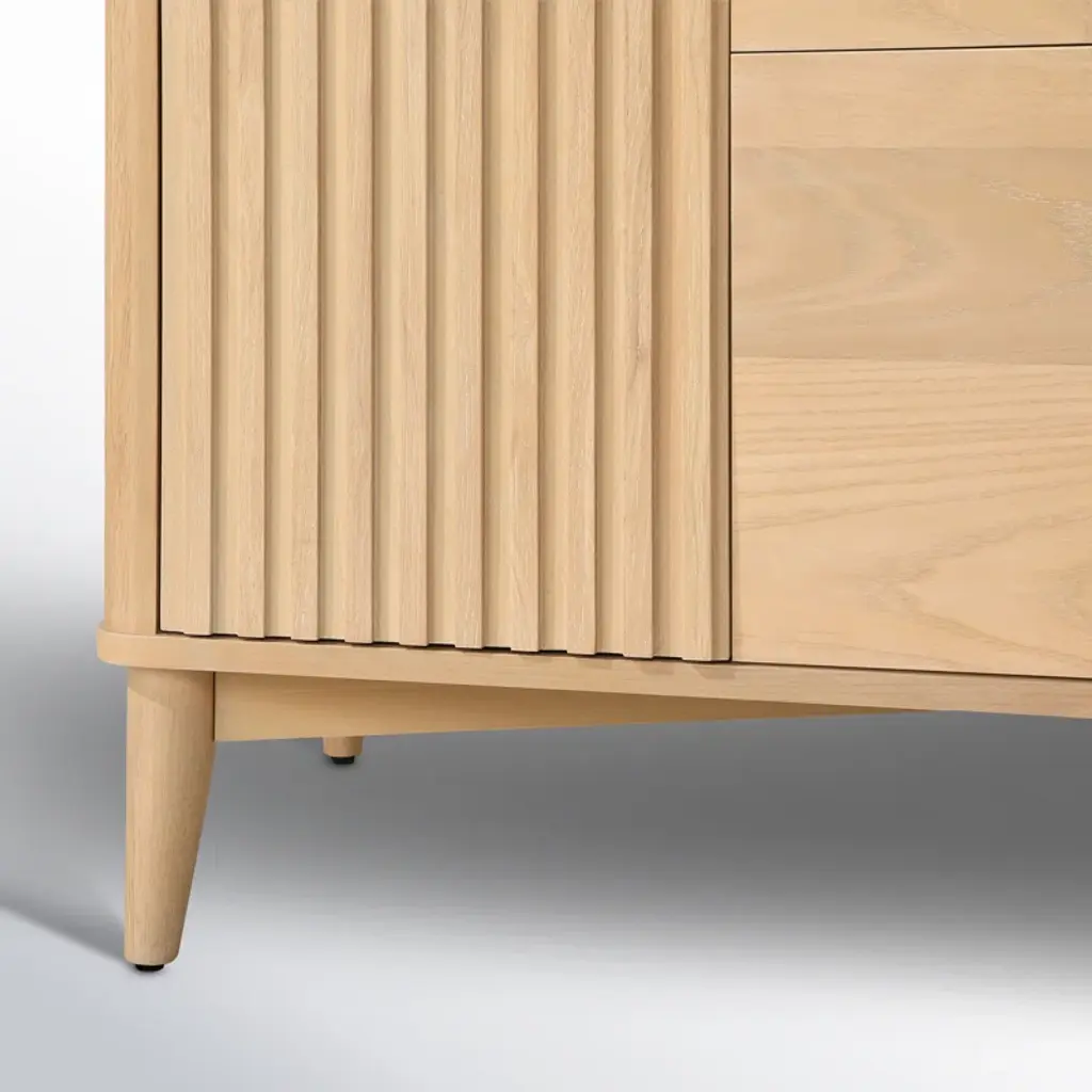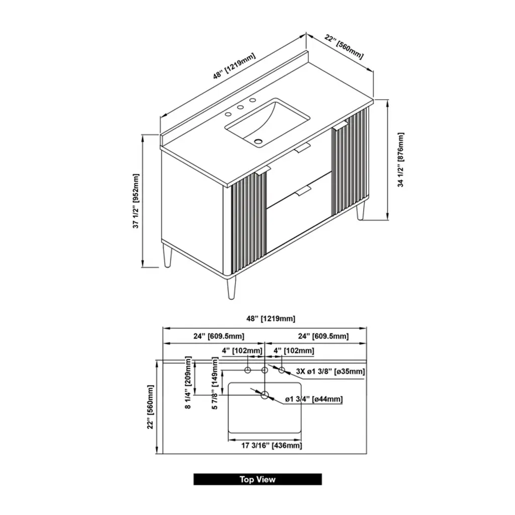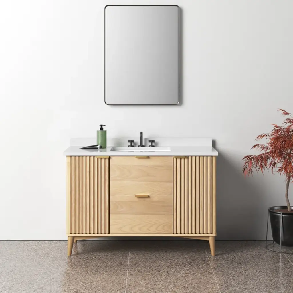With its clean lines, pale wood tones, and tapered cone legs, this vanity draws inspiration from a Scandinavian aesthetic. Soft-close drawers + channel-detailed cabinet doors with gold hardware reveal ample storage space for your routine essentials. It’s topped with a sleek white marble counter with an integrated white ceramic sink.
