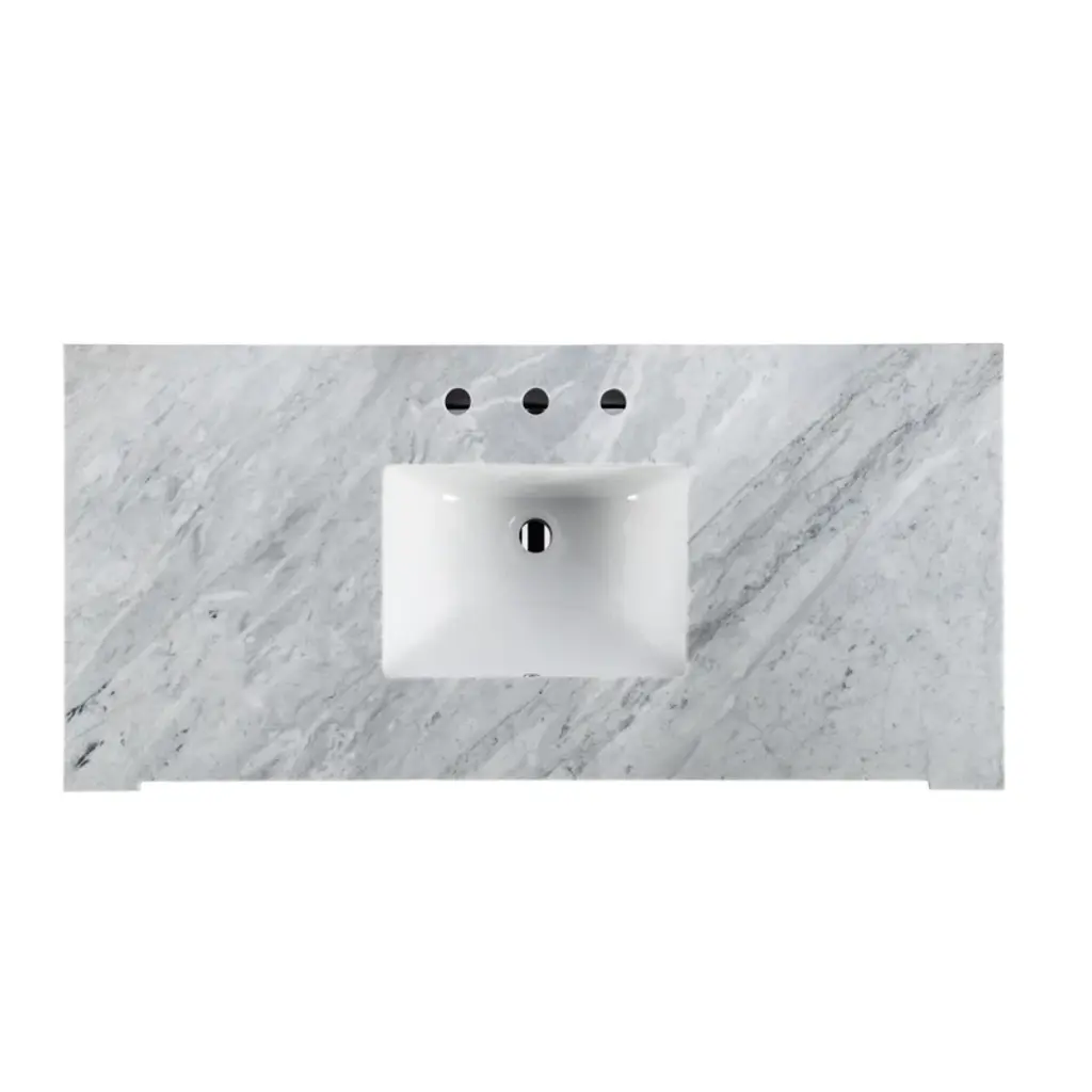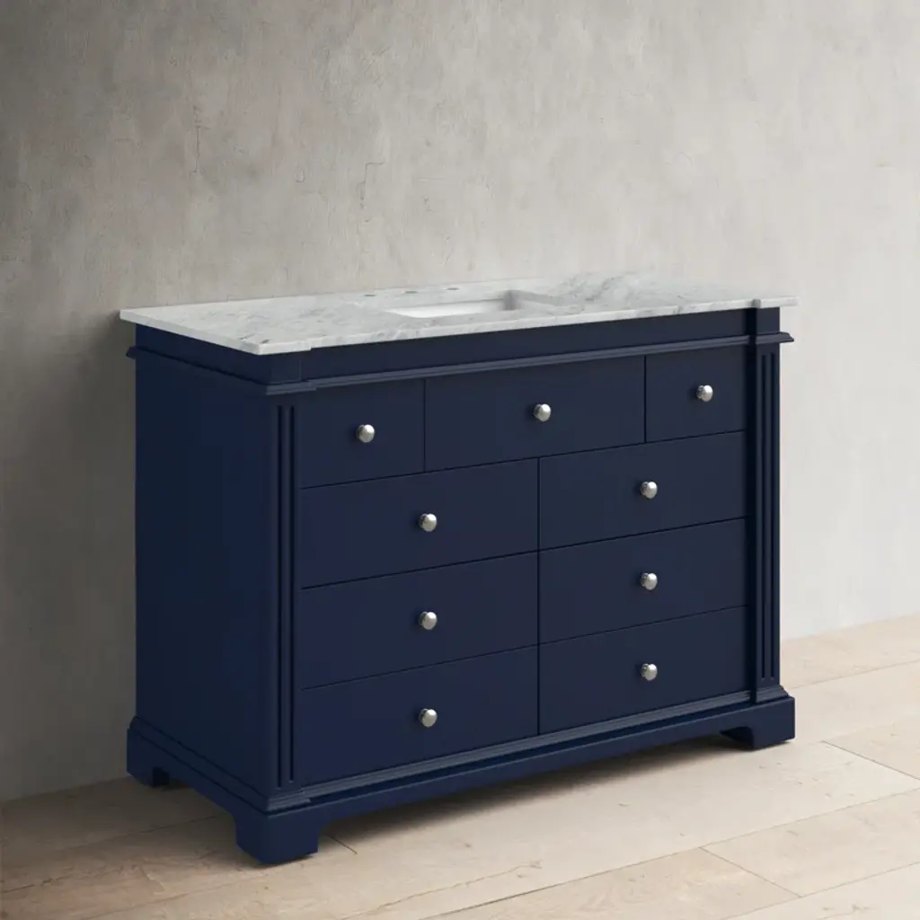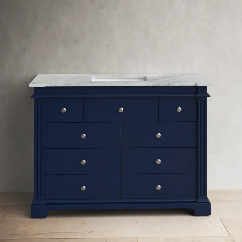 Elevate your bathroom with this handcrafted vanity, featuring a marble countertop and an undermount ceramic sink. The base, made from engineered wood and hardwood, boasts a stunning acacia wood finish. With six functional soft-close drawers and one false drawer, you'll have ample storage for all your bathroom essentials. The brushed nickel hardware adds a touch of sophistication to this piece. Please note that the faucet and mirror are not included. Ideal for residential use, this vanity brings a touch of elegance to any space.