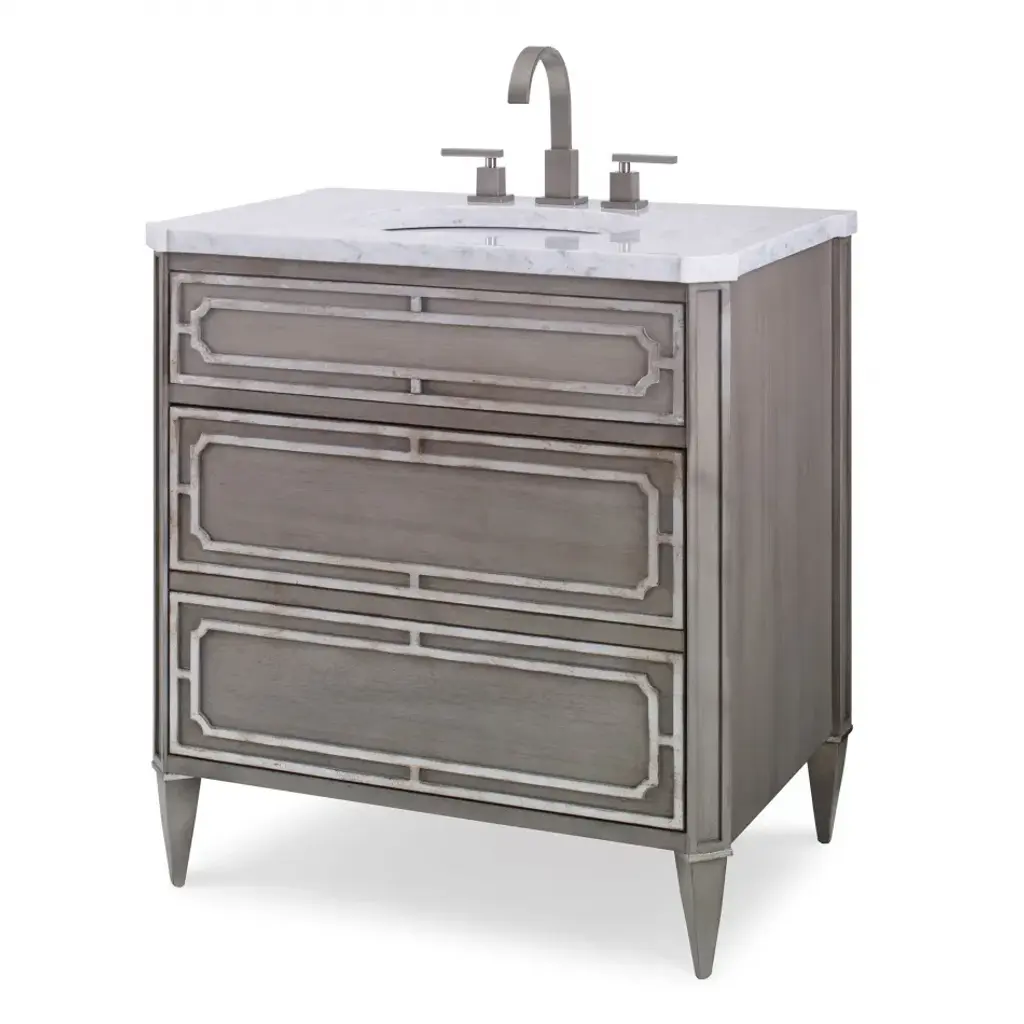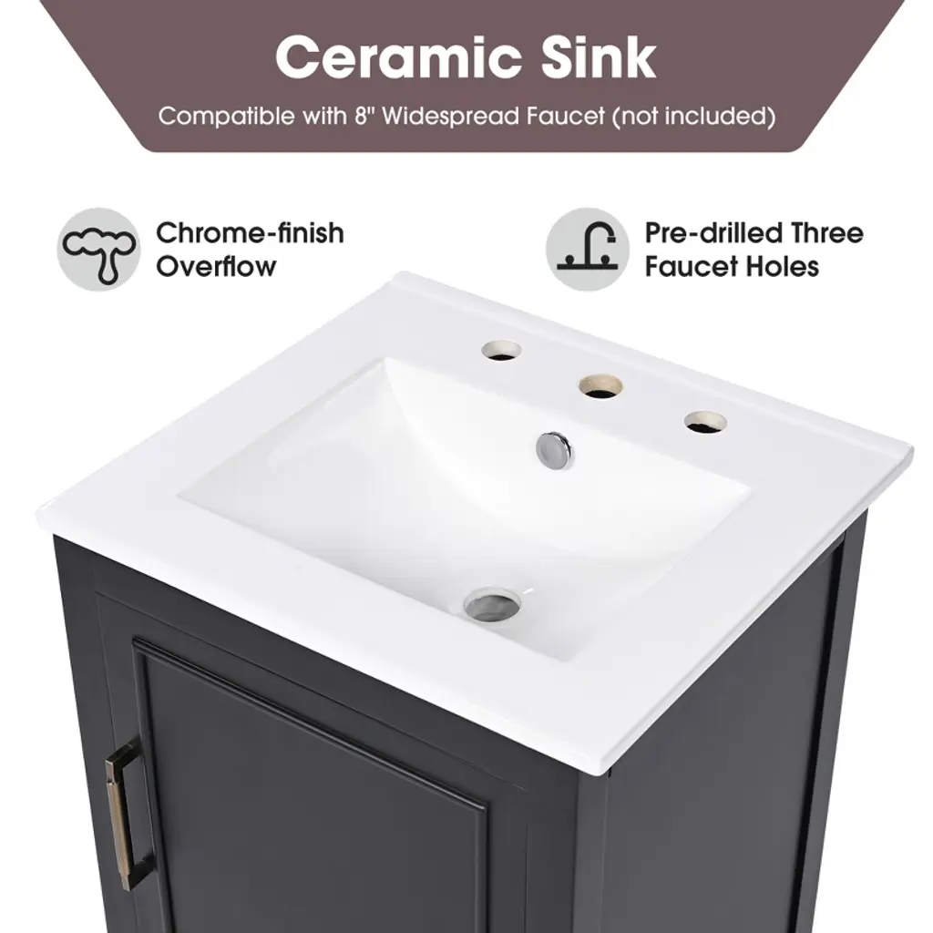Blending modern design with lasting functionality, this bathroom vanity features a sleek silhouette, retro gold hardware, and a smooth painted finish for a timeless aesthetic. The spacious semicircular ceramic sink includes a three-hole faucet mount, overflow protection, and an easy-to-clean glossy surface. Thoughtfully designed for practicality, it offers ample storage through a drawer, cabinet, and interior shelf to keep essentials neatly tucked away. Built from solid wood, the vanity ensures durability and water resistance, perfect for daily use in humid spaces. A stylish, organized solution that elevates any contemporary bathroom. Main Material: Solid Wood+MDF, Ceramic Mounting Type: Freestanding Assembly Required Shape: Rectangular Dimensions: 18.50''D X 20.00''W X 34.40''H