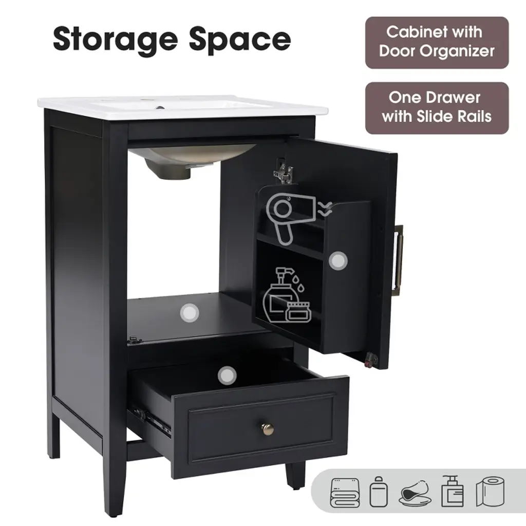 Gdfstudio Modern Teemee 20" Bathroom Vanity With Ceramic Sink, Door Shelf Storage And Drawer, Black