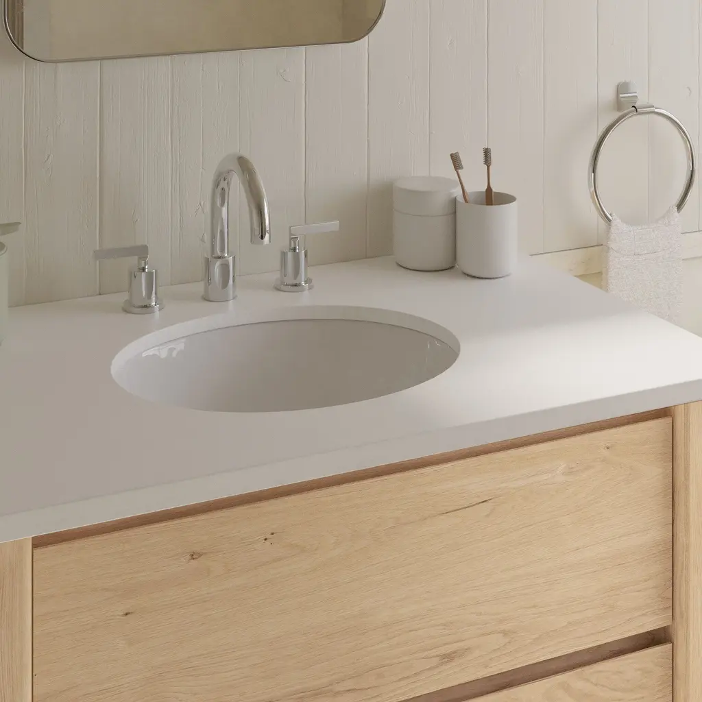 Clean-lined frame covered in your choice of natural finish. Topped with beautiful, bright white quartz. Made from kiln-dried, sustainably sourced wood. Contract Grade, so you know it's built to last.