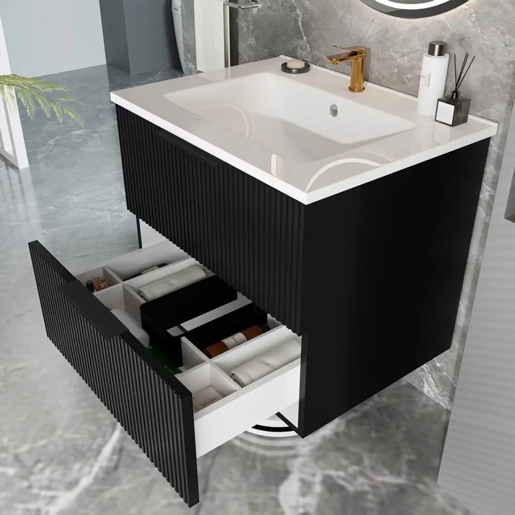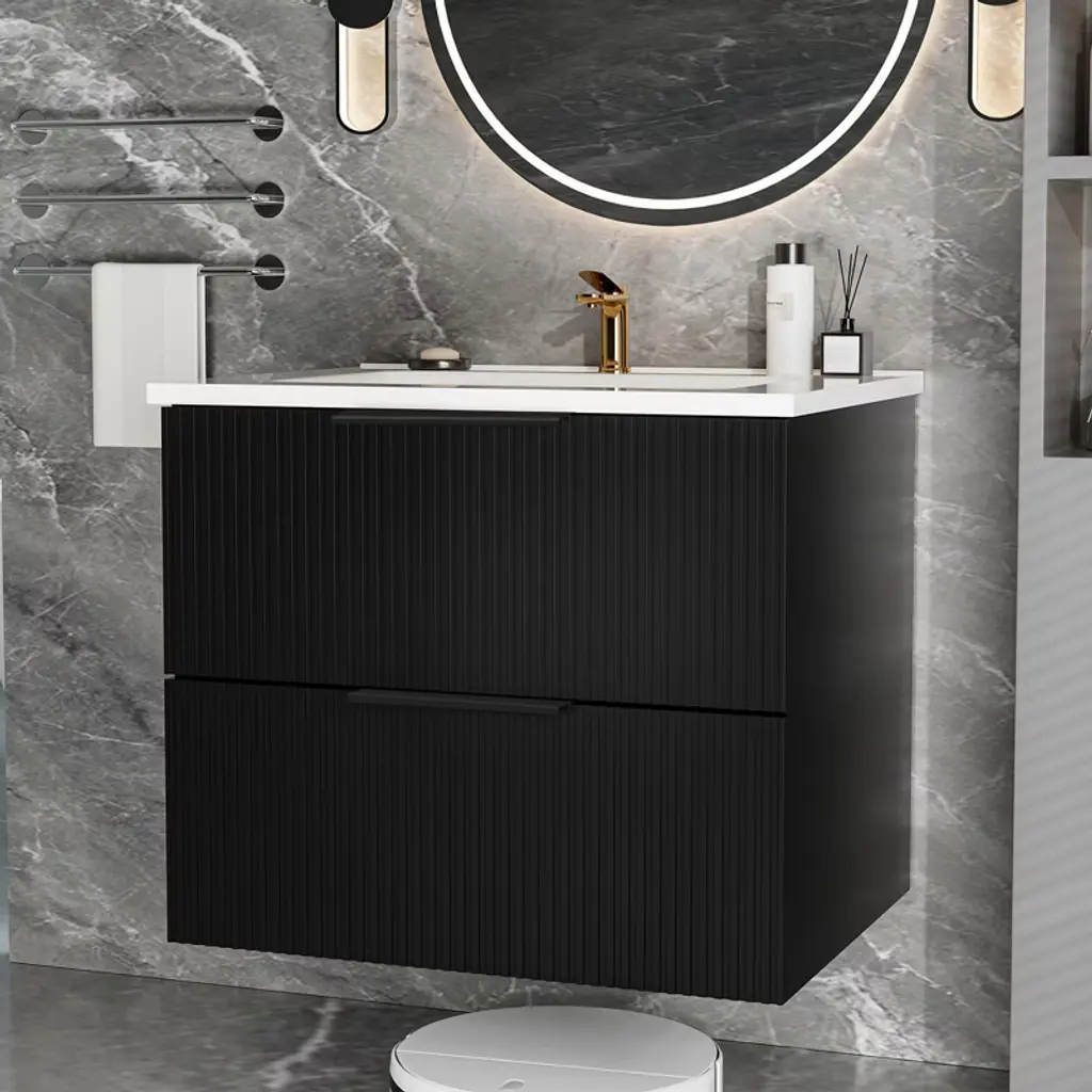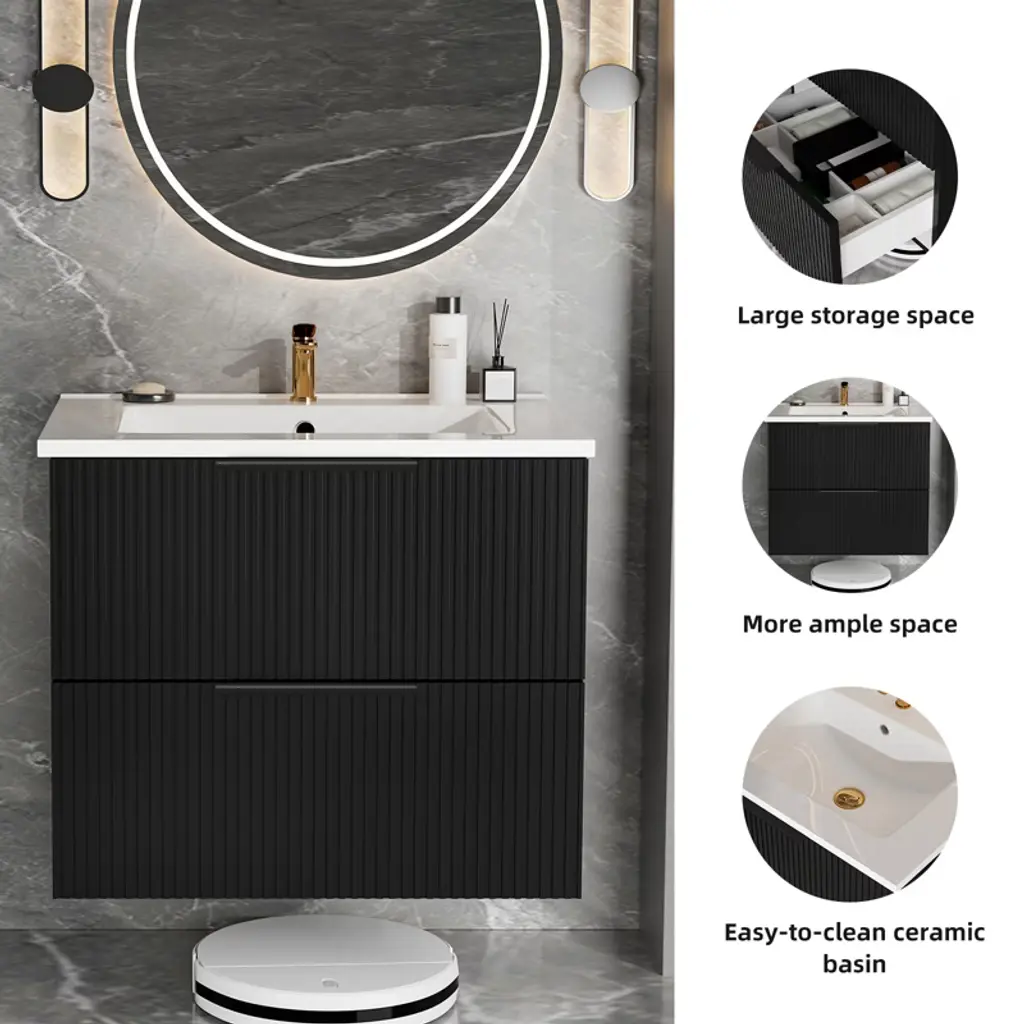 Gulches 24 Inch Black Wall Mounted Floating Fluted Bathroom Vanity With Ceramic Sink