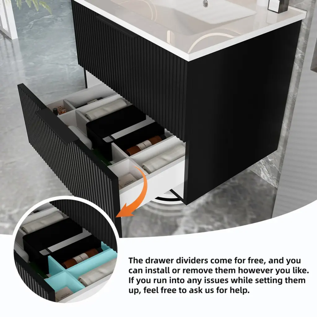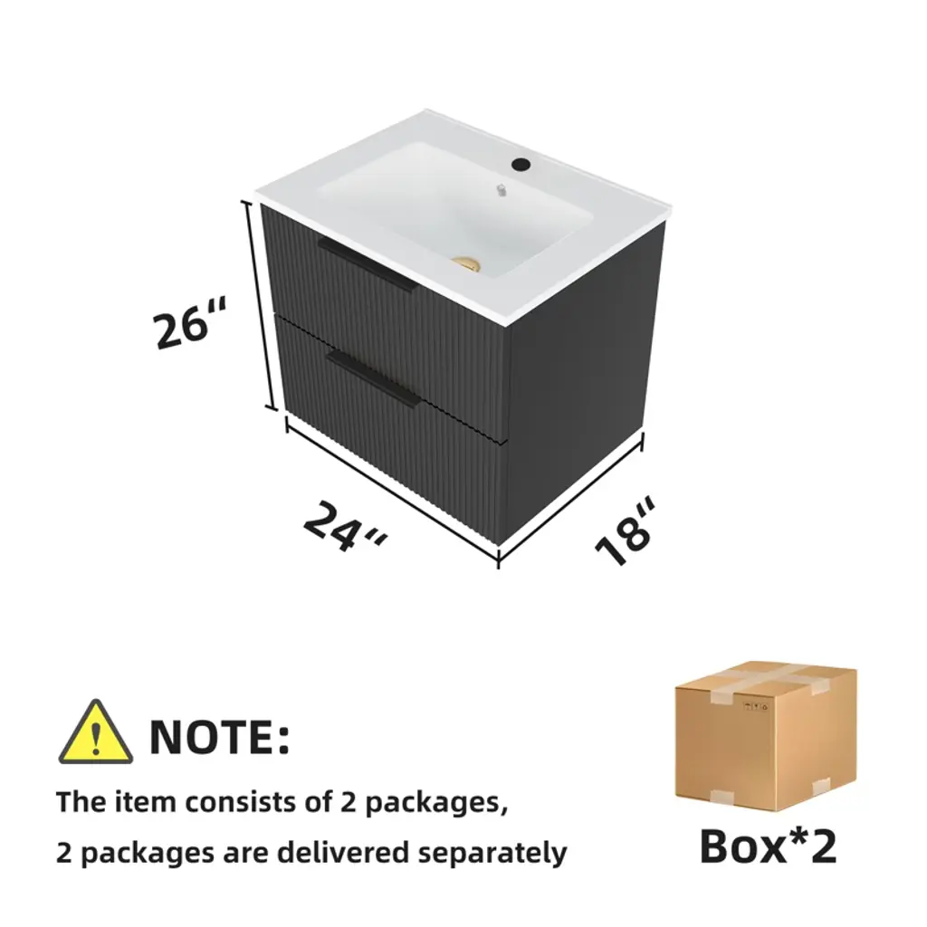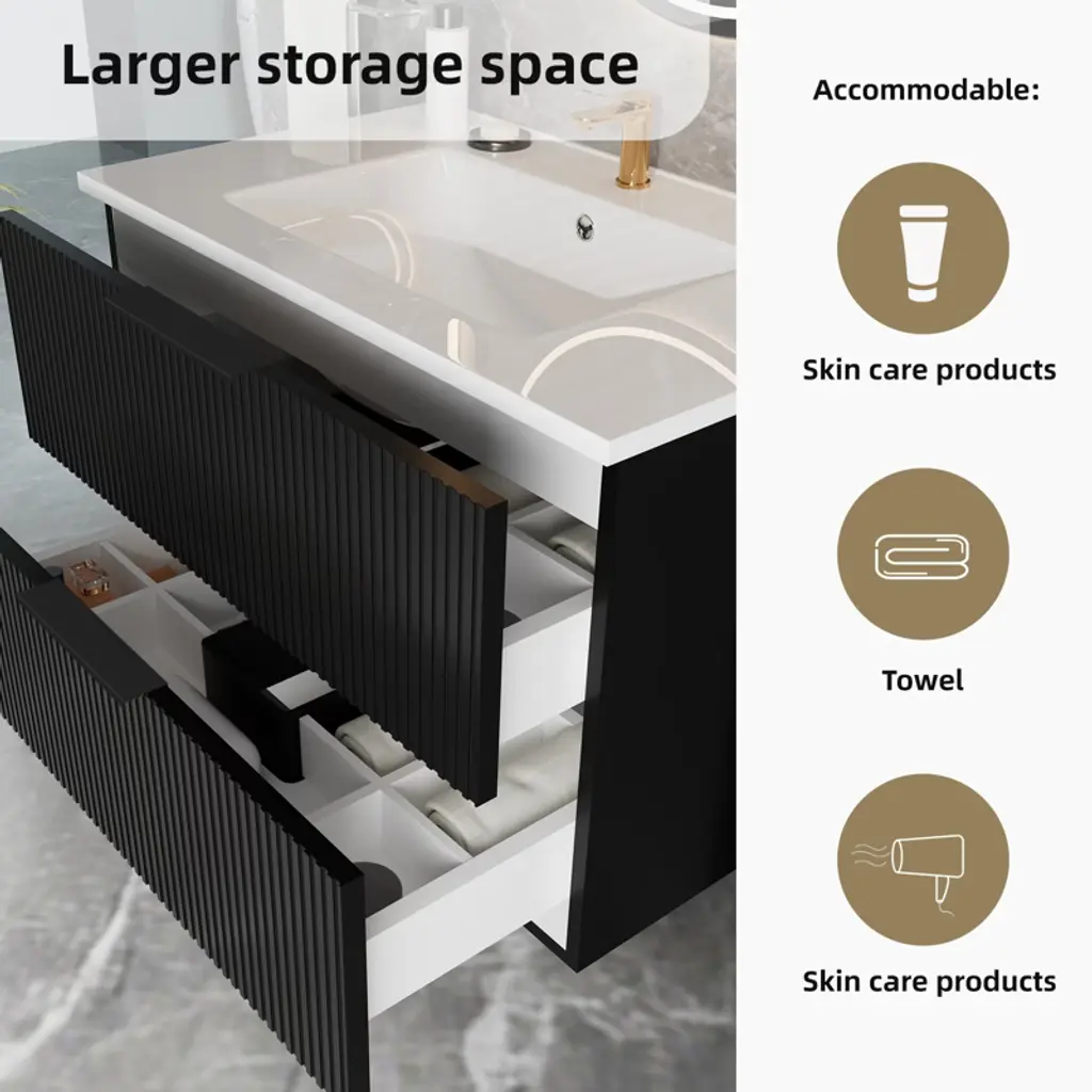 Gulches 24 Inch Black Wall Mounted Floating Fluted Bathroom Vanity With Ceramic Sink