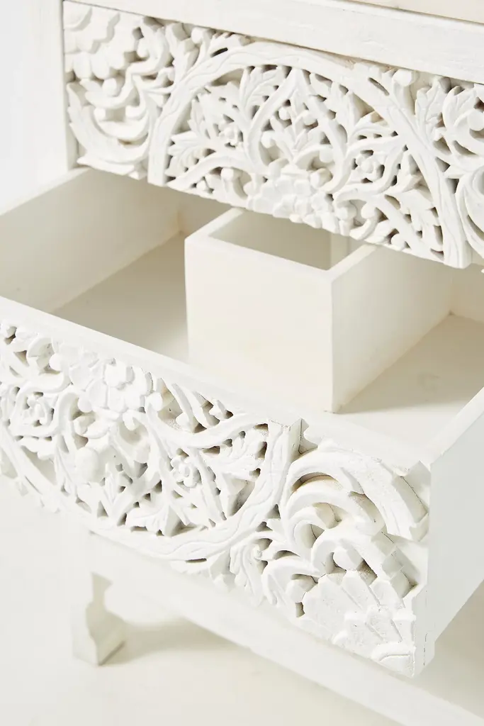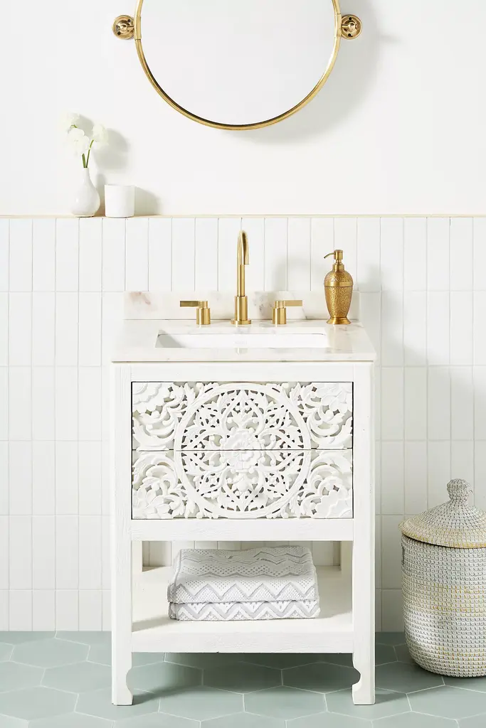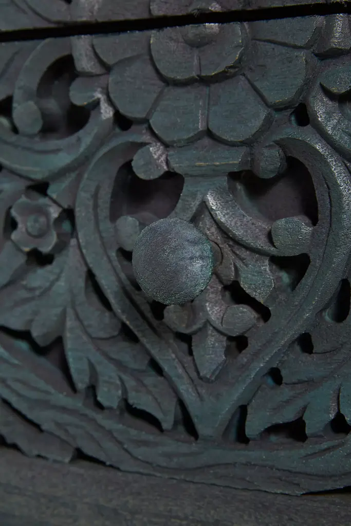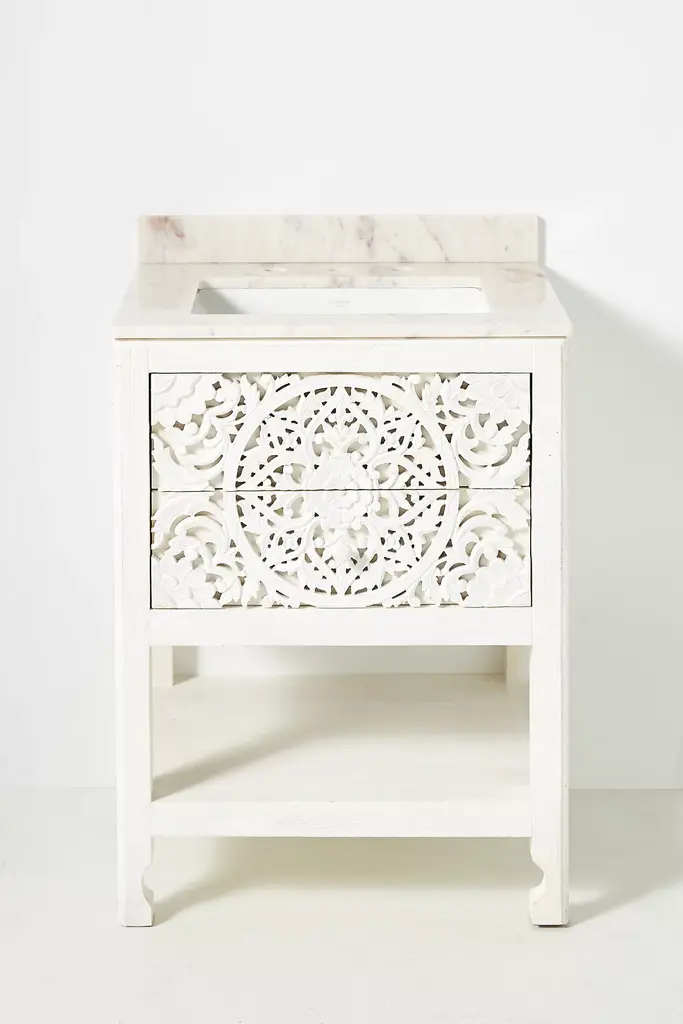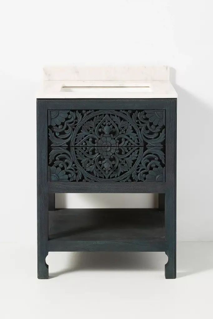 Handcarved from tropical hardwood, this elegant bathroom vanity is a true work of art. Its filigree-inspired cutouts create a breathable space where shadows and sunlight play.For ordering assistance and more, please contact us. For aesthetic advice and tips to help decorate your space, enjoy our complimentary home styling services.For more information on the materials and techniques of this piece, click here.