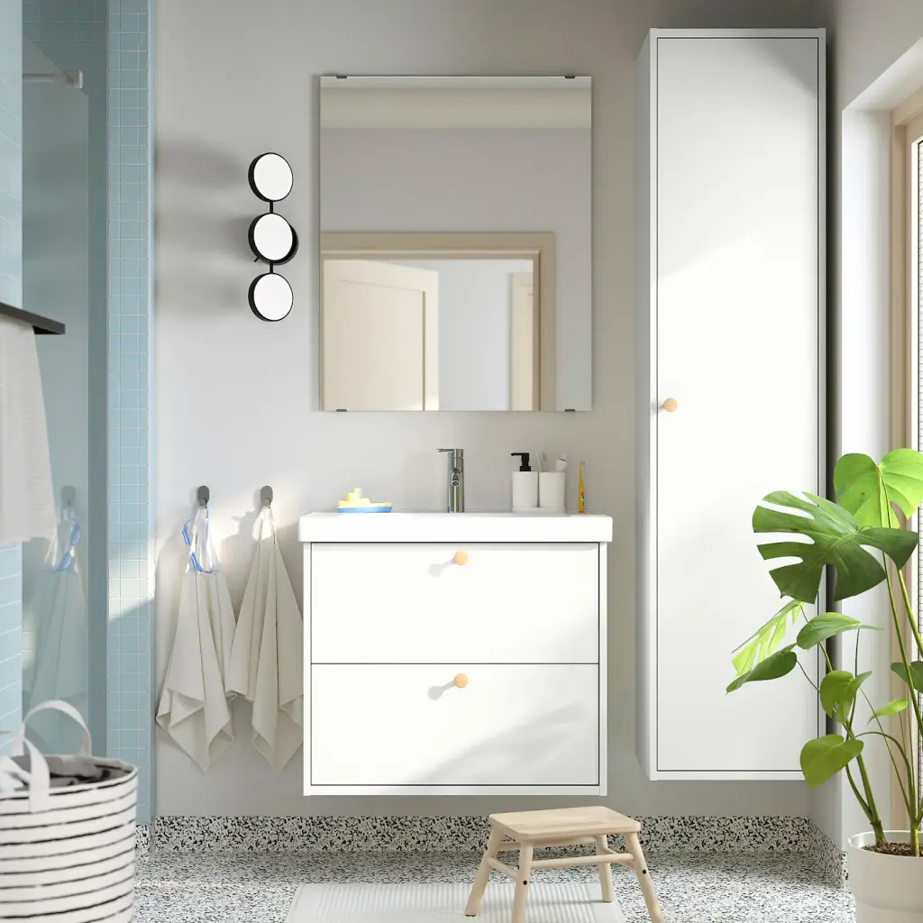 HAVBÄCK Bathroom vanity with drawers - white 30x21x25 1/8 ". Generous, full drawer storage capacity for all your essentials as piping is led through the back and not via a cut-out in the drawers. Drawers open all the way for a good overview. Suitable for both wall- and floor-mounted water outlet.