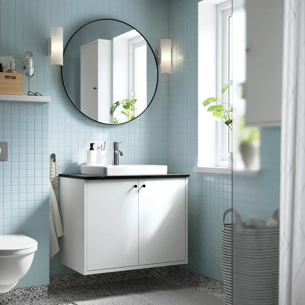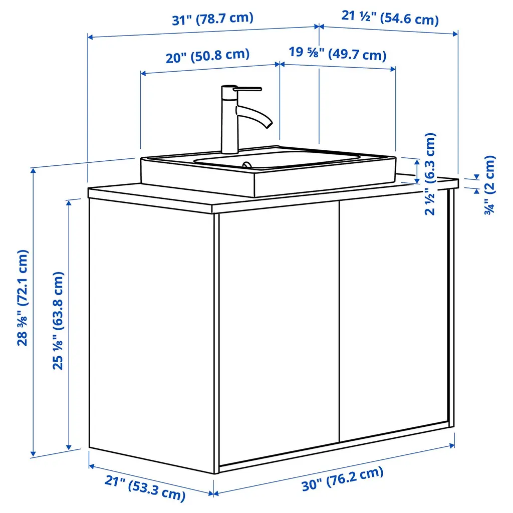 HAVBÄCK / ORRSJÖN Bathroom vanity w doors/sink/faucet - white/black marble effect 31x21 1/2x28 3/8 ". Closed storage with capacity for bulkier or taller items, like bottles and baskets, keeping them dust-free and out of sight. This product bears the CE mark. Knobs and handles are sold separately.