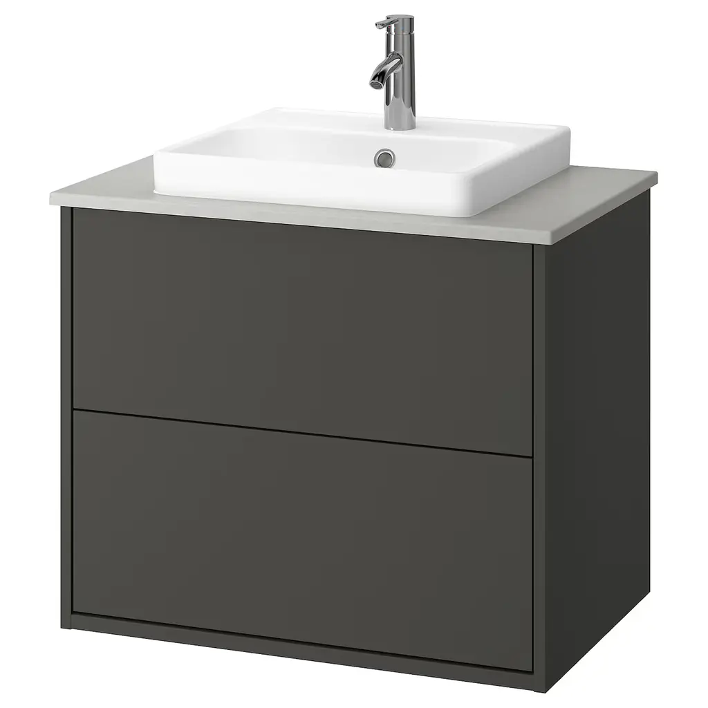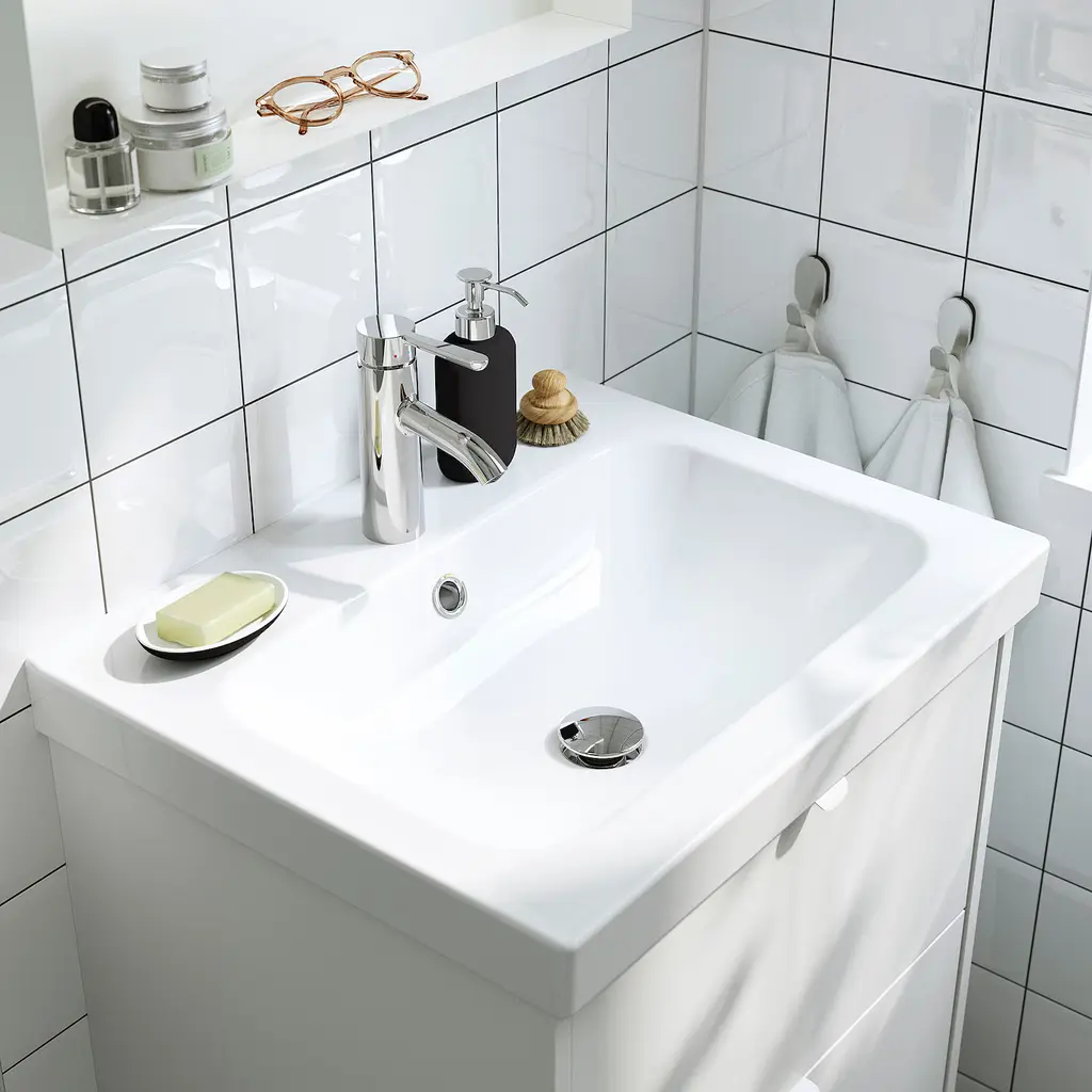 HAVBÄCK / ORRSJÖN Bathroom vanity with sink & faucet - beige 25x21 3/4x27 5/8 ". Generous, full drawer storage capacity for all your essentials as piping is led through the back and not via a cut-out in the drawers. Drawers open all the way for a good overview. This product bears the CE mark.