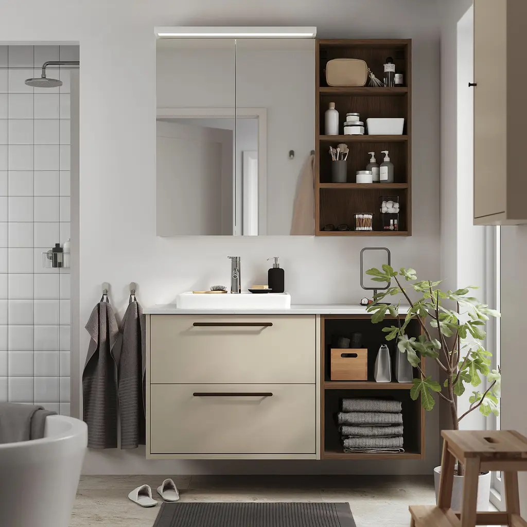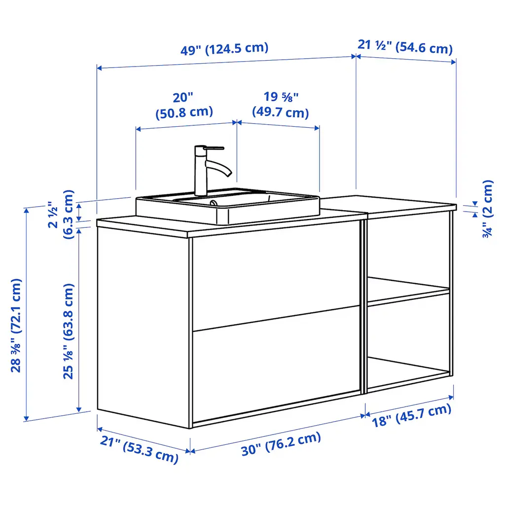 HAVBÄCK / ORRSJÖN Bathroom vanity with sink & faucet - beige/brown oak effect/white marble effect 49x21 1/2x28 3/8 ". Depending on your space and needs, complete this solution with your choice of a mirror or mirror cabinet from our range, sold separately. This product bears the CE mark.