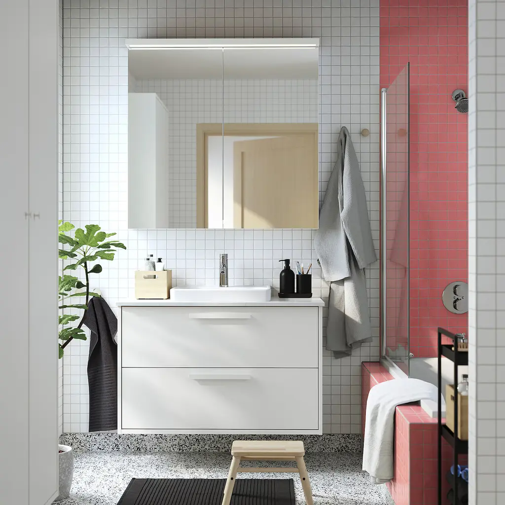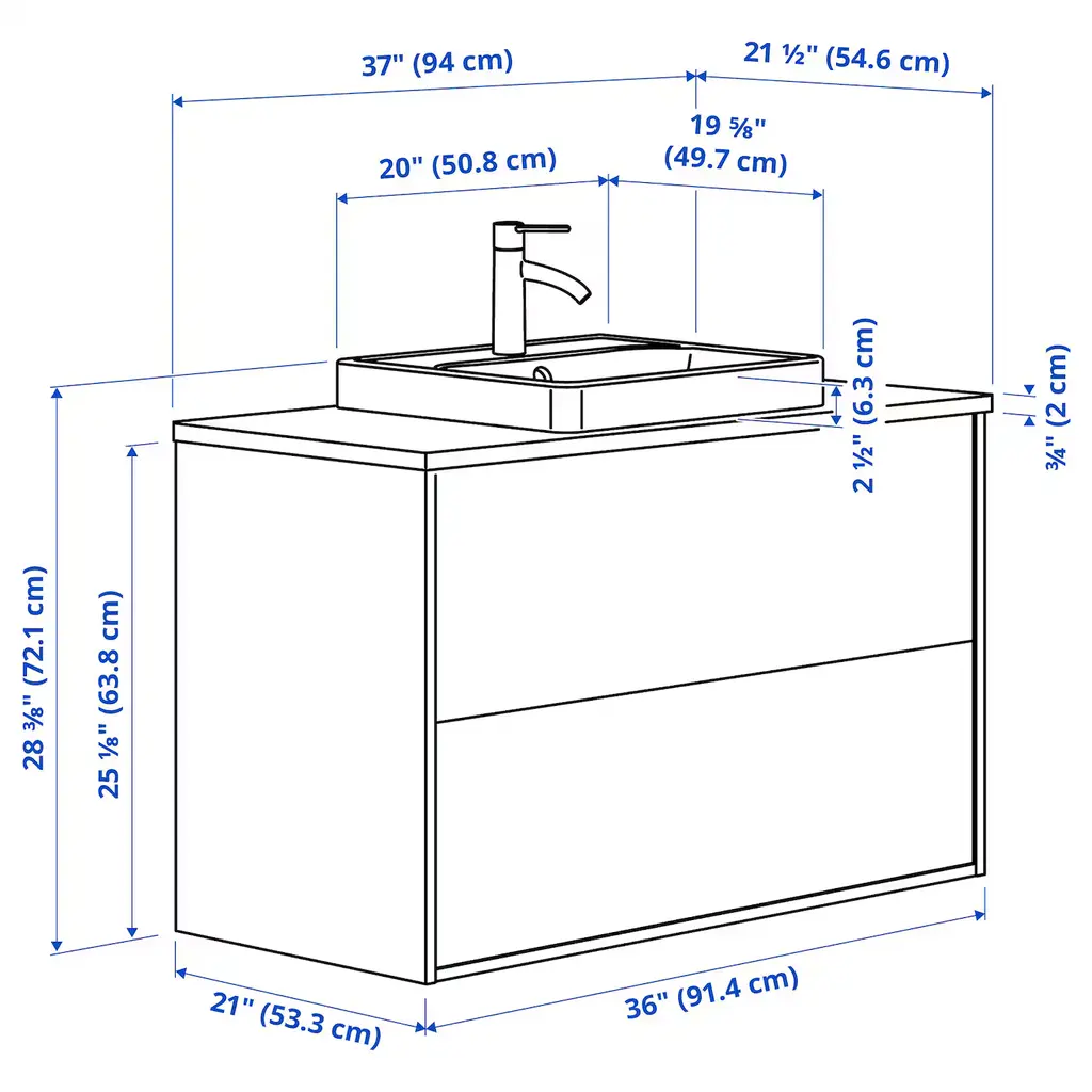 HAVBÄCK / ORRSJÖN Bathroom vanity with sink & faucet - white/white marble effect 37x21 1/2x28 3/8 ". Generous, full drawer storage capacity for all your essentials as piping is led through the back and not via a cut-out in the drawers. Drawers open all the way for a good overview.