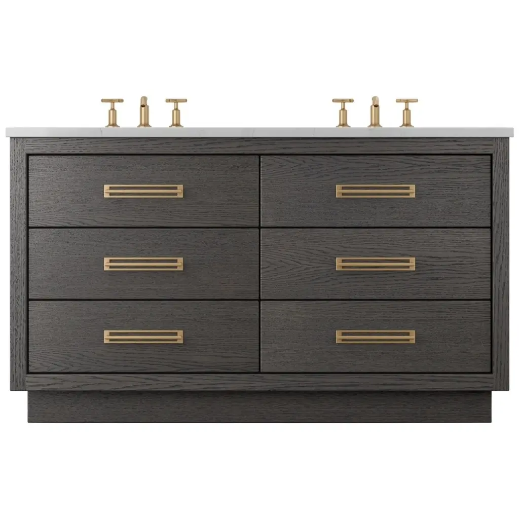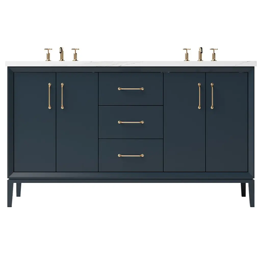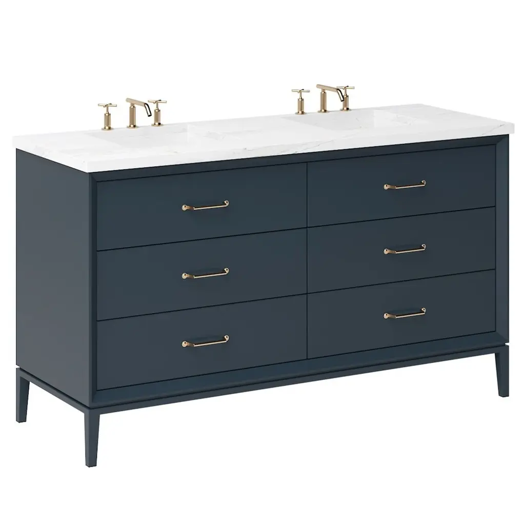 Embrace the timeless elegance of the Hawthorne Double Drawer Bathroom Vanity, a masterpiece that captures the essence of mid-century revival style. This freestanding vanity is a symphony of design, featuring an exquisitely angled frame and gracefully tapered legs that evoke a sense of nostalgia and sophistication. The double vanity is thoughtfully crafted with four u-shaped drawers, each equipped with soft close drawer glides, ensuring a whisper-quiet closure that speaks to the quality and care in its construction. Two false fronts add a touch of intrigue, enhancing its seamless appearance. With a variety of unique finishes and sizes, the Hawthorne Vanity offers a versatile solution that harmonizes with any bathroom decor, inviting you to indulge in its beauty and functionality.