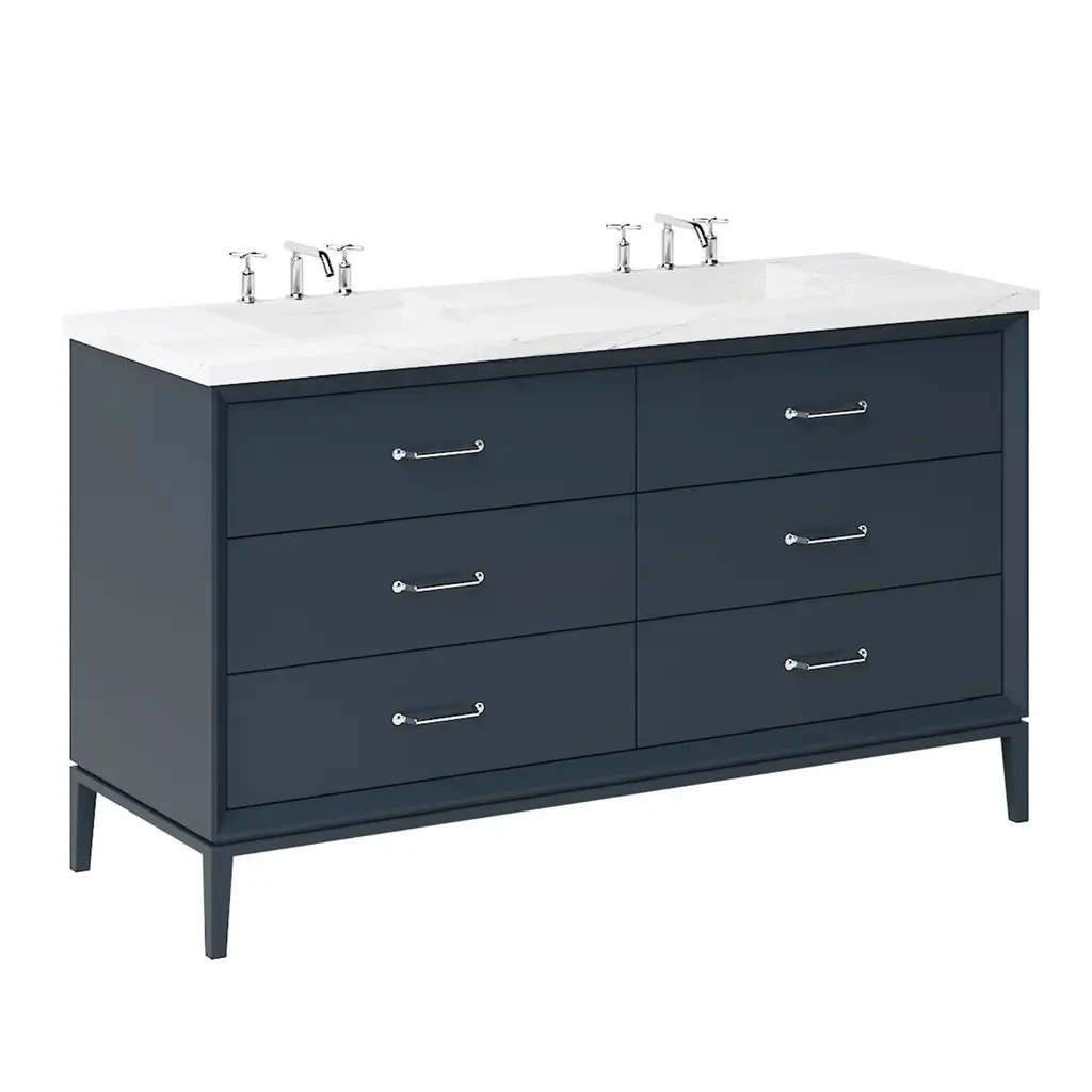 Embrace the timeless elegance of the Hawthorne Double Drawer Bathroom Vanity, a masterpiece that captures the essence of mid-century revival style. This freestanding vanity is a symphony of design, featuring an exquisitely angled frame and gracefully tapered legs that evoke a sense of nostalgia and sophistication. The double vanity is thoughtfully crafted with four u-shaped drawers, each equipped with soft close drawer glides, ensuring a whisper-quiet closure that speaks to the quality and care in its construction. Two false fronts add a touch of intrigue, enhancing its seamless appearance. With a variety of unique finishes and sizes, the Hawthorne Vanity offers a versatile solution that harmonizes with any bathroom decor, inviting you to indulge in its beauty and functionality.