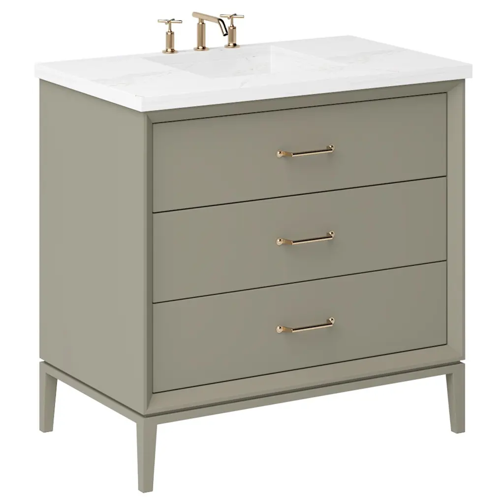 Embrace the timeless allure of the Hawthorne Three-Drawer Single Bathroom Vanity, where mid-century revival style meets modern elegance. This freestanding masterpiece is a testament to exquisite design, featuring an angled frame and gracefully tapered legs that exude sophistication. The vanity's false front and two u-shaped soft close drawers offer both charm and practicality, ensuring a seamless blend of form and function. Available in a variety of unique finishes and sizes, the Hawthorne vanity invites you to create a personal sanctuary that reflects your distinct taste. Let this captivating piece transform your bathroom into a haven of style and serenity.
