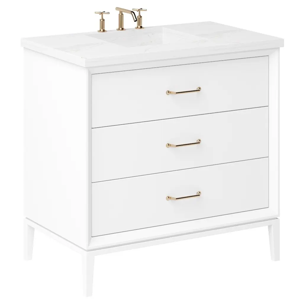 Embrace the timeless allure of the Hawthorne Three-Drawer Single Bathroom Vanity, where mid-century revival style meets modern elegance. This freestanding masterpiece is a testament to exquisite design, featuring an angled frame and gracefully tapered legs that exude sophistication. The vanity's false front and two u-shaped soft close drawers offer both charm and practicality, ensuring a seamless blend of form and function. Available in a variety of unique finishes and sizes, the Hawthorne vanity invites you to create a personal sanctuary that reflects your distinct taste. Let this captivating piece transform your bathroom into a haven of style and serenity.