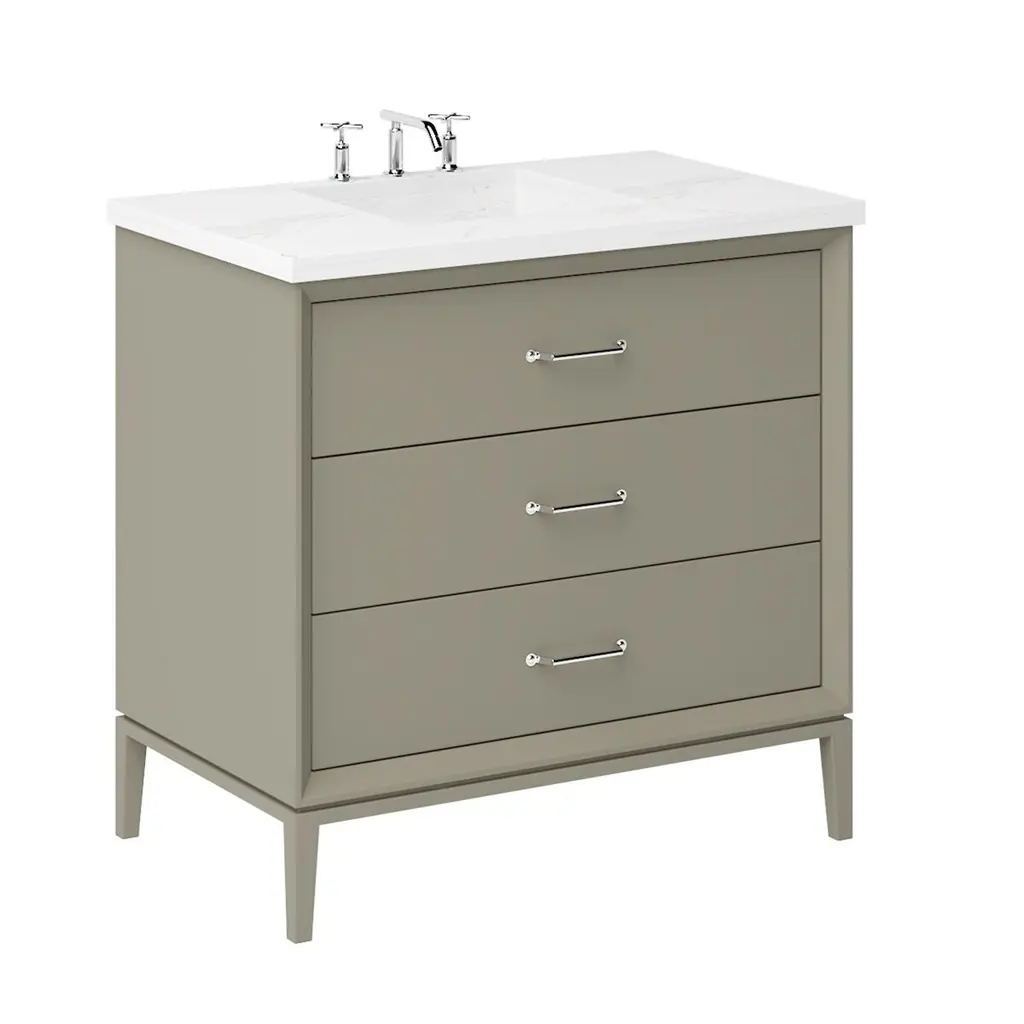 Embrace the timeless allure of the Hawthorne Three-Drawer Single Bathroom Vanity, where mid-century revival style meets modern elegance. This freestanding masterpiece is a testament to exquisite design, featuring an angled frame and gracefully tapered legs that exude sophistication. The vanity's false front and two u-shaped soft close drawers offer both charm and practicality, ensuring a seamless blend of form and function. Available in a variety of unique finishes and sizes, the Hawthorne vanity invites you to create a personal sanctuary that reflects your distinct taste. Let this captivating piece transform your bathroom into a haven of style and serenity.