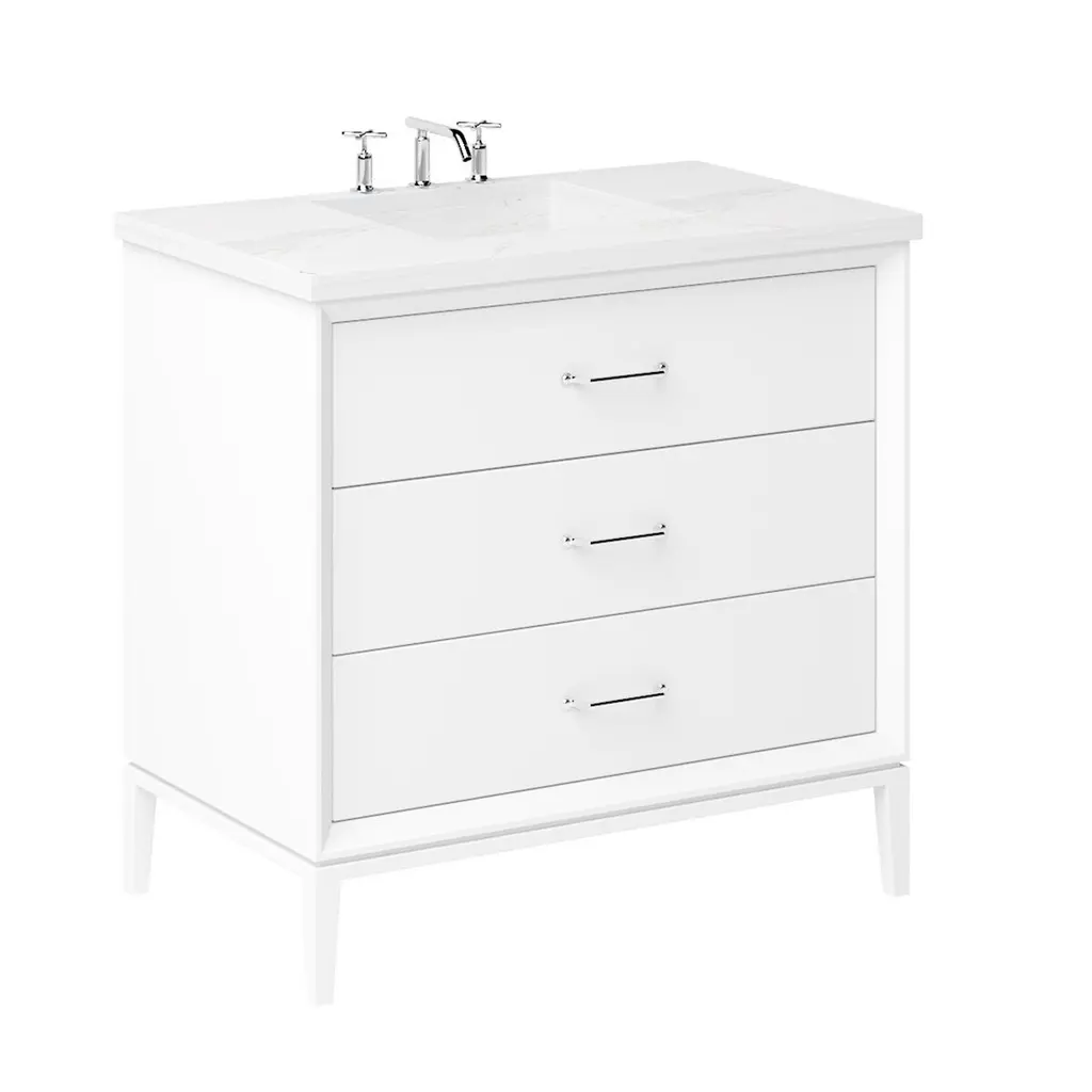 Embrace the timeless allure of the Hawthorne Three-Drawer Single Bathroom Vanity, where mid-century revival style meets modern elegance. This freestanding masterpiece is a testament to exquisite design, featuring an angled frame and gracefully tapered legs that exude sophistication. The vanity's false front and two u-shaped soft close drawers offer both charm and practicality, ensuring a seamless blend of form and function. Available in a variety of unique finishes and sizes, the Hawthorne vanity invites you to create a personal sanctuary that reflects your distinct taste. Let this captivating piece transform your bathroom into a haven of style and serenity.