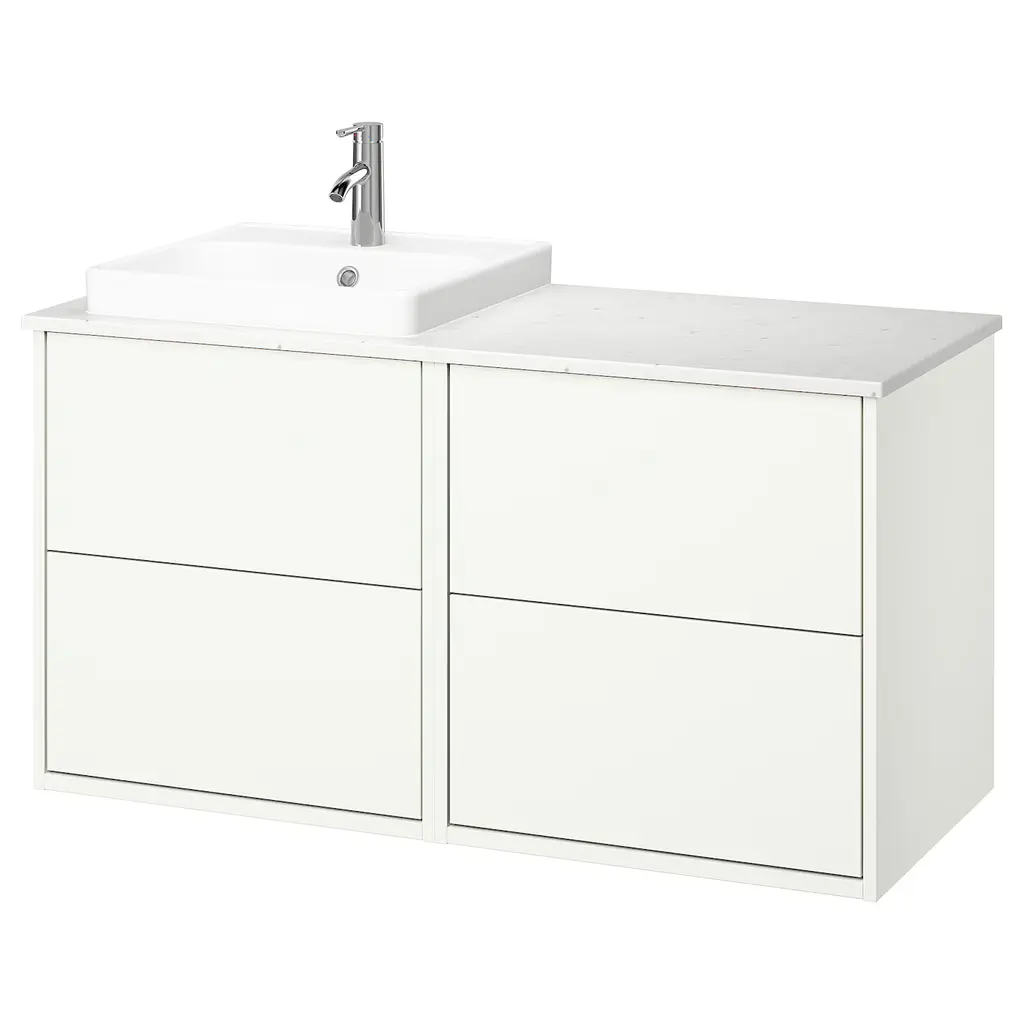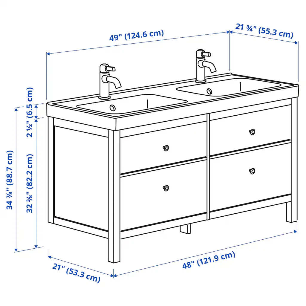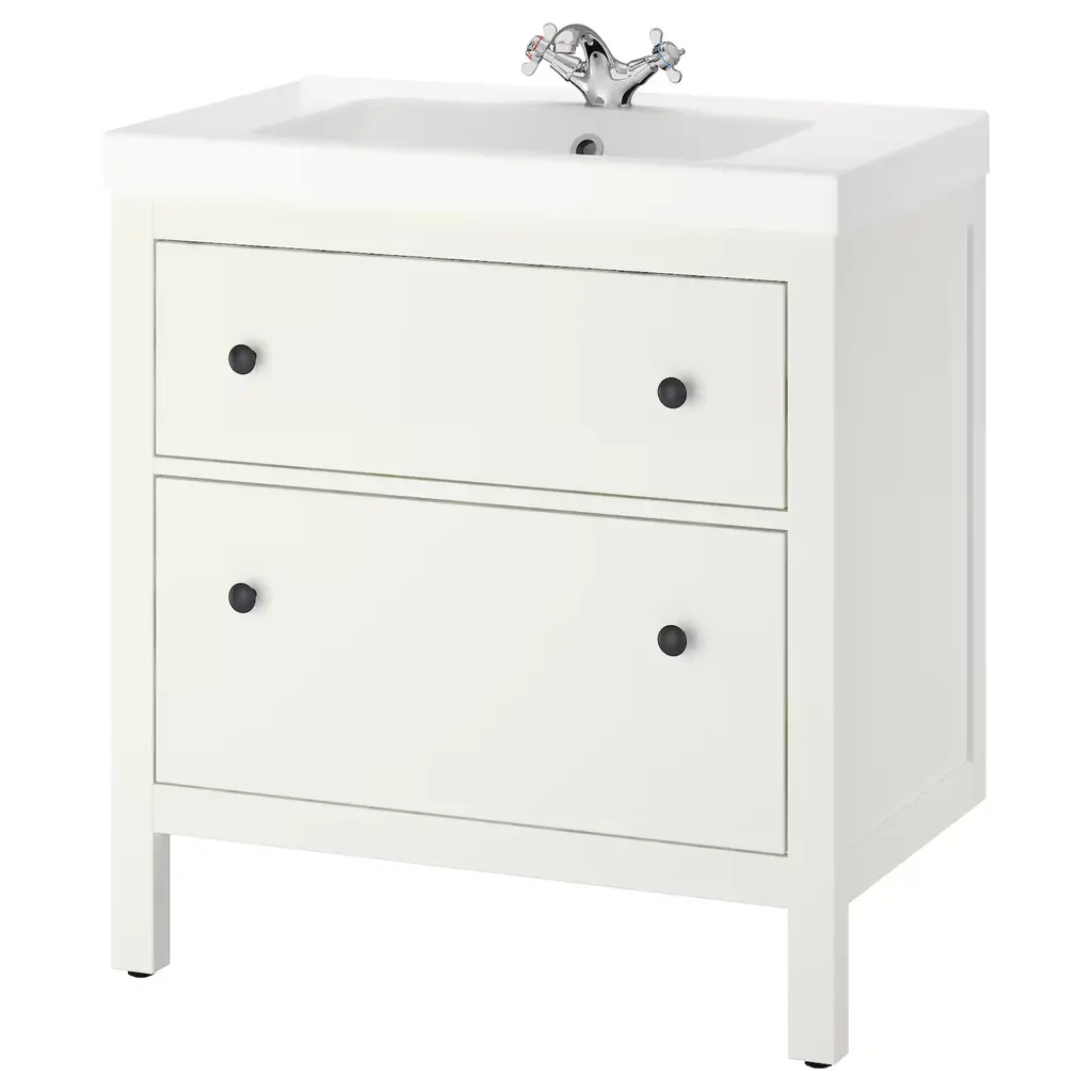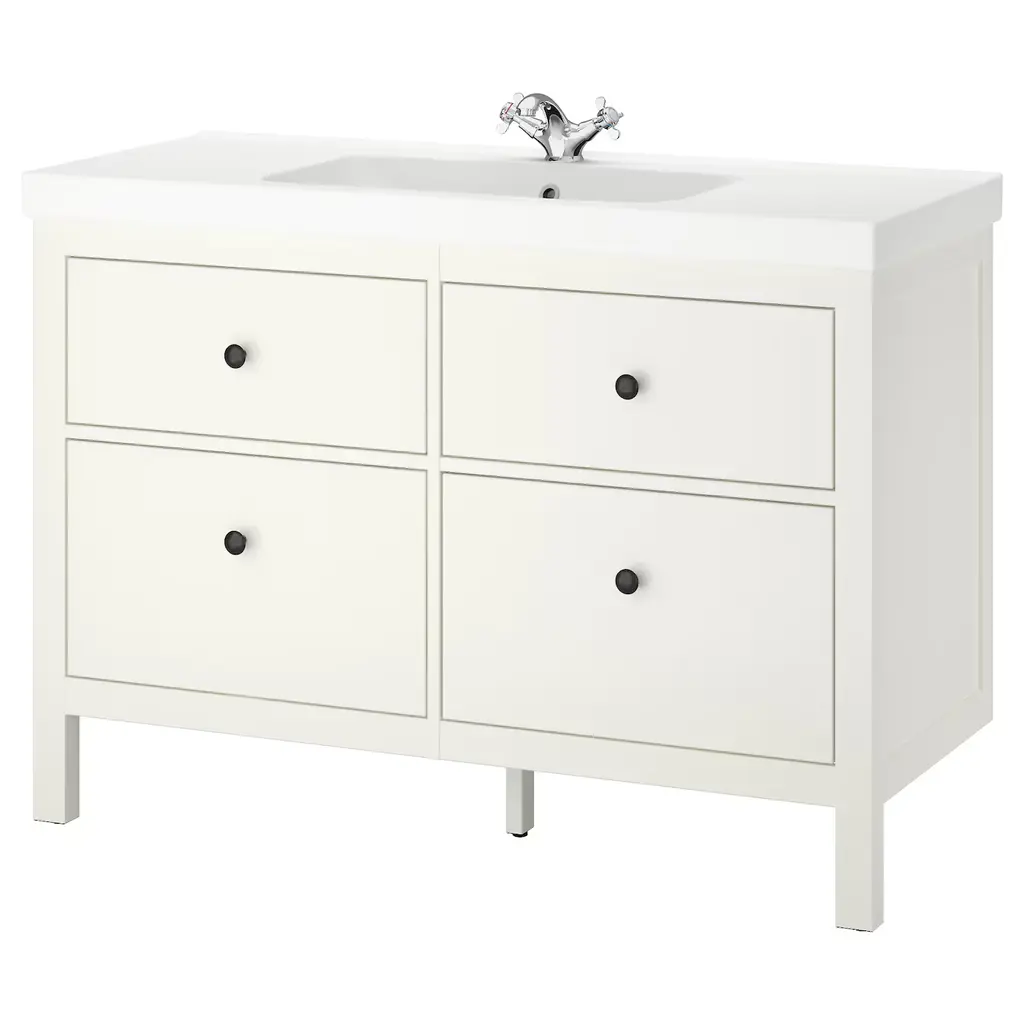 HEMNES / ORRSJÖN Bathroom vanity with sink & faucets - white 49x21 3/4x34 7/8 ". Smooth-running and soft-closing drawers with pull-out stop. You can easily see and reach your things because the drawers pull out fully. Unique water trap design gives room for a full sized drawer. Knobs included.