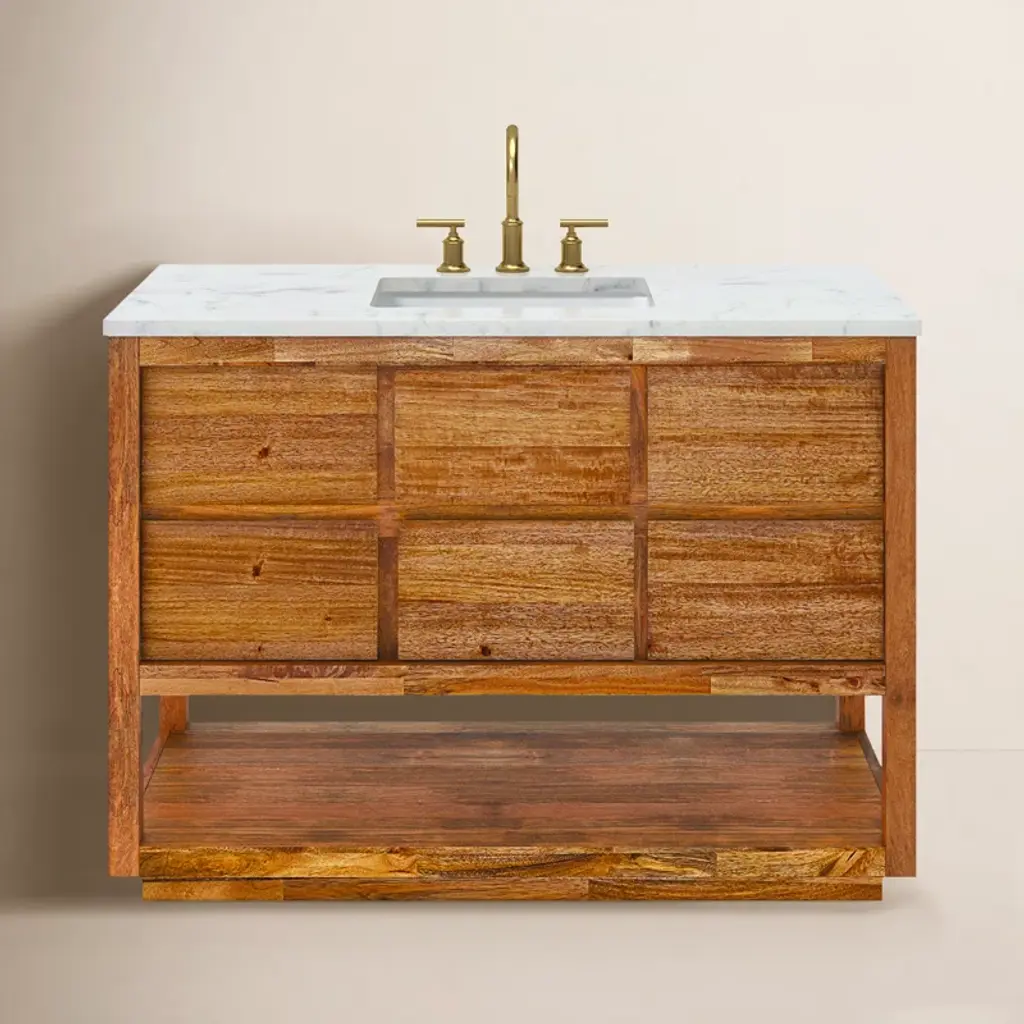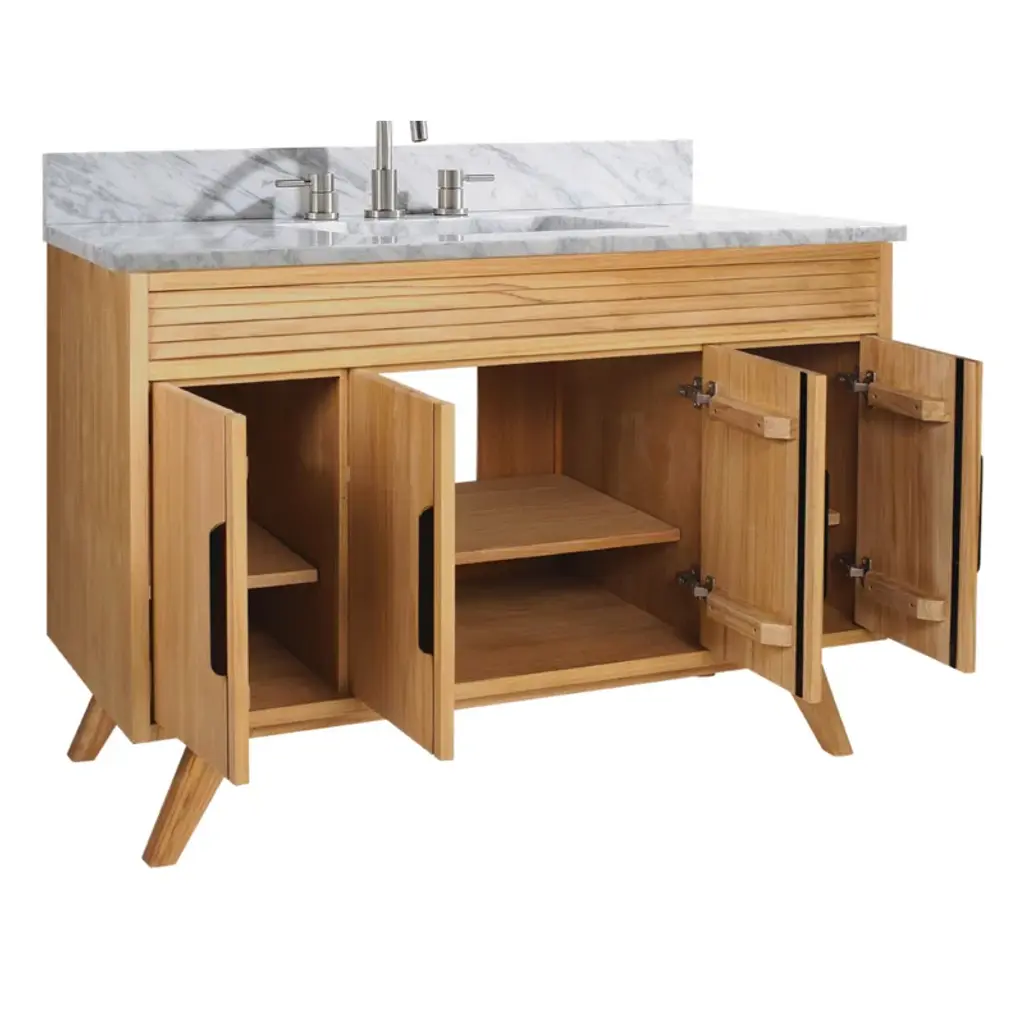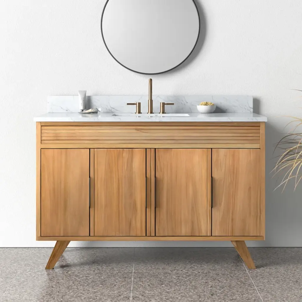 The Vail 49-inch vanity ensemble boasts a stunning teak finish and crisp, geometric lines that capture the eye without overpowering your décor. A slatted apron and mid-century splayed legs create a sense of timeless elegance with a hint of rustic charm. A pristine Carrara white marble top, soft-close hardware and ample storage space speak to the quality and value of this vanity. Pair it with the matching mirror to complete the look of luxury.