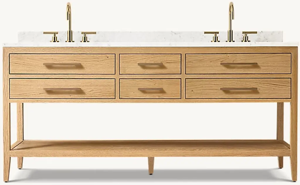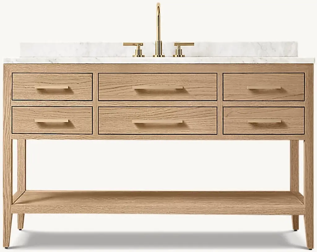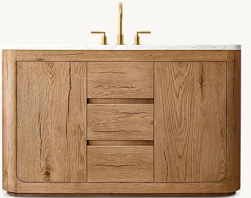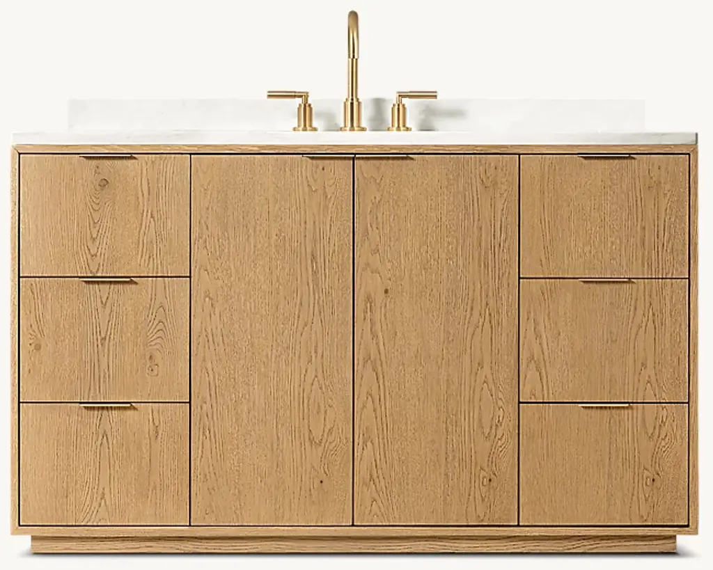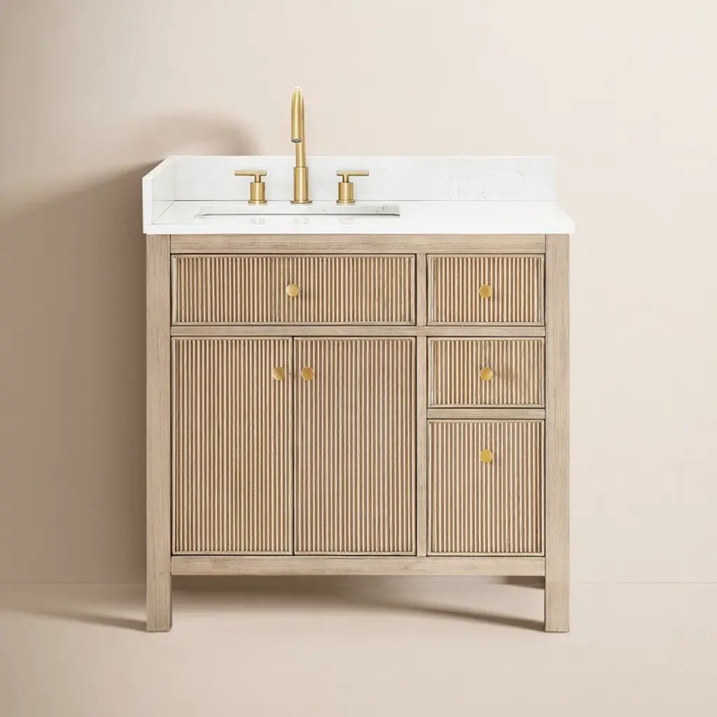 The cathedral grain white oak veneers and modern panel detailing on the doors and return panels give the Hudson collection by James Martin Vanities the look of fine furnishings that are unexpected yet welcome for the bathroom space. The 36" vanity features one set of doors that offers a convenient dual power and USB outlet and ample storage. The bottom drawer, with its removable bamboo storage organizer tray, allows for optimum organization. A classic, crisp 3 CM top comes with an under-mount sink that perfectly complements the finish.