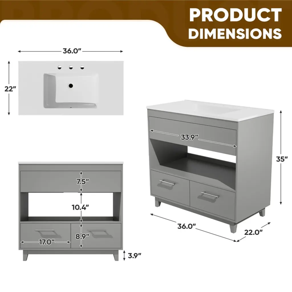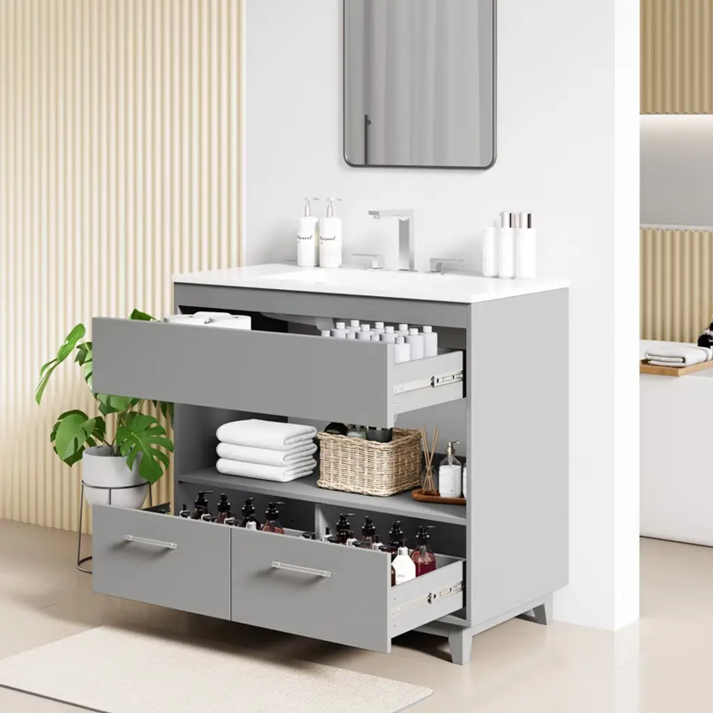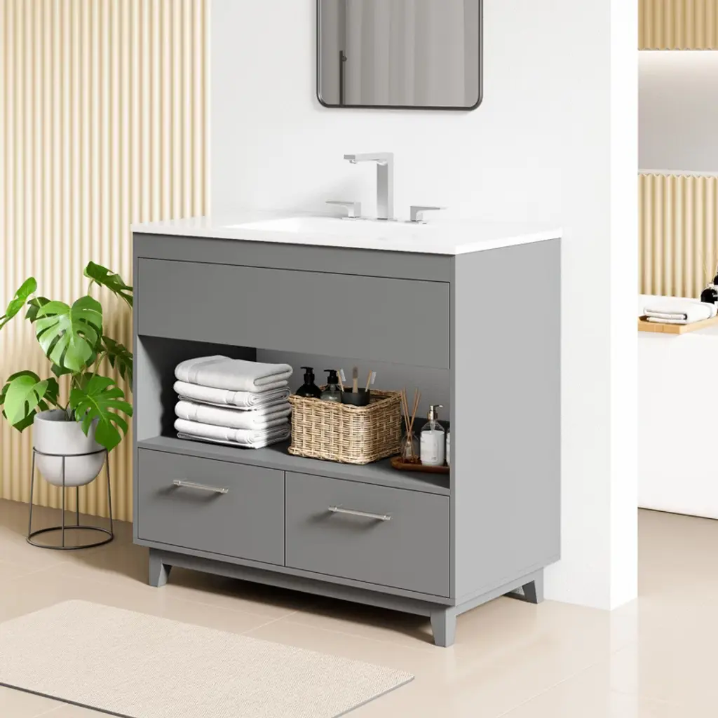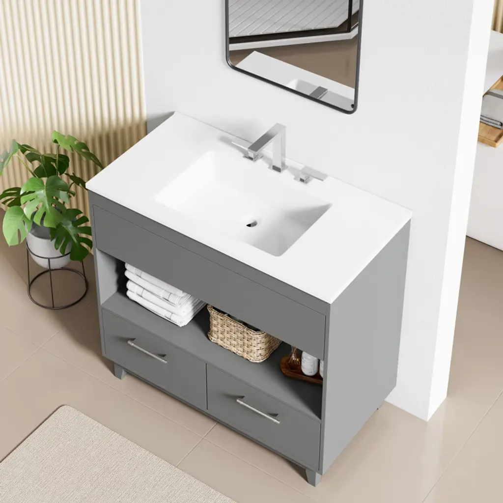 Upgrade your bathroom with our Modern Bathroom Vanity, designed to combine style and functionality. Featuring a large drawer and a smaller drawer, this vanity offers ample storage space to keep your bathroom clutter-free and organized. The sleek, contemporary design fits perfectly in any modern bathroom, enhancing the overall aesthetic. Crafted from durable, moisture-resistant materials, this vanity is built to withstand daily use while maintaining its elegant appearance. The integrated sink adds a seamless, polished touch, while the faucet is sold separately, giving you the freedom to select the perfect fixture to match your personal taste. Whether you’re renovating or simply upgrading your space, this bathroom vanity is the perfect blend of practicality and style. Transform your bathroom today with this versatile and chic vanity!
