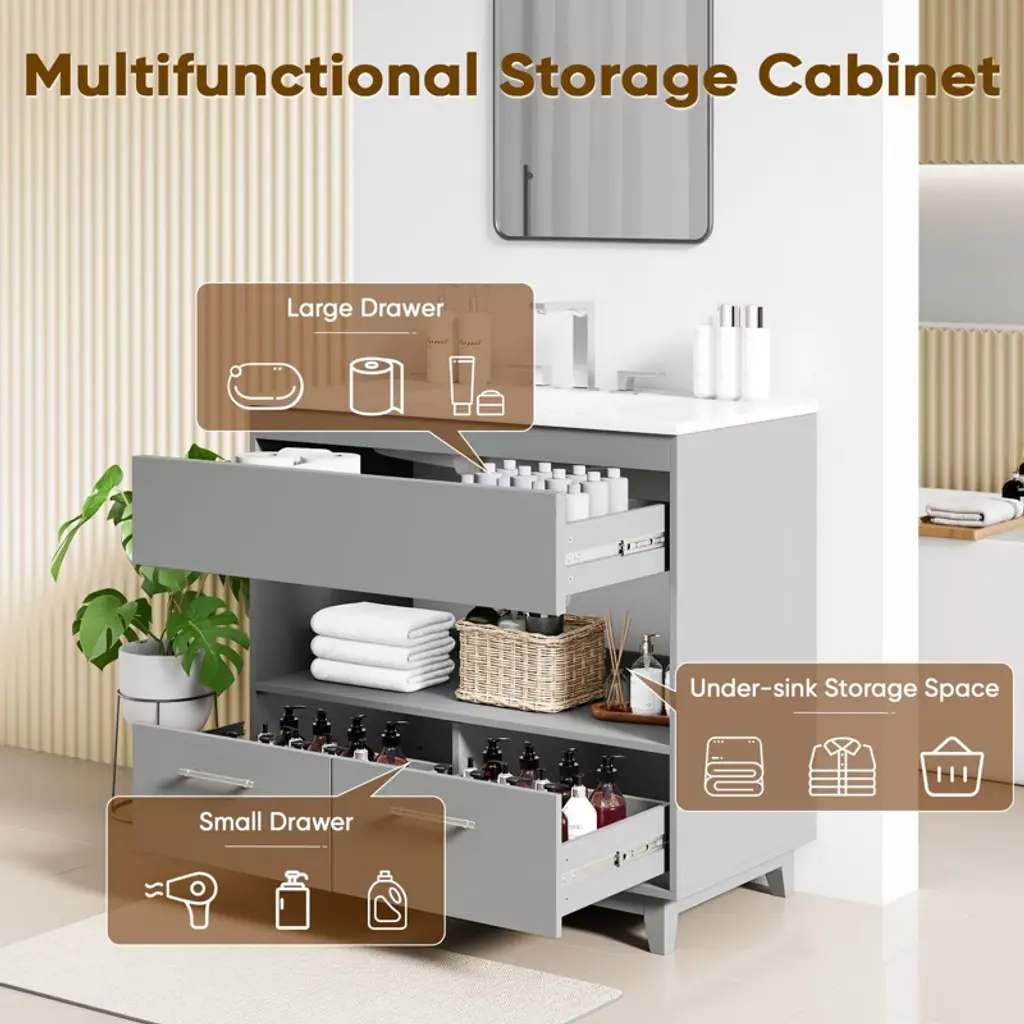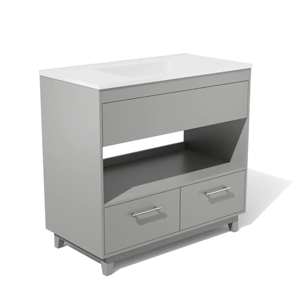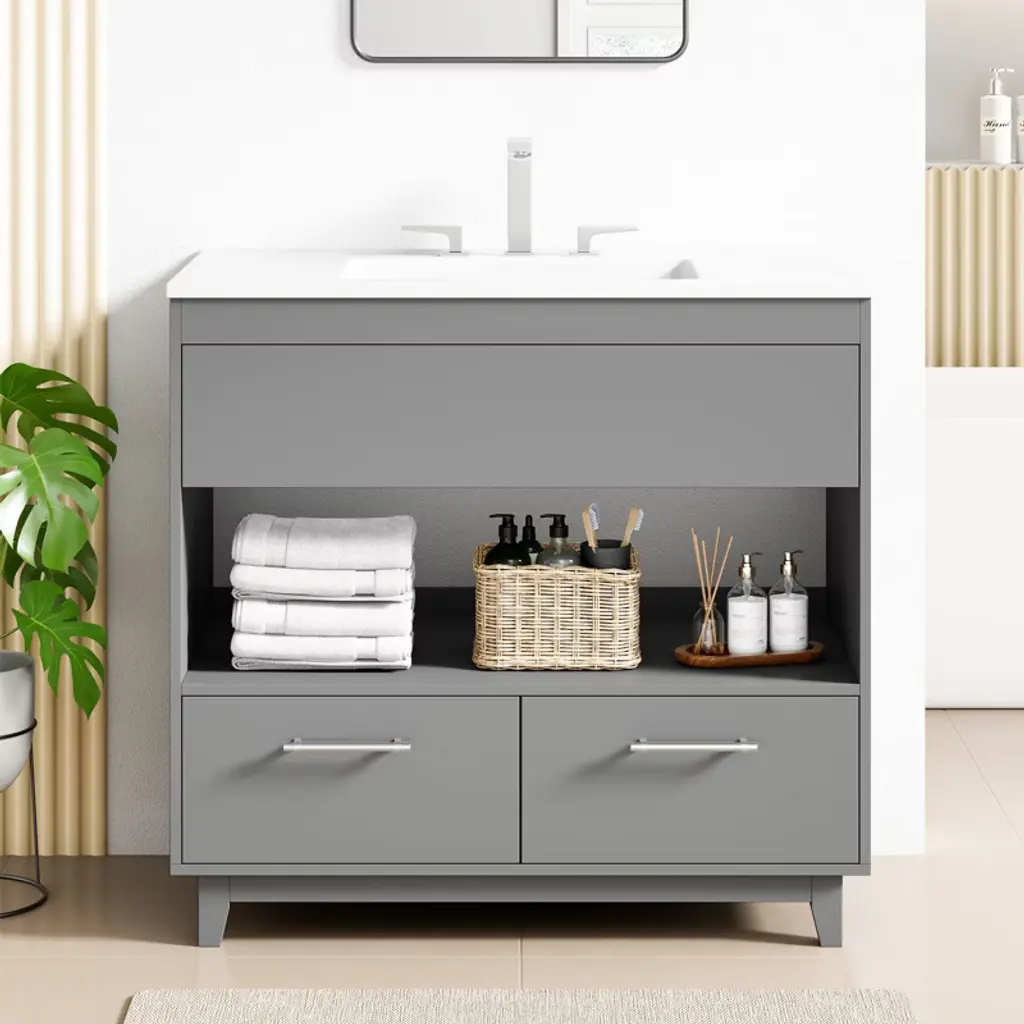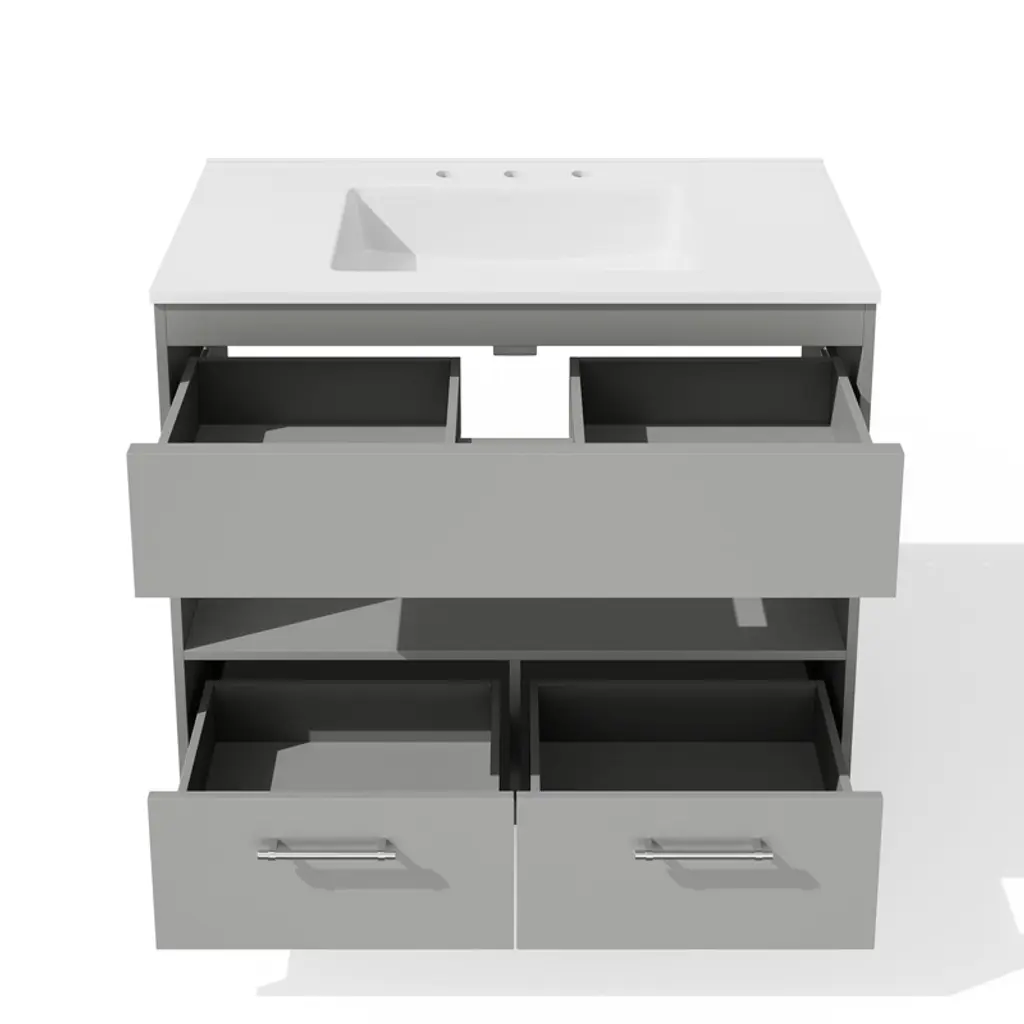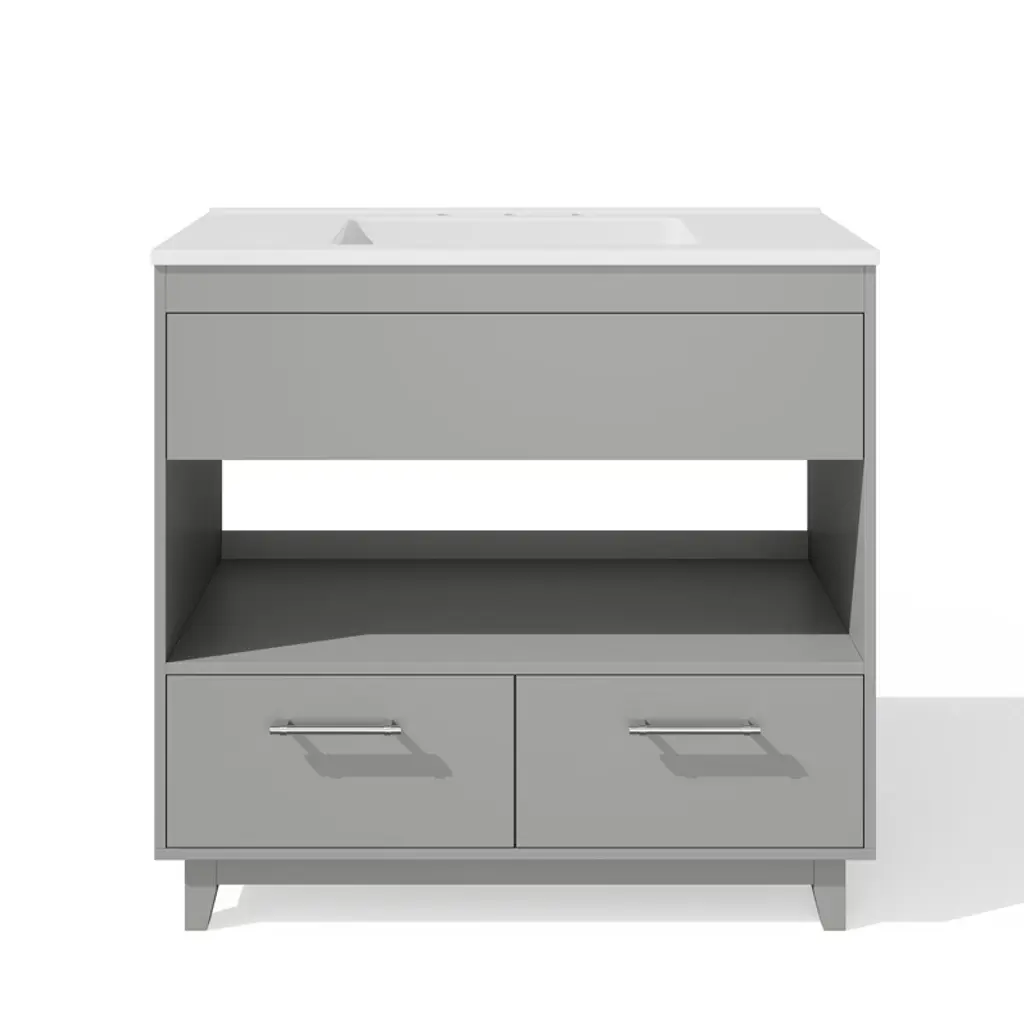 Upgrade your bathroom with our Modern Bathroom Vanity, designed to combine style and functionality. Featuring a large drawer and a smaller drawer, this vanity offers ample storage space to keep your bathroom clutter-free and organized. The sleek, contemporary design fits perfectly in any modern bathroom, enhancing the overall aesthetic. Crafted from durable, moisture-resistant materials, this vanity is built to withstand daily use while maintaining its elegant appearance. The integrated sink adds a seamless, polished touch, while the faucet is sold separately, giving you the freedom to select the perfect fixture to match your personal taste. Whether you’re renovating or simply upgrading your space, this bathroom vanity is the perfect blend of practicality and style. Transform your bathroom today with this versatile and chic vanity!