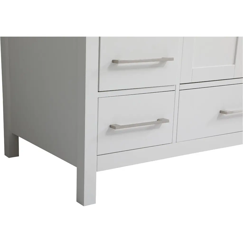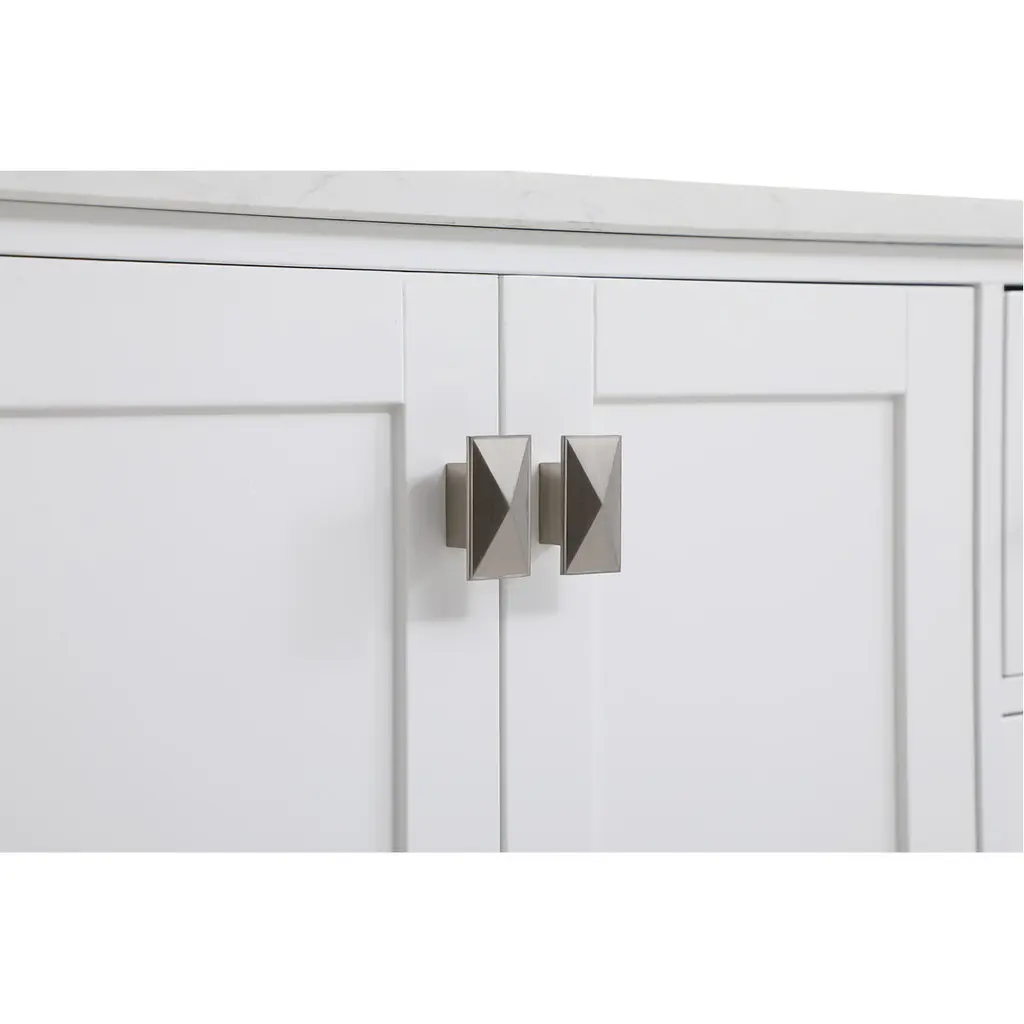 Never compromise beauty--the Irene collection stunning vanity in a white finish will add lovely sophistication and complement any bathroom or powder room, while utilizing its charm and function to provide you with ample storage spaces. Brushed nickel pulls gently adorn the minimalist cabinet doors and drawers at the base, allowing for you to store away your bathroom essentials. The Carrara white marble countertop, porcelain undermount sink, dignified subtle engravings on the side edges, and squared legs all come together to create contemporary beauty. Work with your space, and design a beautiful room, no matter the size.