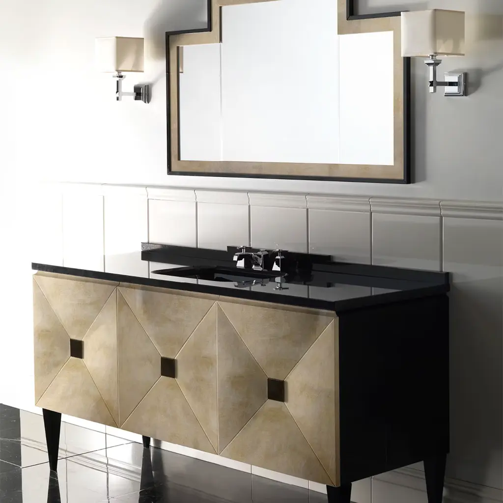 The design evokes the sophisticated atmospheres and the Deco taste of American design in the 40s. It features geometric lines, a black lacquered wood structure, and contrasting marble or granite tops. The doors come in various lacquered colors or an antiqued aluminum leaf finish. Different finishes are available upon request. Please, contact the Concierge service for further information. Faucets are not included.